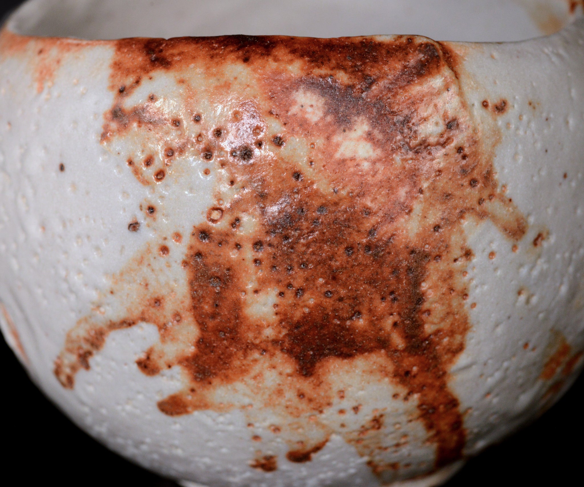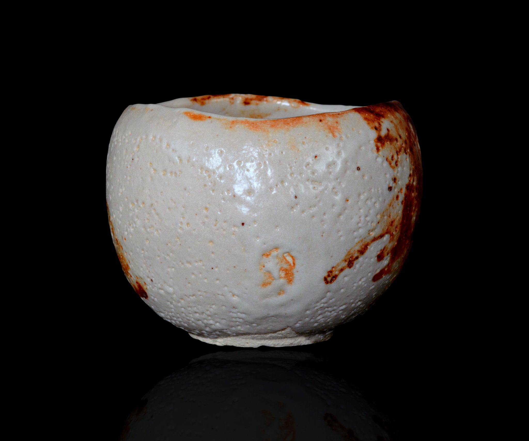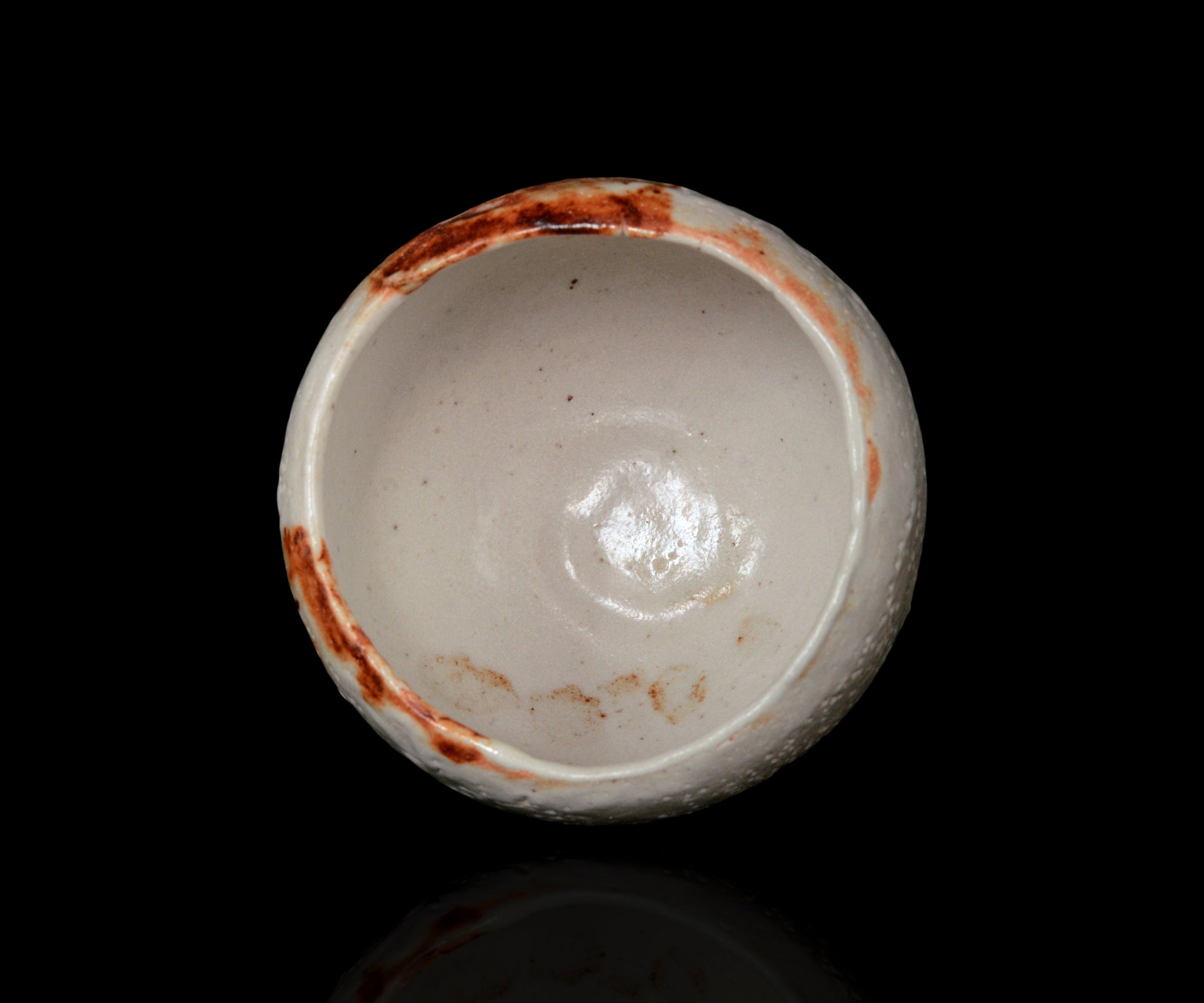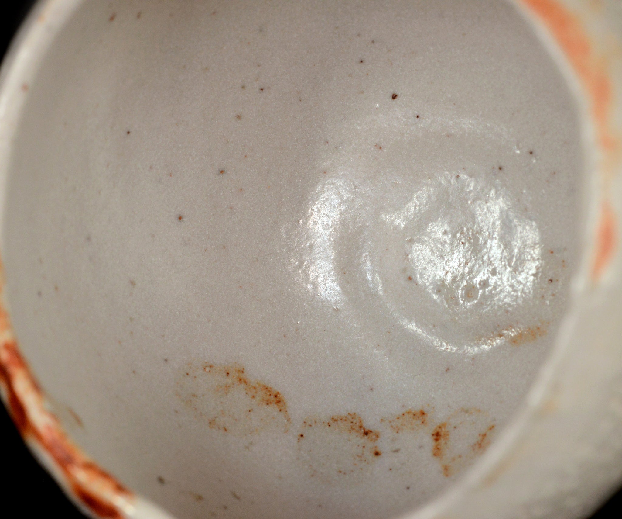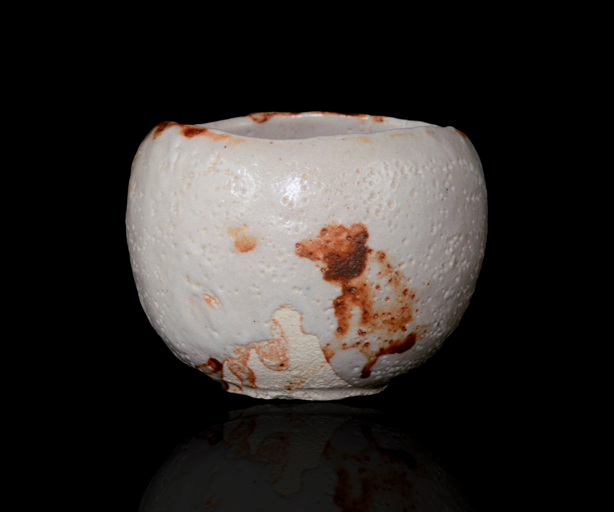 真っ白な志野の肌の上を、正面にはまるで馬が駆け巡ったかのように、激しく躍動する鉄絵が走り、鮮烈なコントラストを生み出しています。艶を帯びた丸みのあるぽってりとした造形は光を柔らかく吸い込み、志野ならではの静かな存在感を際立たせています。茶盌を回していくと、正面とは表情を変え、今度はまるで腰を休めた熊を思わせるような緋色の景色が現れます。見込みにはさりげなく残された指跡が景色となり、使い手の視線を自然と内へと導きます。高台は柔らかな土味が素直に現れ、手に取ったときの温もりと、素材の確かさを感じさせてくれます。堂々たる力強さと志野特有のやさしさ、そして澄み切った白の魅力が一体となった、志野の魅力が凝縮された作品です。