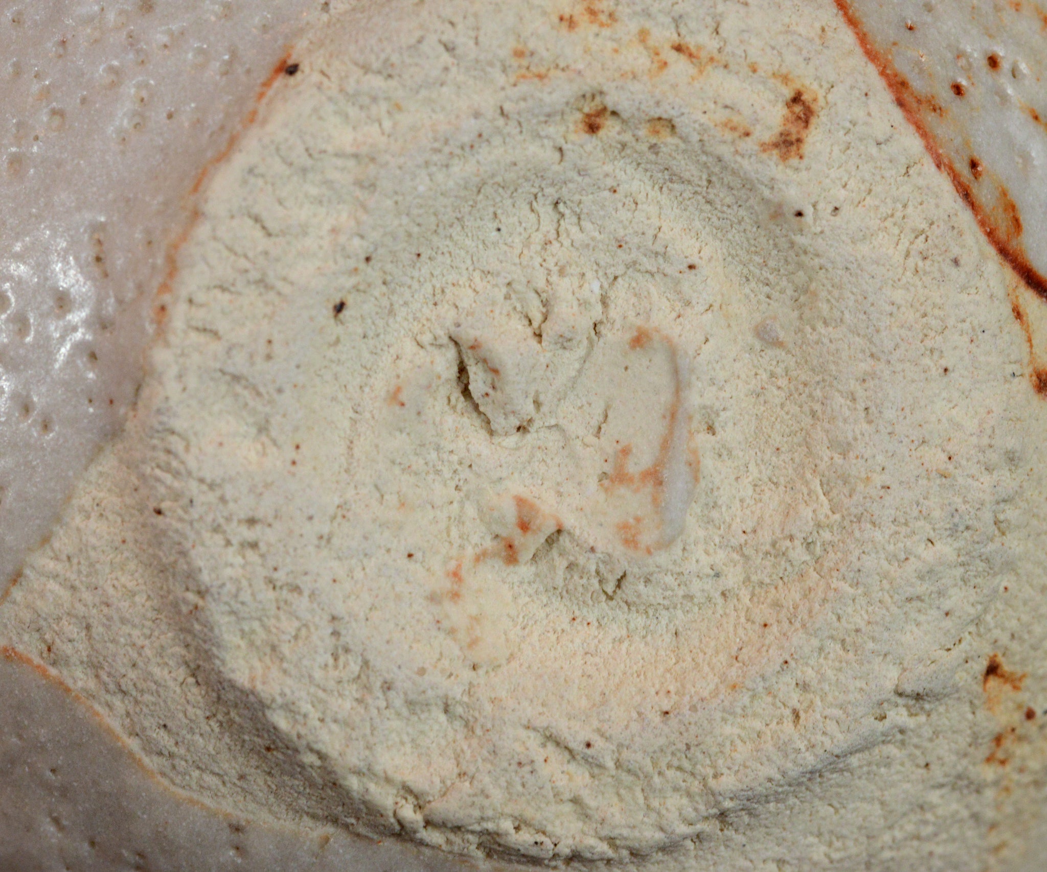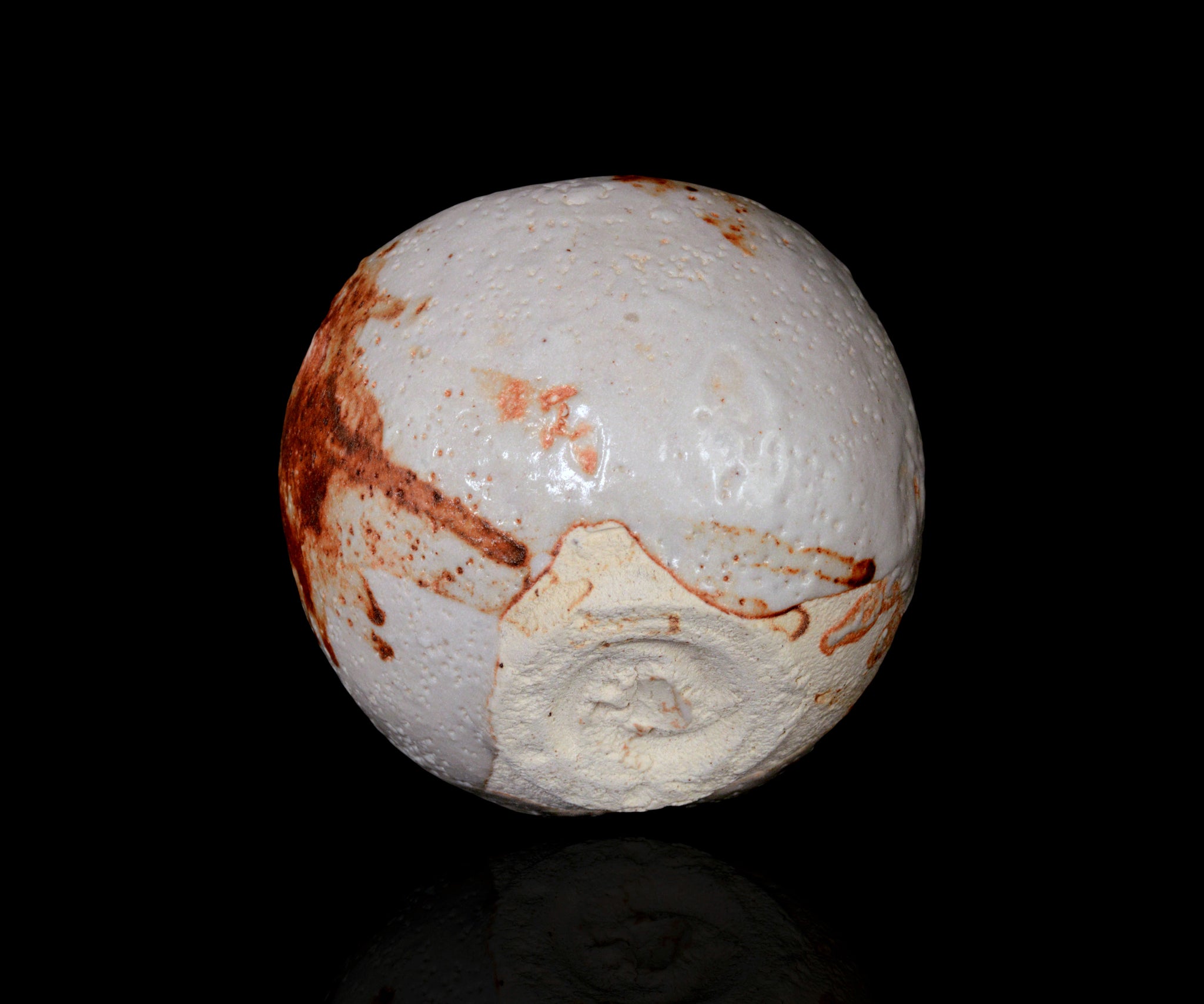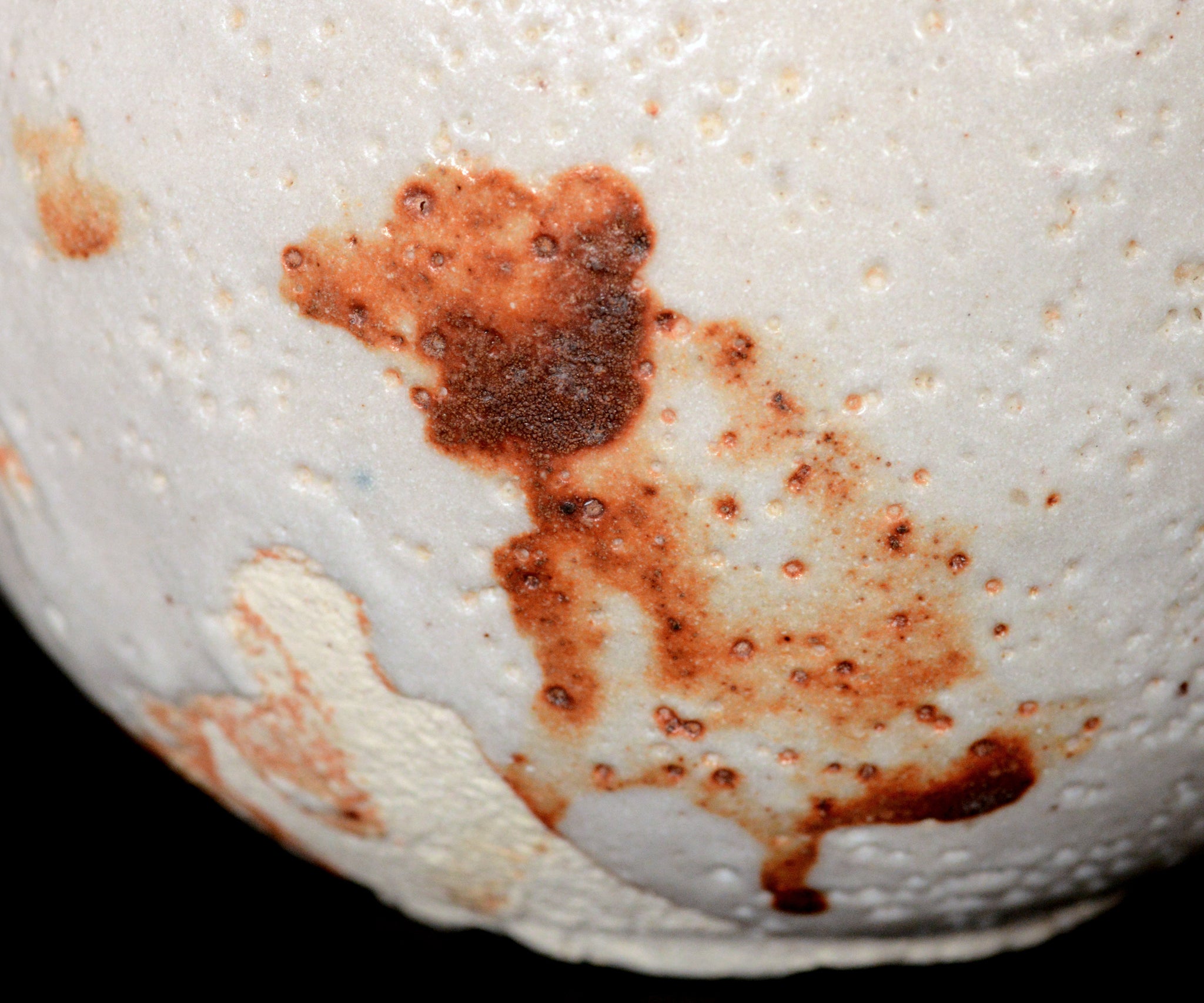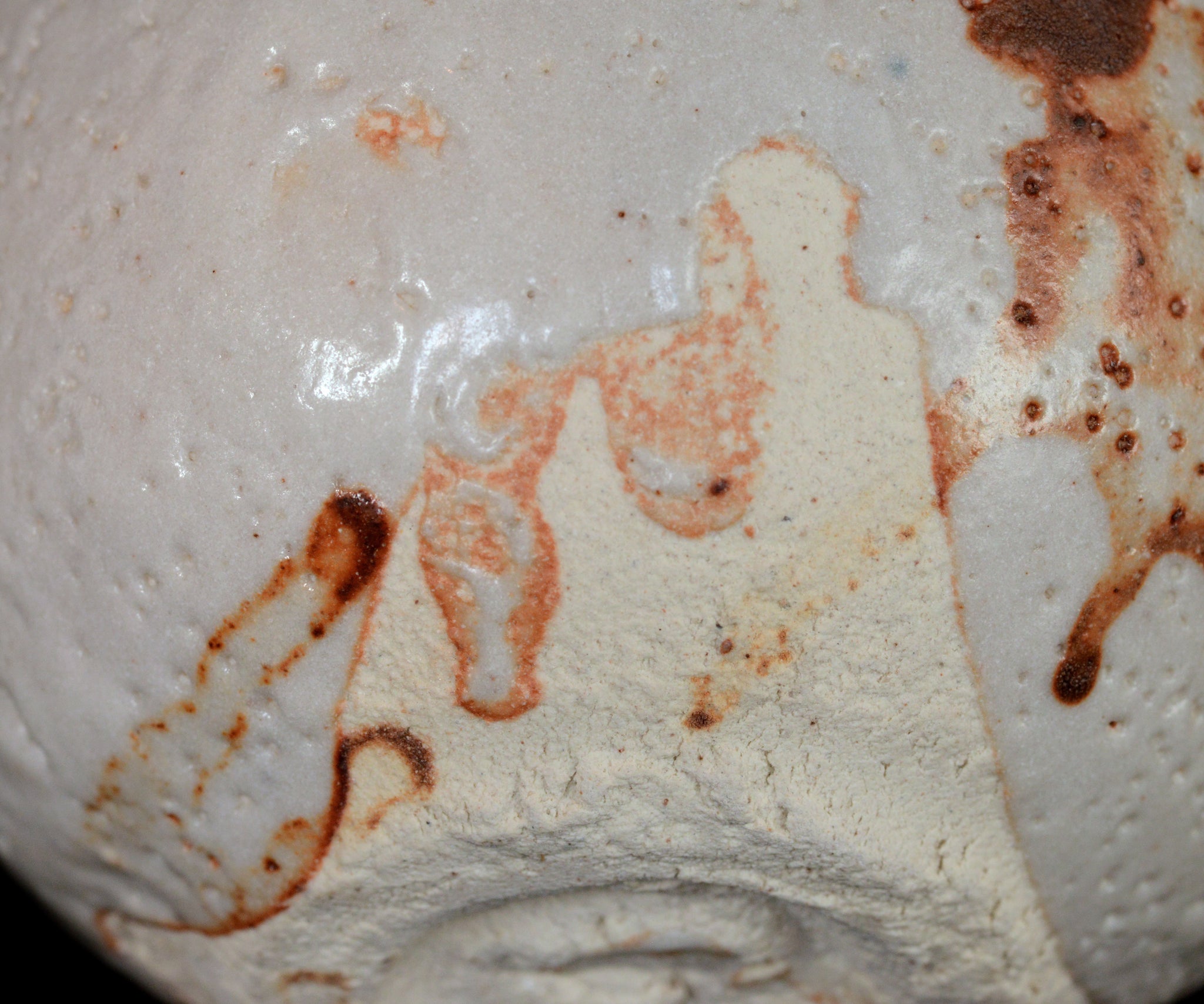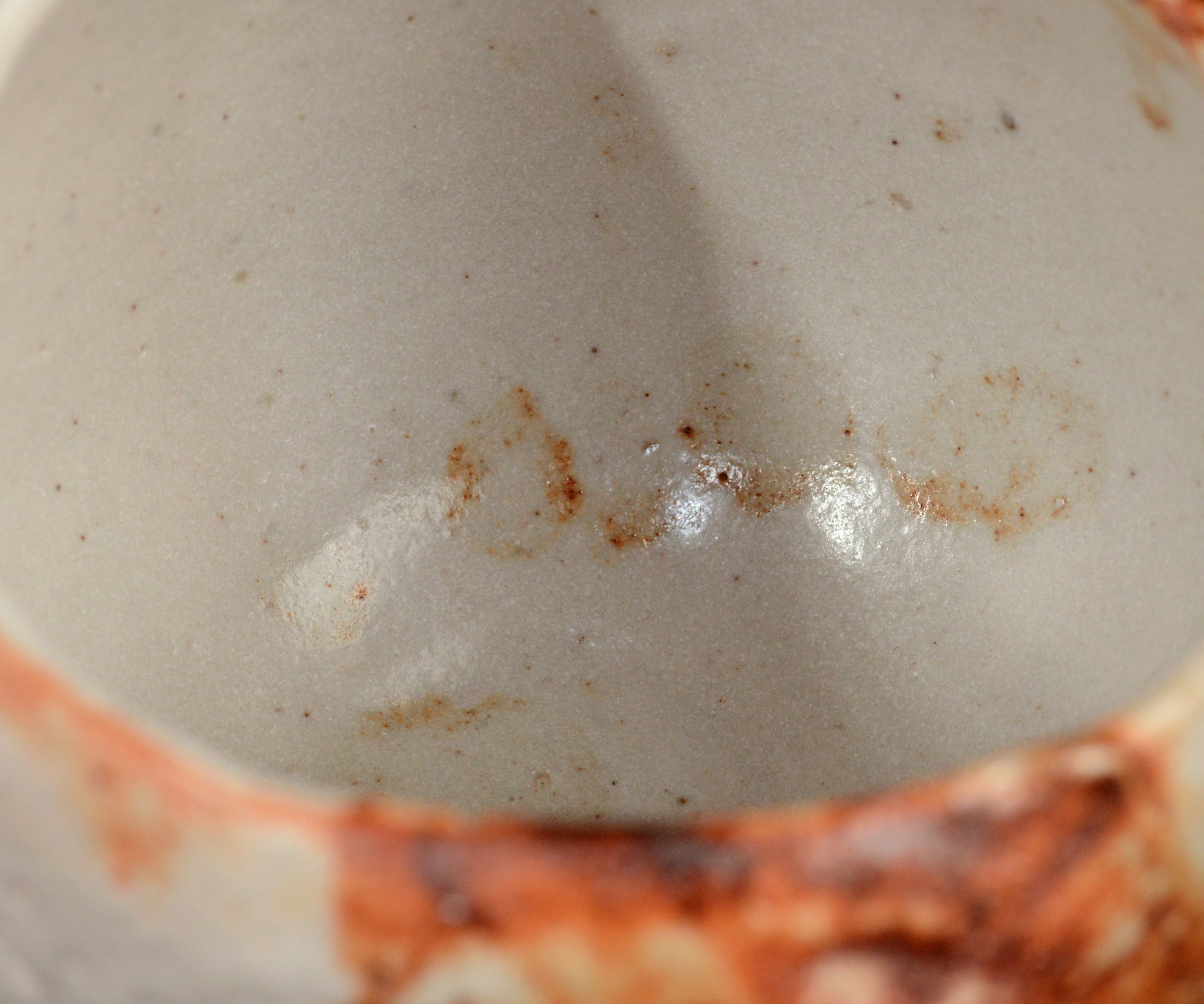真っ白な志野の肌の上を、正面にはまるで馬が駆け巡ったかのように、激しく躍動する鉄絵が走り、鮮烈なコントラストを生み出しています。艶を帯びた丸みのあるぽってりとした造形は光を柔らかく吸い込み、志野ならではの静かな存在感を際立たせています。茶盌を回していくと、正面とは表情を変え、今度はまるで腰を休めた熊を思わせるような緋色の景色が現れます。見込みにはさりげなく残された指跡が景色となり、使い手の視線を自然と内へと導きます。高台は柔らかな土味が素直に現れ、手に取ったときの温もりと、素材の確かさを感じさせてくれます。堂々たる力強さと志野特有のやさしさ、そして澄み切った白の魅力が一体となった、志野の魅力が凝縮された作品です。