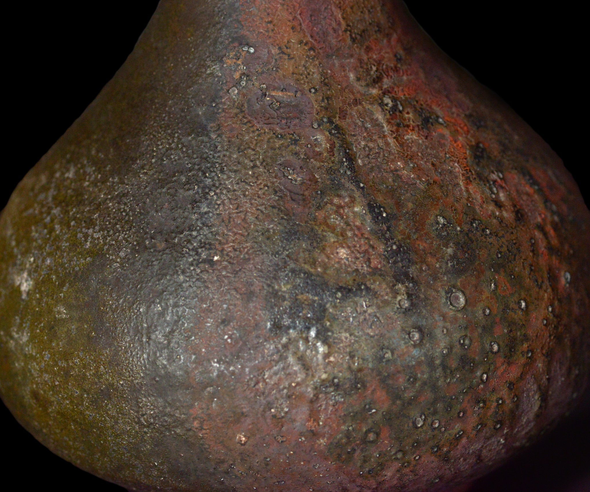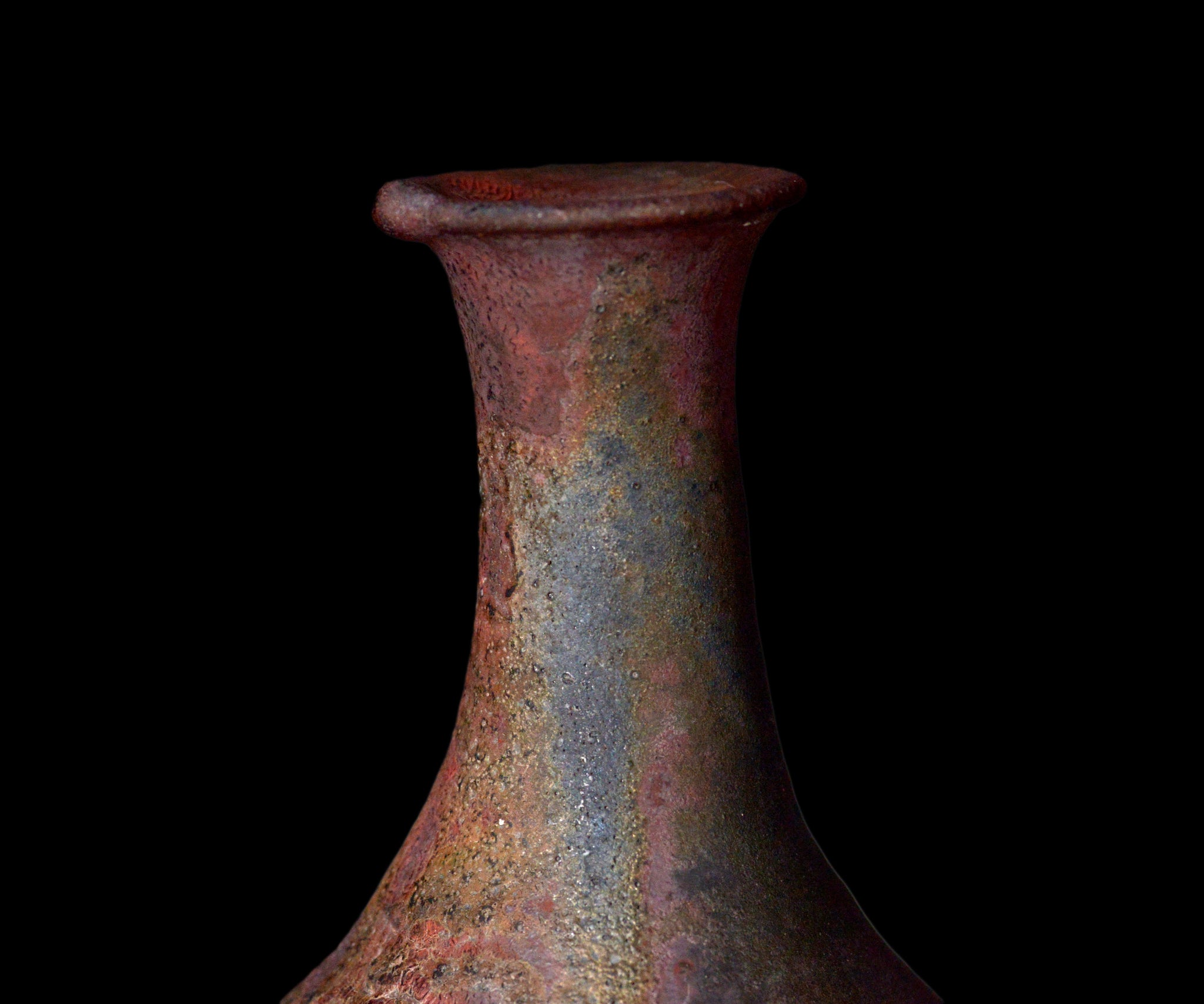 唐津の陶芸家・三藤るいさんによる黒唐津花入。引き落としによって生まれた赤を基調とした強い窯変と縮れを伴うワイルドな肌合いが、力強い存在感を放つ作品です。輪積みで成形された首元はわずかに歪みを含み、炎と手仕事の痕跡をそのまま景色として刻み込んでいます。静かな佇まいの中に、荒々しさと緊張感が共存する、表情豊かな花入です。