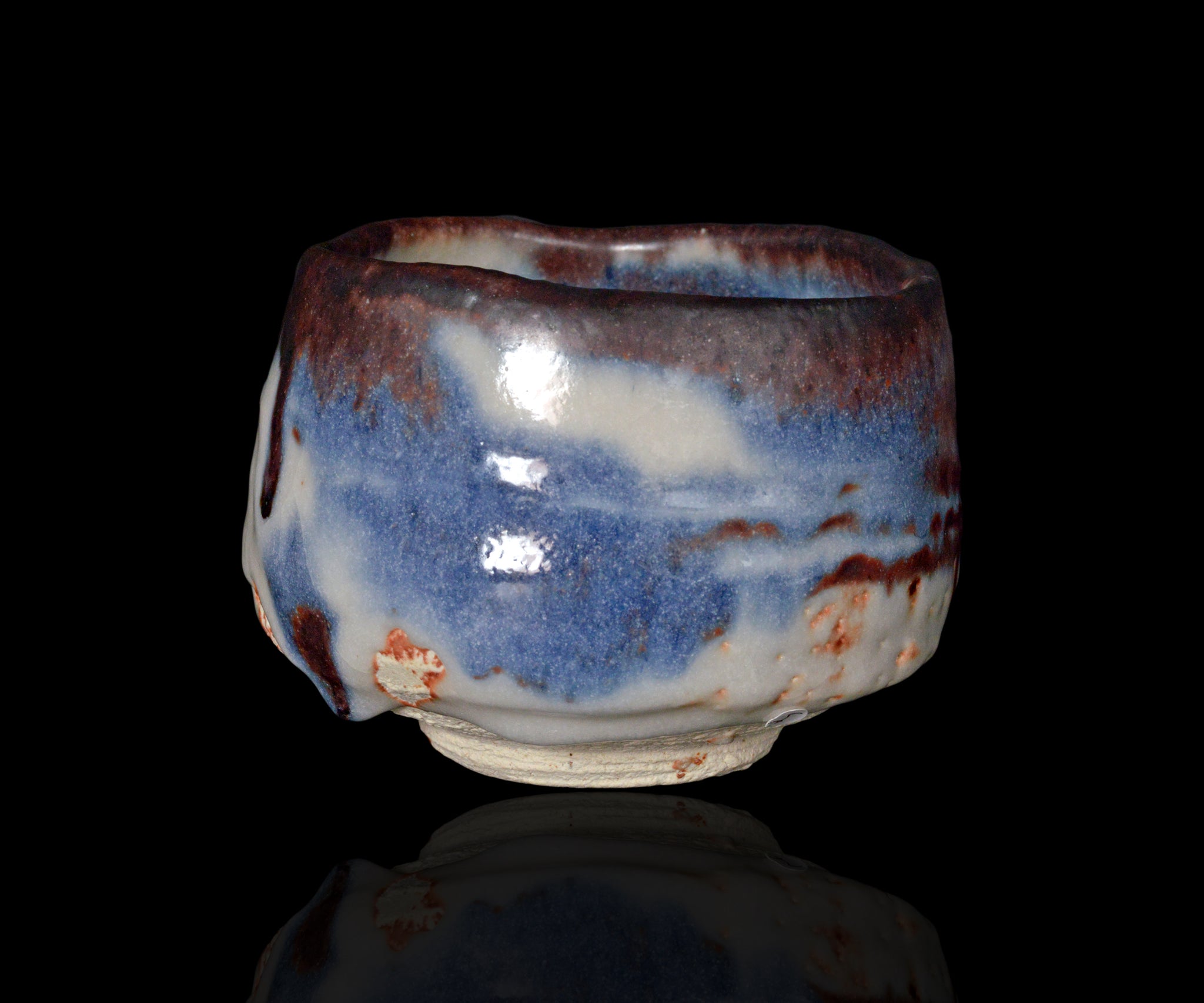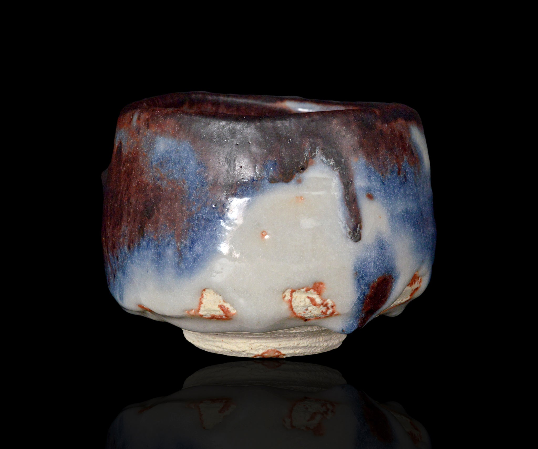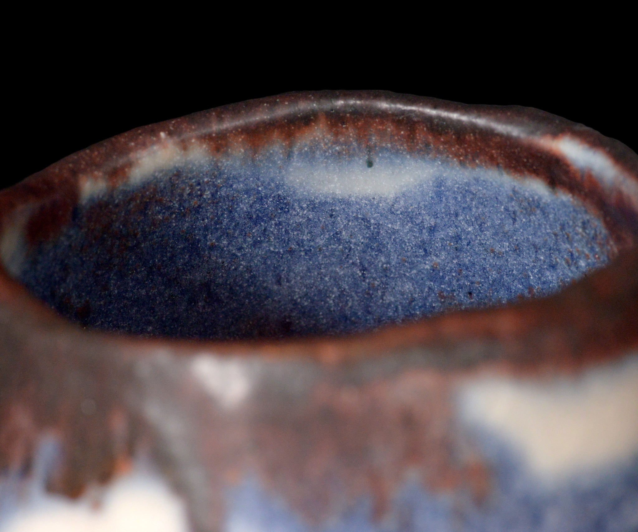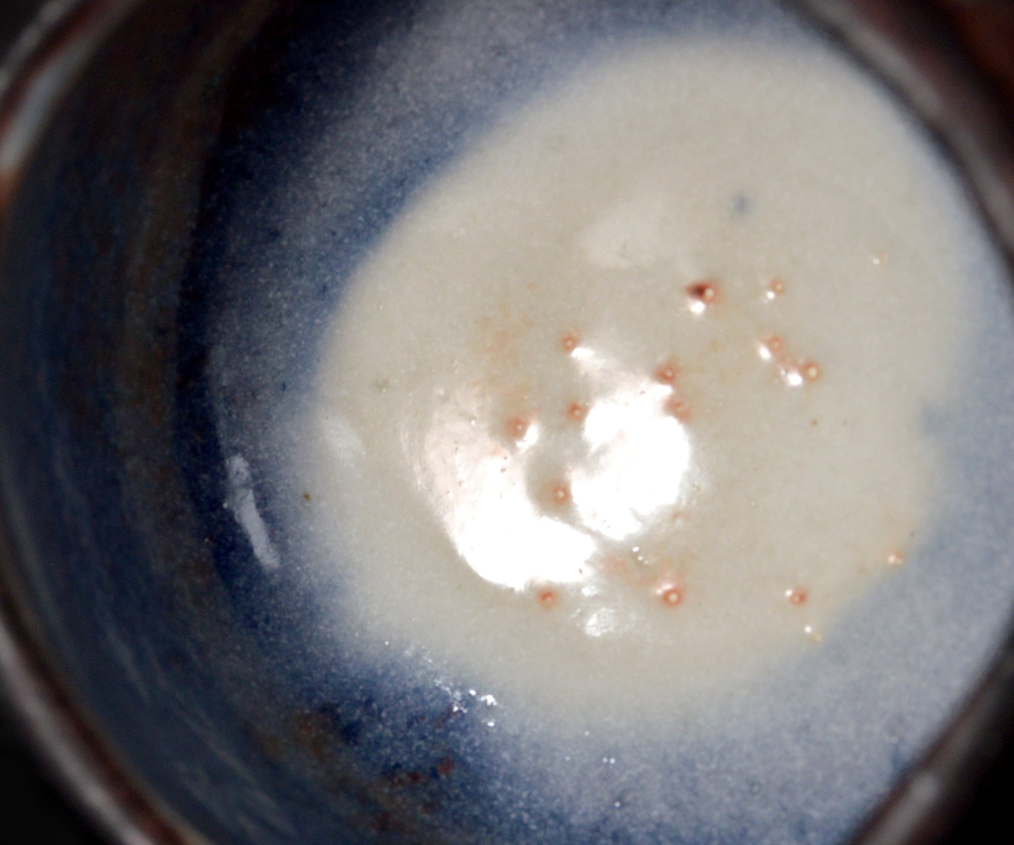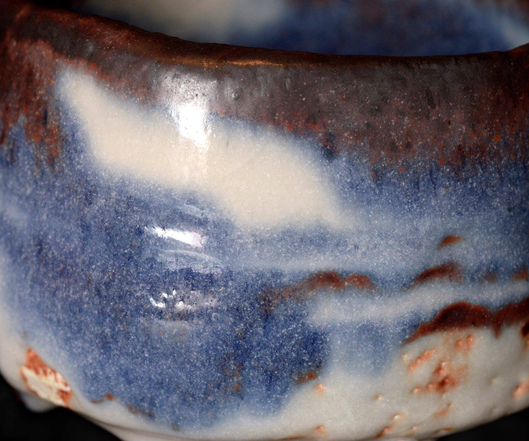 益子町の陶芸家、松崎幹さんの新作、蒼流志野茶盌。志野のぽってりとした白い肌を基調に、蒼の流れと赤褐色の焦げがバランスよく重なった作品。上部の焦げがしっかりと景色をつくり、そこから滲むように流れた蒼が白へと変化し、落ち着いた色調の中にも豊かな表情が感じられます。見込みは白い肌を囲むように蒼が現れており、お茶が入った後の景色も楽しめます。高台は素朴なもぐさ土の風合いが楽しめ、高台脇には指跡と