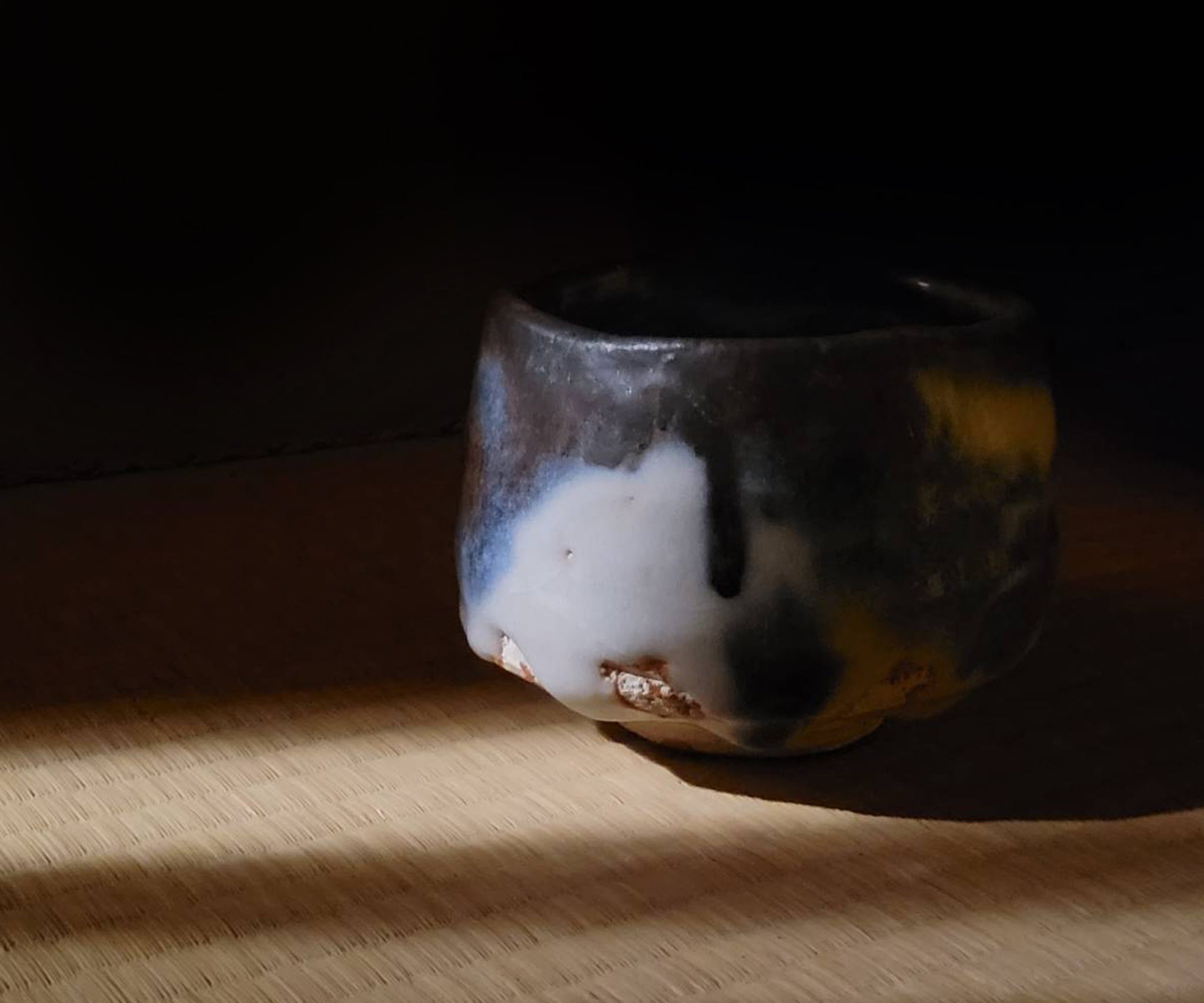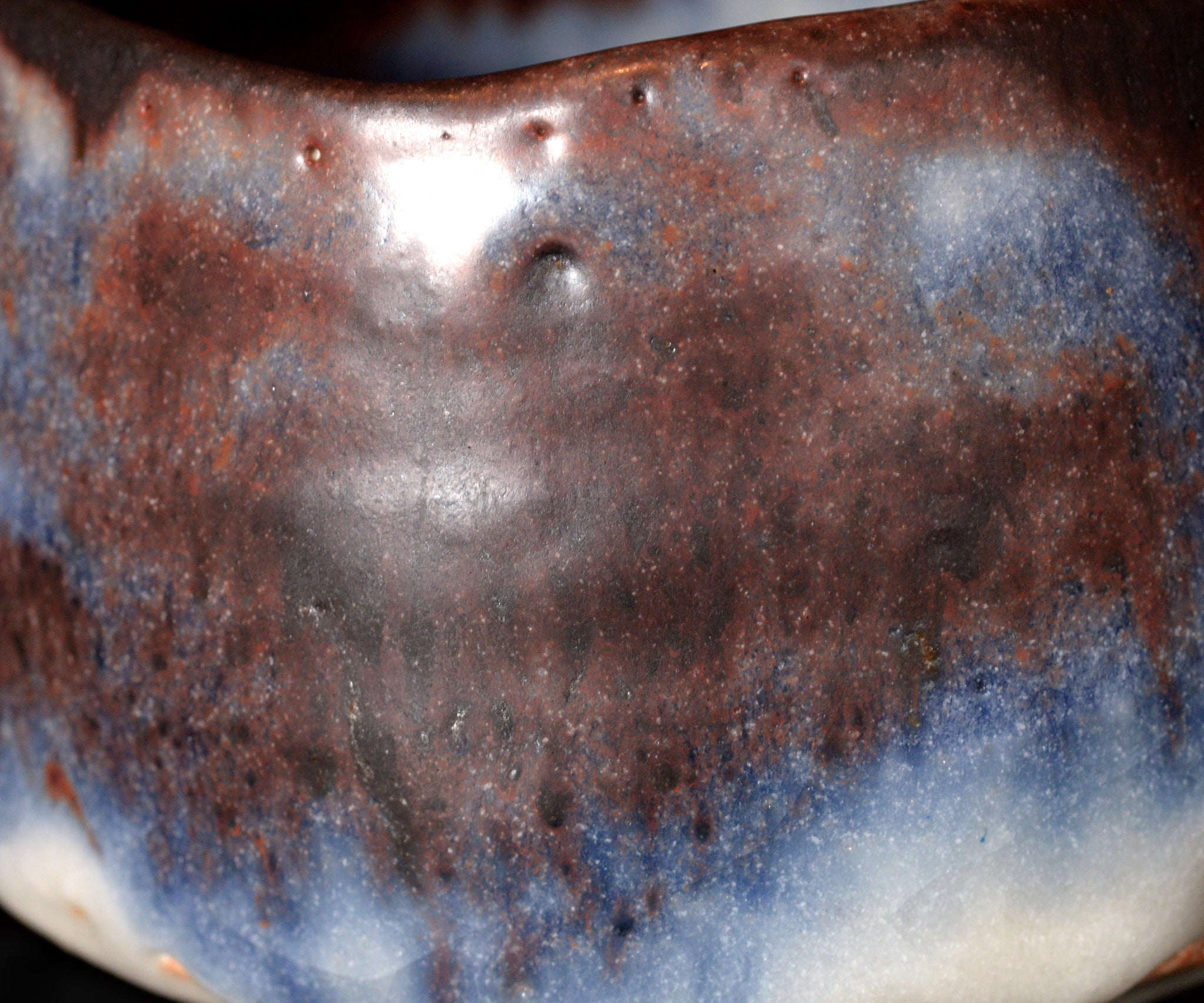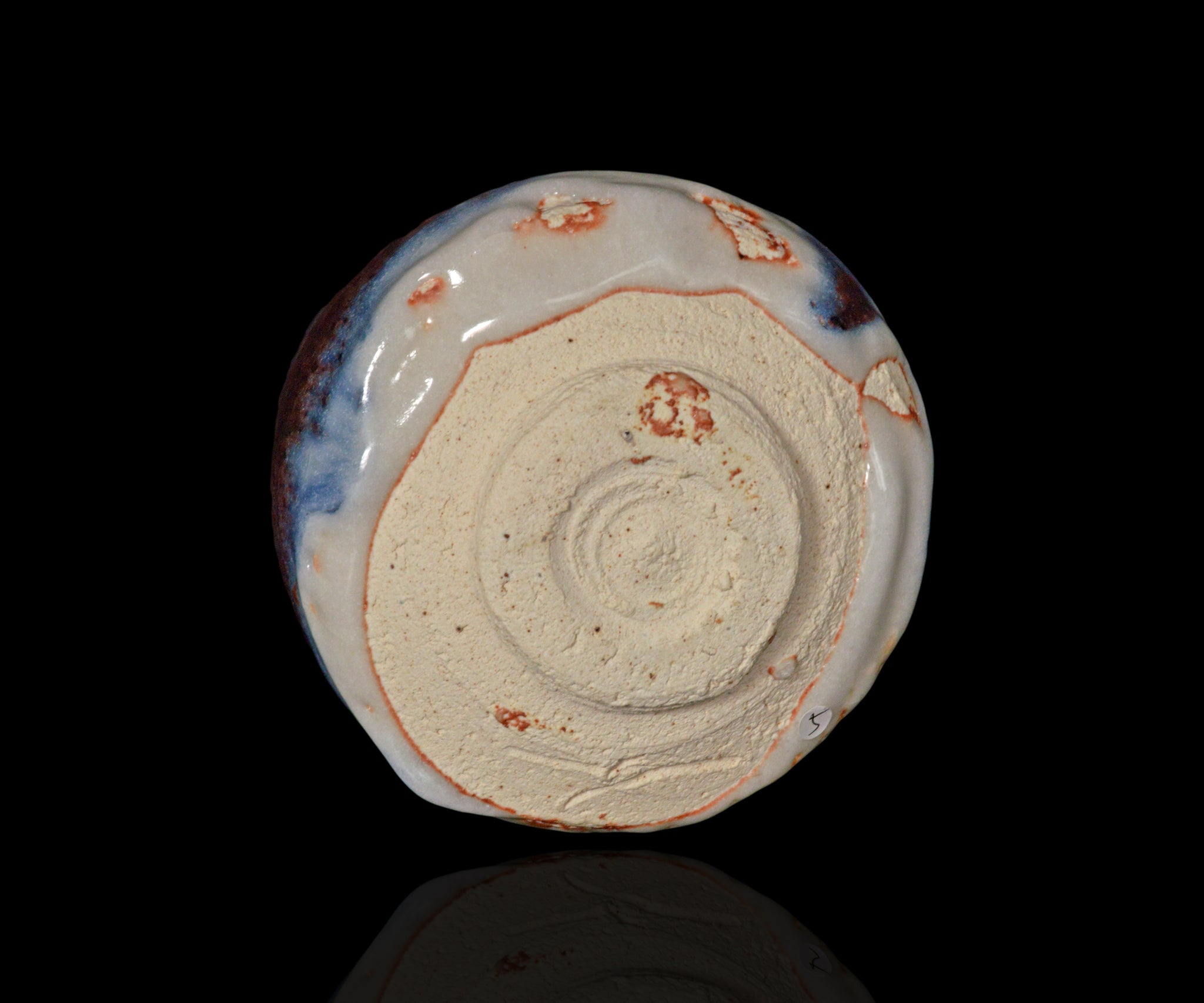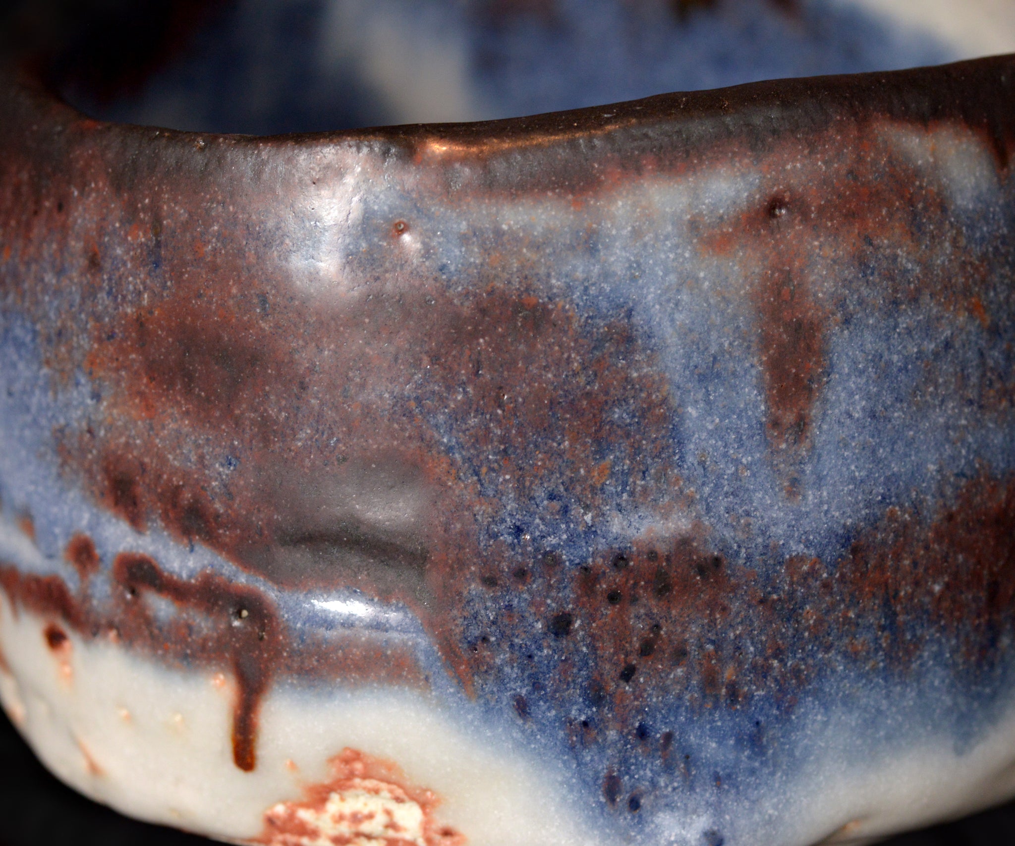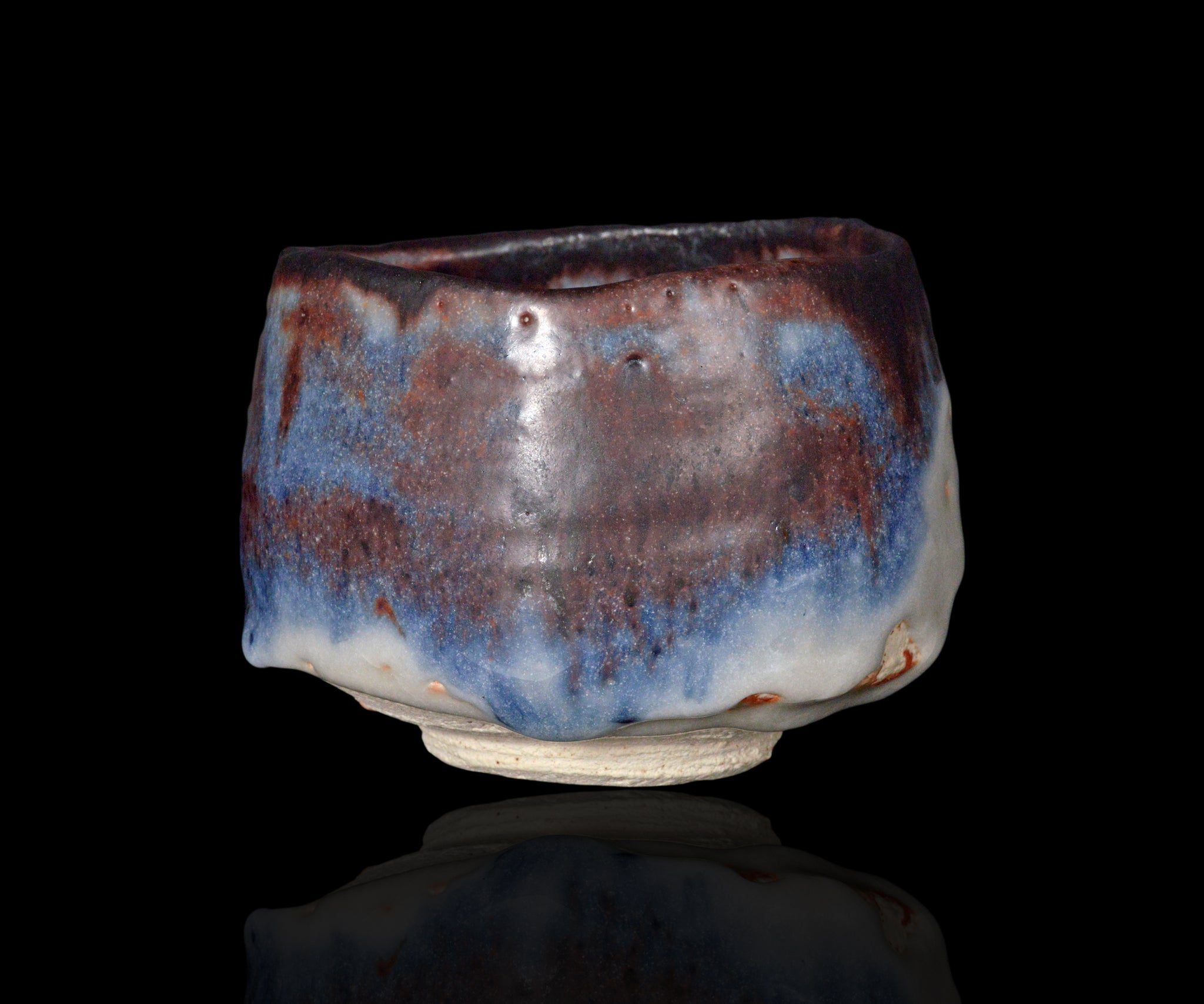 益子町の陶芸家、松崎幹さんの新作、蒼流志野茶盌。志野のぽってりとした白い肌を基調に、蒼の流れと赤褐色の焦げがバランスよく重なった作品。上部の焦げがしっかりと景色をつくり、そこから滲むように流れた蒼が白へと変化し、落ち着いた色調の中にも豊かな表情が感じられます。見込みは白い肌を囲むように蒼が現れており、お茶が入った後の景色も楽しめます。高台は素朴なもぐさ土の風合いが楽しめ、高台脇には指跡と