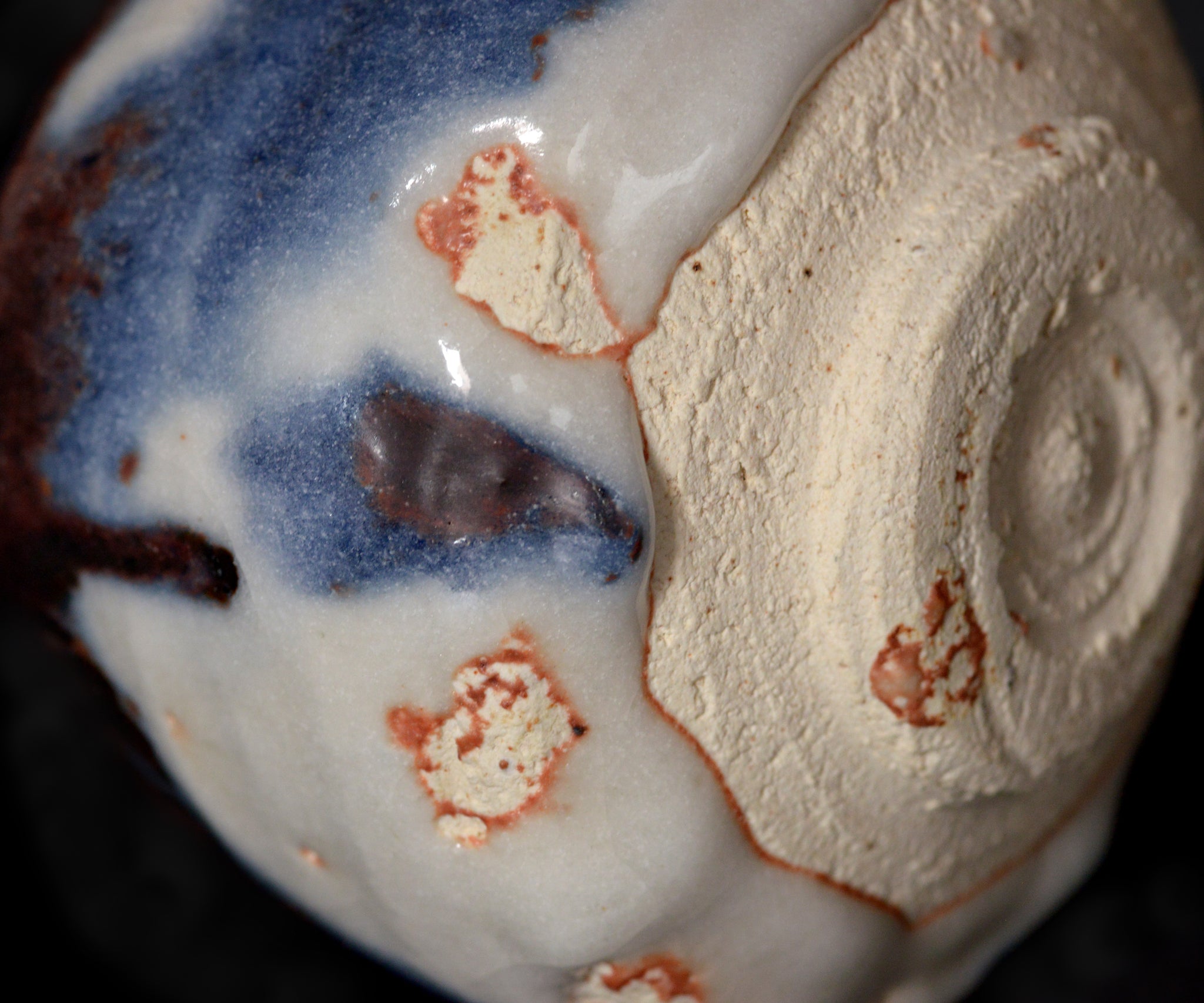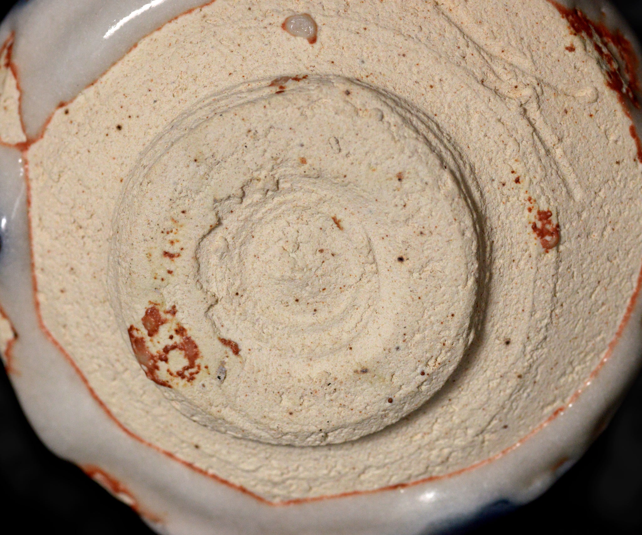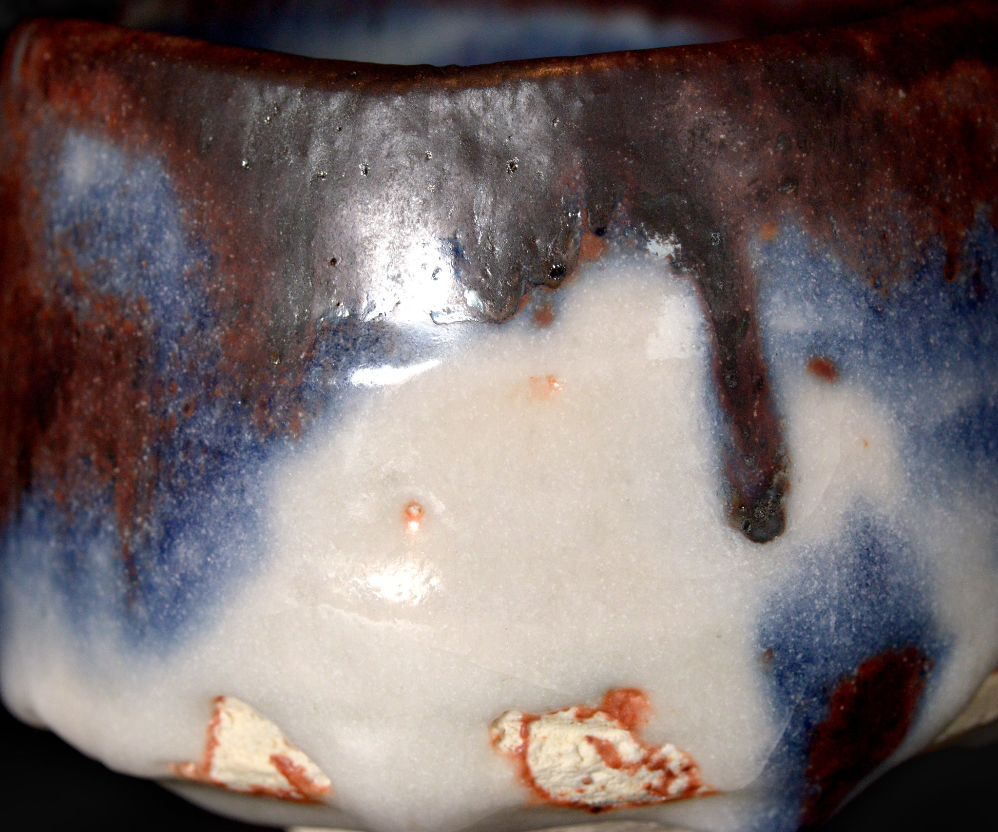 釉溜まりが景色を作ります。志野の穏やかな質感と蒼の清涼感が調和した、風格と落ち着きのある逸品です。