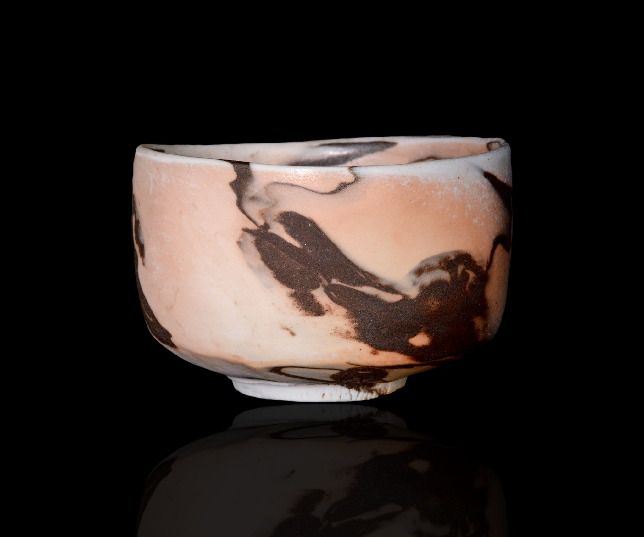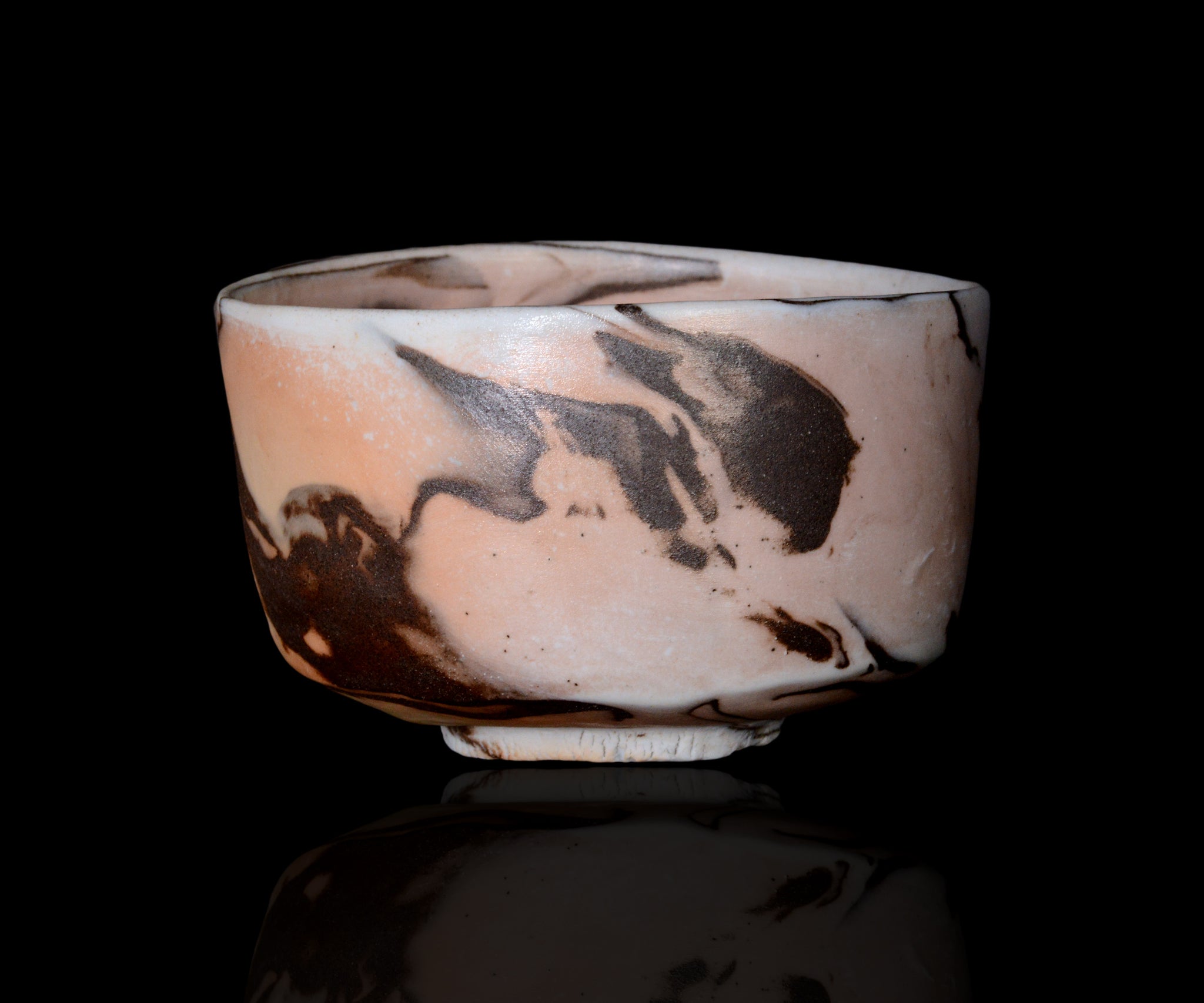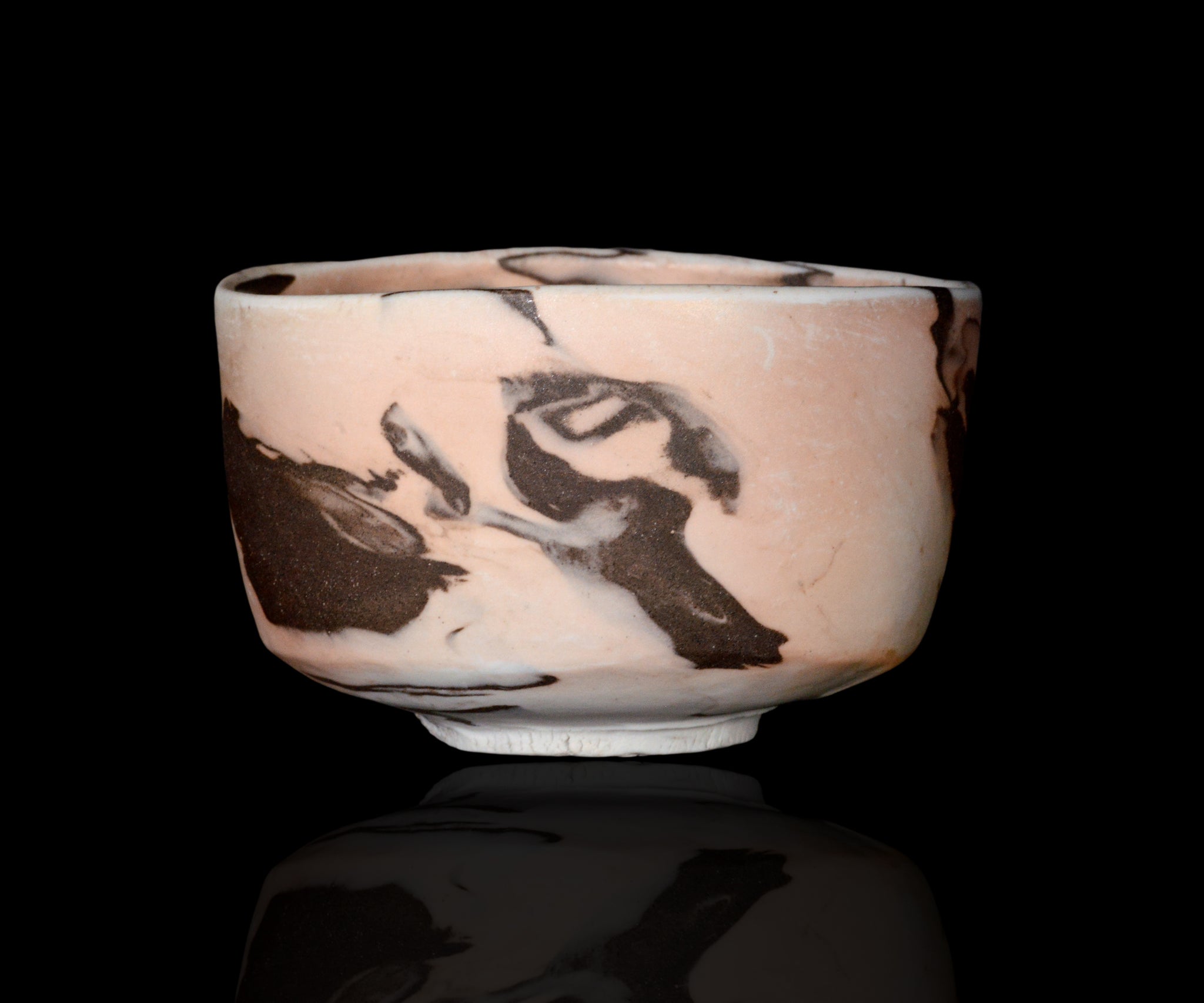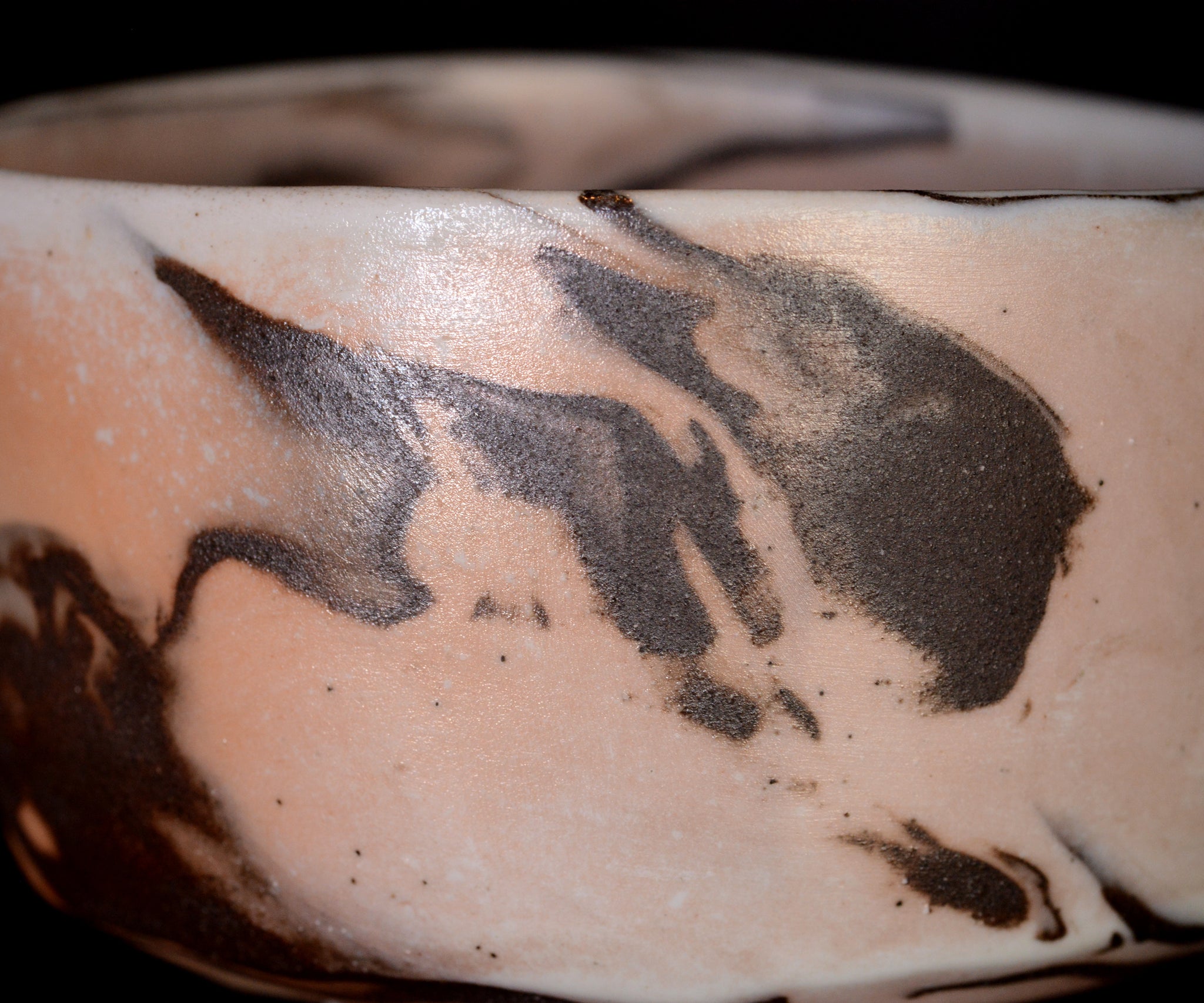 香港出身の陶芸家アマンダトンさんの抹茶碗。作家が造り続ける陰陽を表現するThe Perfect Imbalanceコレクションの作品ですが、こちらはアーティスト・イン・レジデンスの期間中に信楽の薪窯で焼成された初の薪窯作品。水墨画のような黒白磁器の練り込みによる模様に、光の辺り具合でオレンジやピンクに見える窯変が現れ美しい景色を作り出しています。薪窯ならではの照りのある肌は手触りも非常にシルキーで、軽やかで手取りも良く非常に使いやすい作品。高台脇の景色や見込みの窯変など、たくさんの見所を持った作品です。