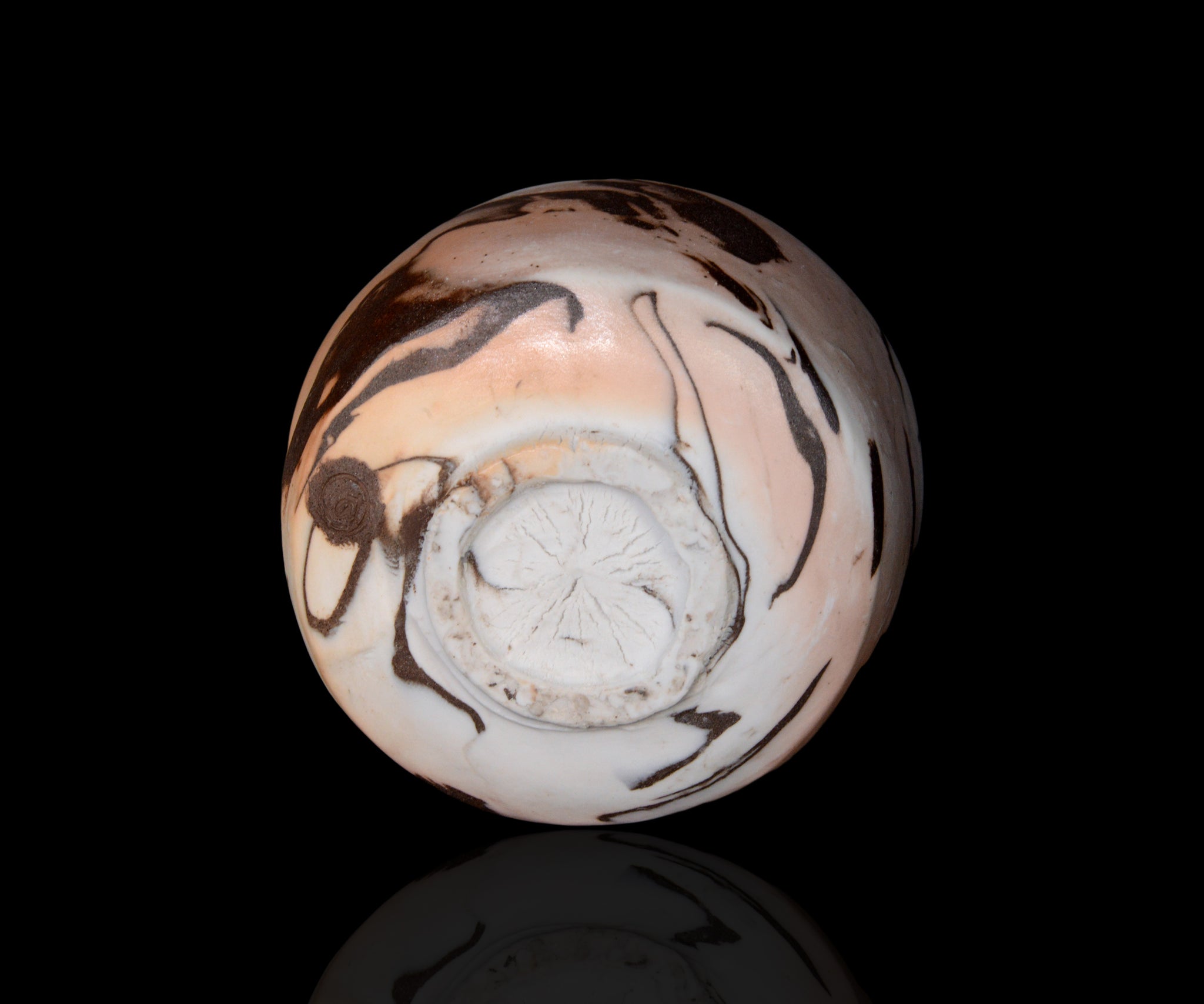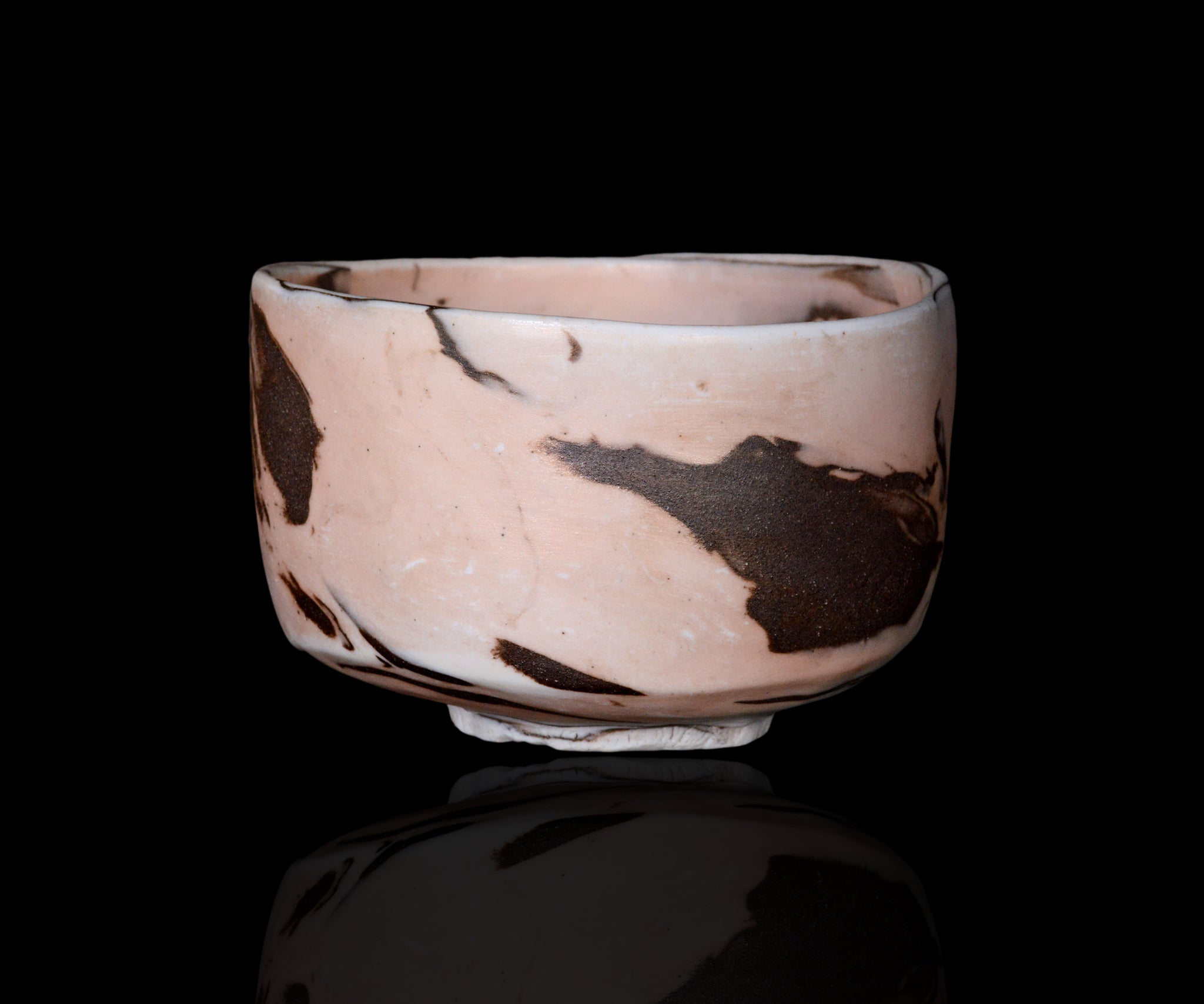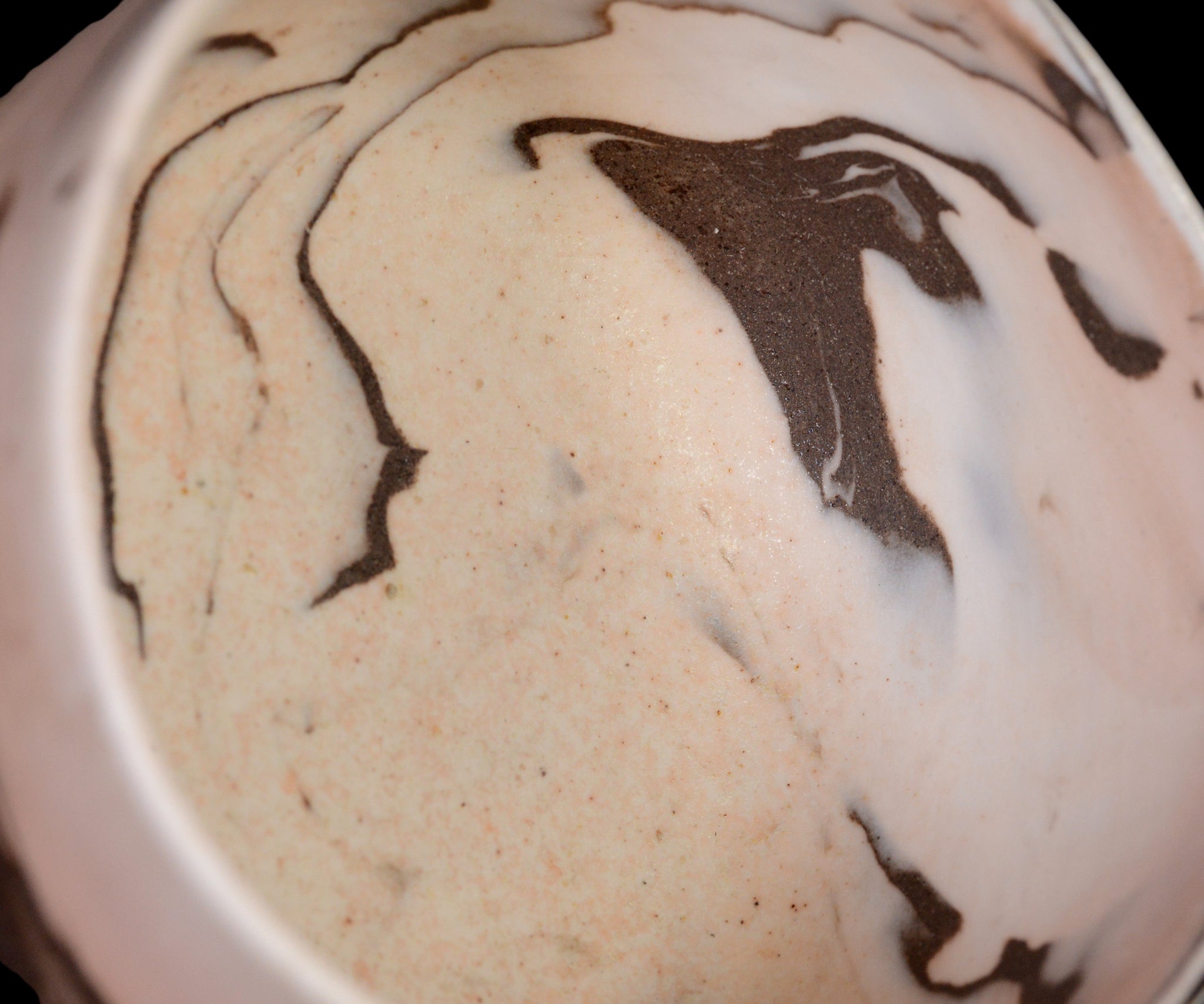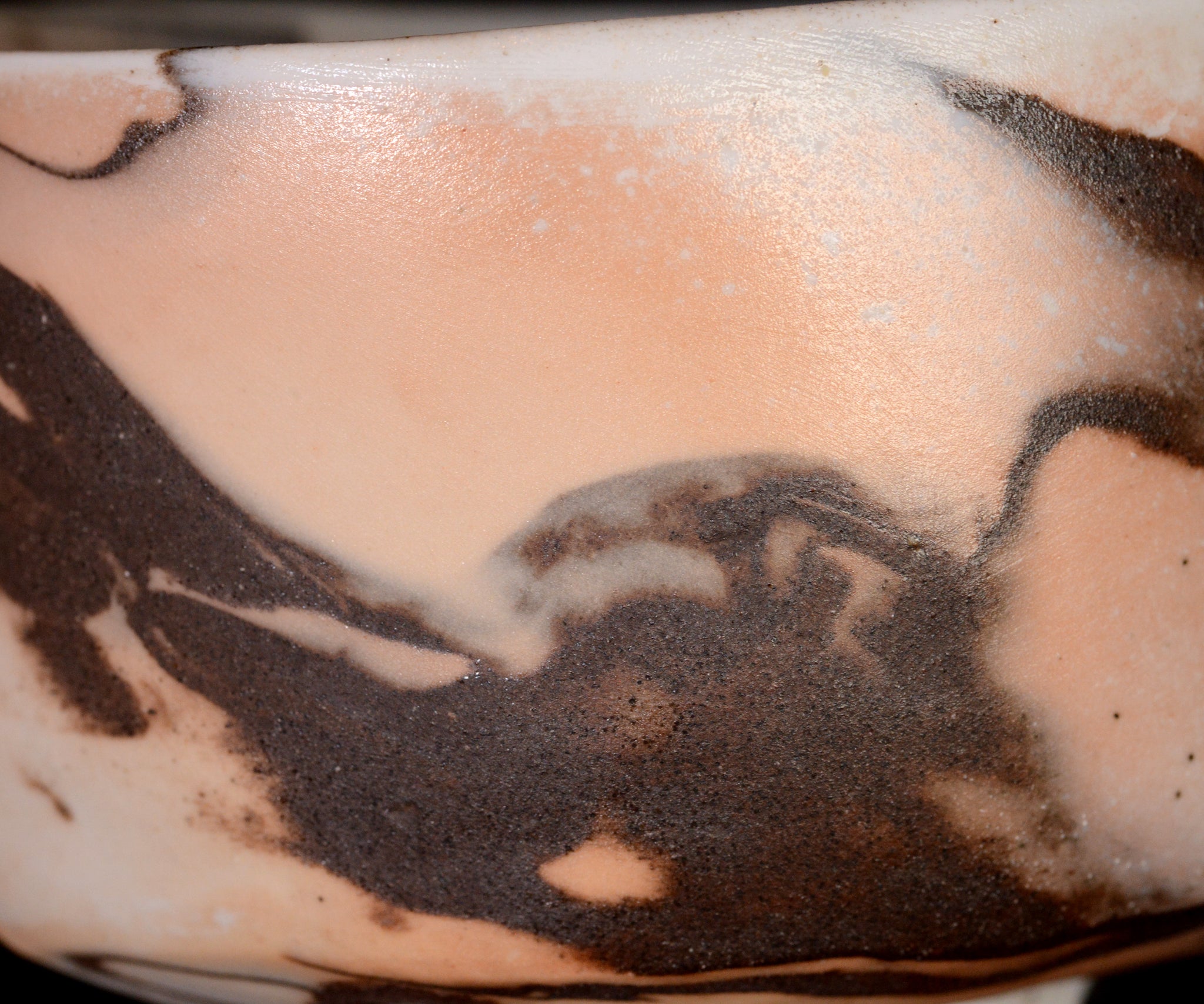 香港出身の陶芸家アマンダトンさんの抹茶碗。作家が造り続ける陰陽を表現するThe Perfect Imbalanceコレクションの作品ですが、こちらはアーティスト・イン・レジデンスの期間中に信楽の薪窯で焼成された初の薪窯作品。水墨画のような黒白磁器の練り込みによる模様に、光の辺り具合でオレンジやピンクに見える窯変が現れ美しい景色を作り出しています。薪窯ならではの照りのある肌は手触りも非常にシルキーで、軽やかで手取りも良く非常に使いやすい作品。高台脇の景色や見込みの窯変など、たくさんの見所を持った作品です。
