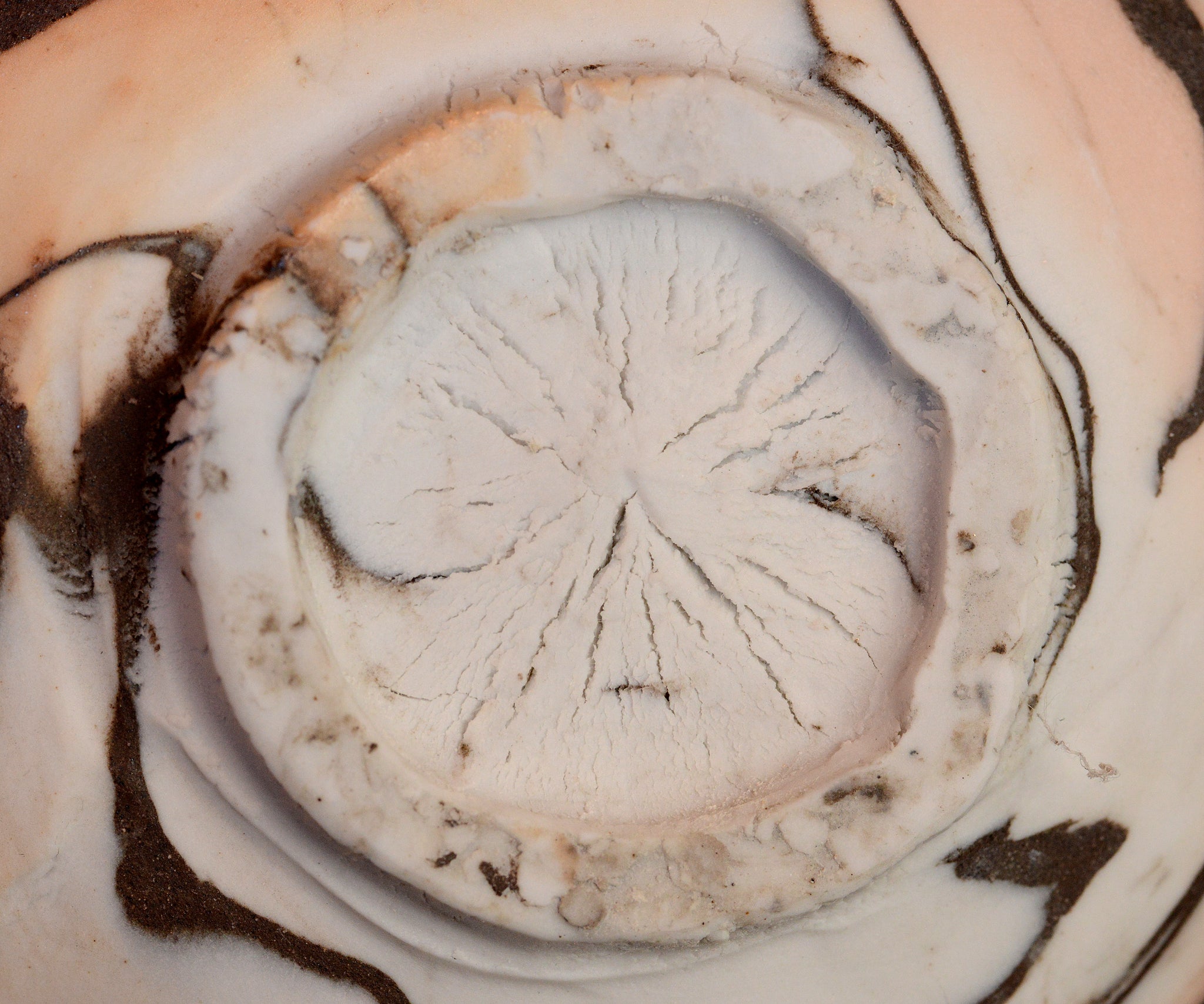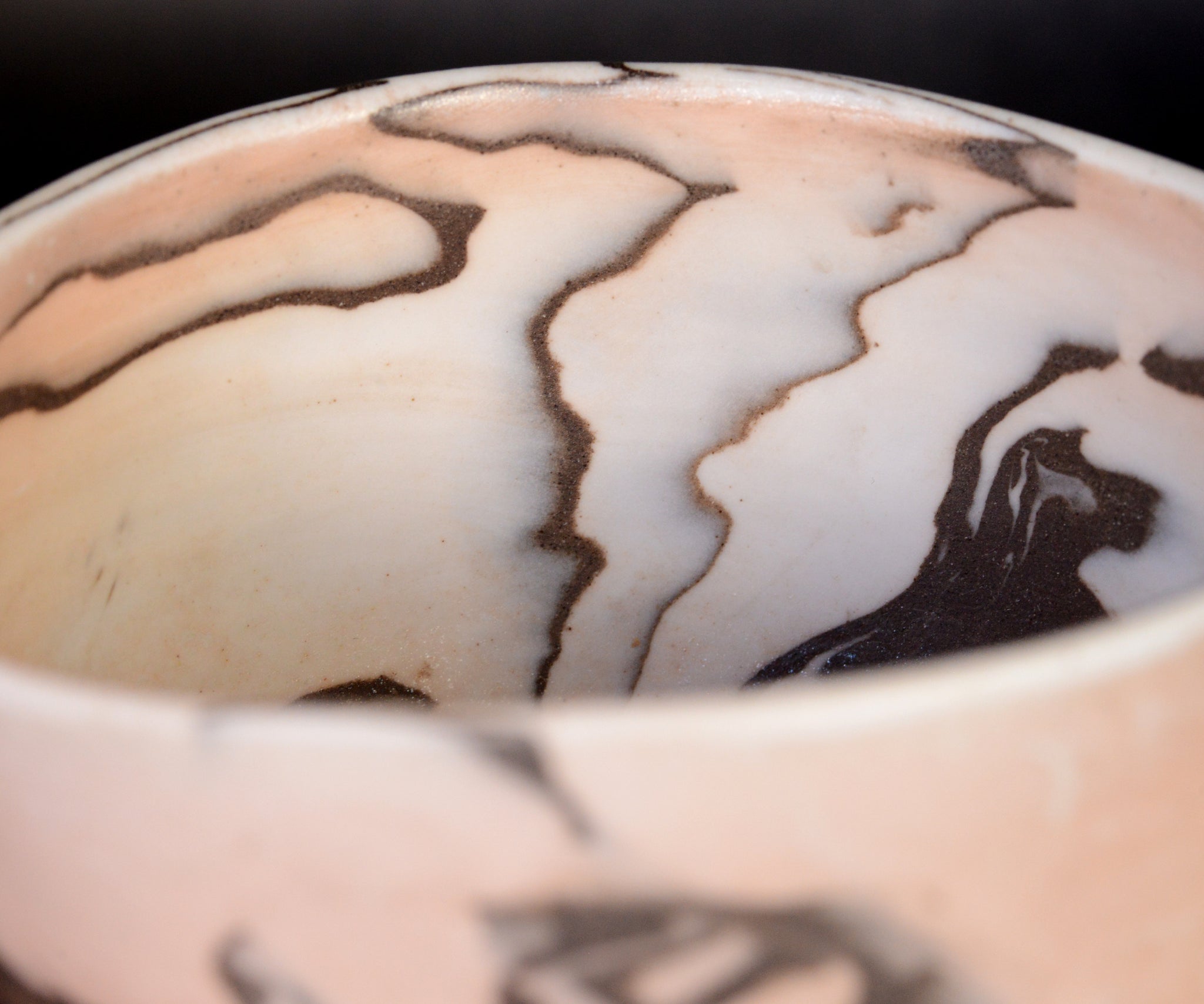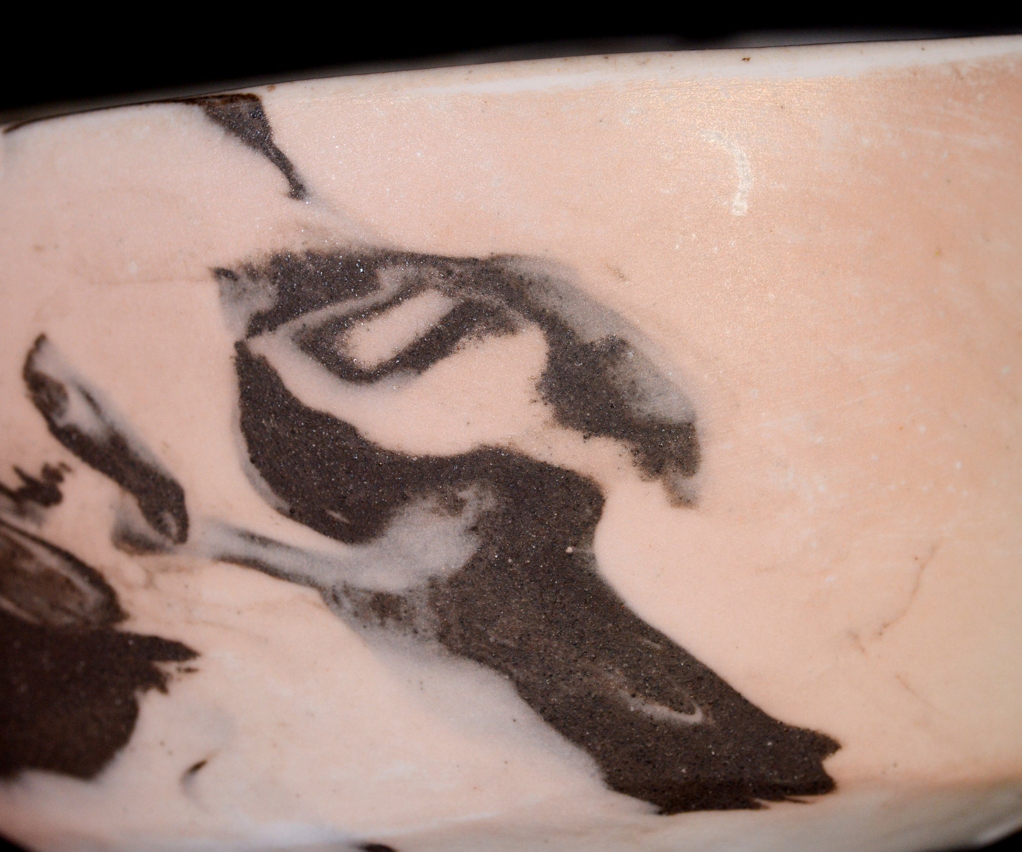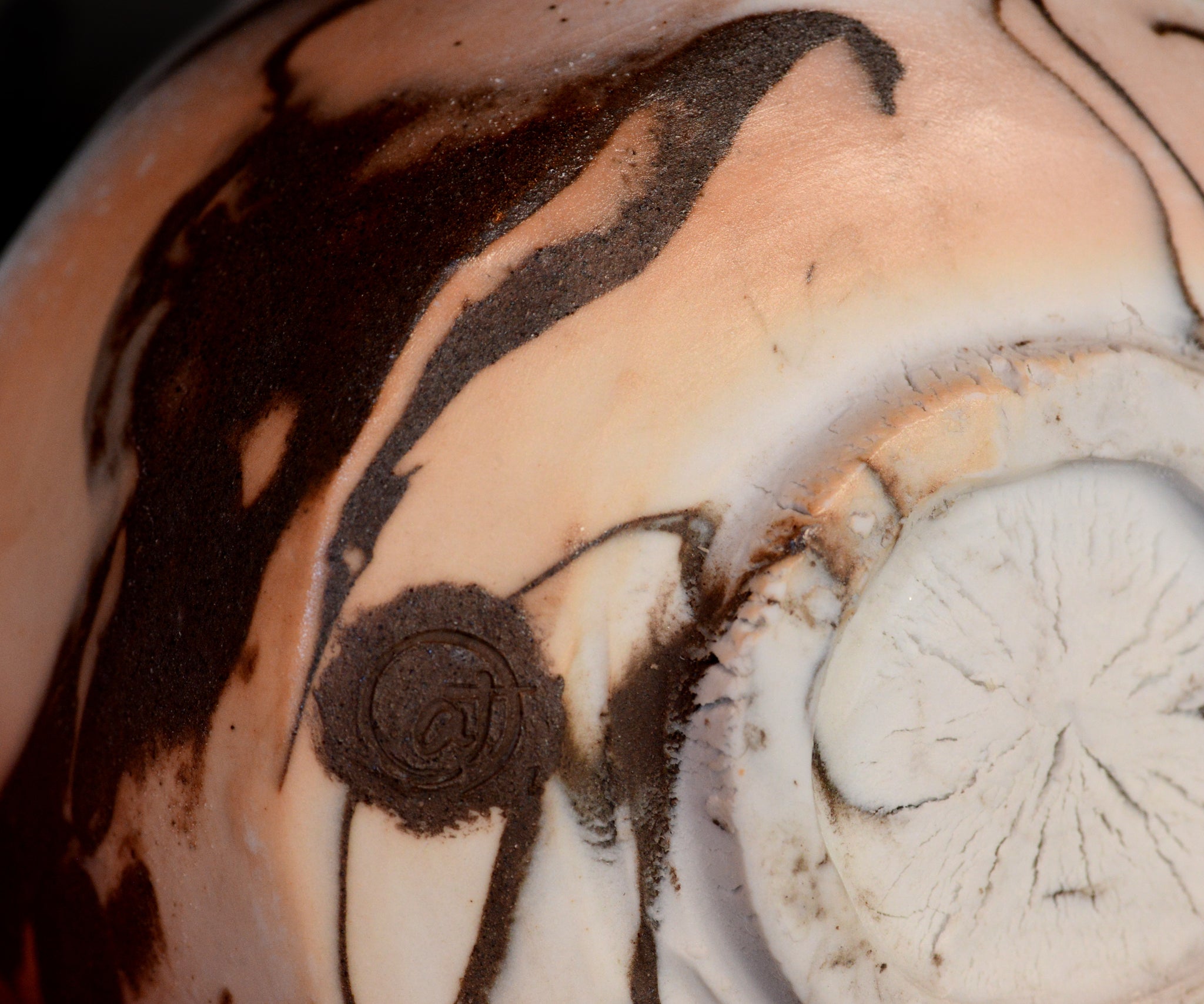 香港出身の陶芸家アマンダトンさんの抹茶碗。作家が造り続ける陰陽を表現するThe Perfect Imbalanceコレクションの作品ですが、こちらはアーティスト・イン・レジデンスの期間中に信楽の薪窯で焼成された初の薪窯作品。水墨画のような黒白磁器の練り込みによる模様に、光の辺り具合でオレンジやピンクに見える窯変が現れ美しい景色を作り出しています。薪窯ならではの照りのある肌は手触りも非常にシルキーで、軽やかで手取りも良く非常に使いやすい作品。高台脇の景色や見込みの窯変など、たくさんの見所を持った作品です。