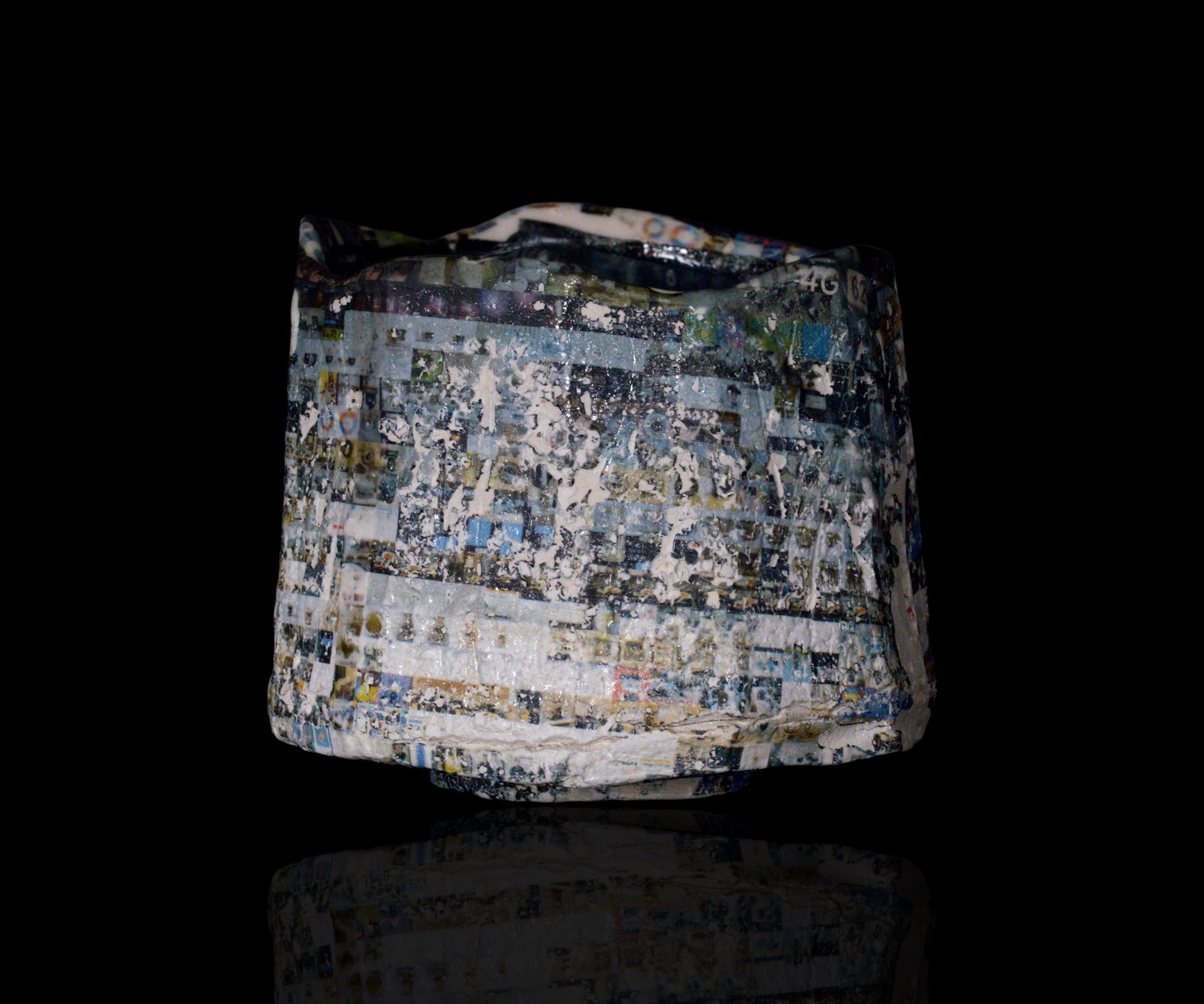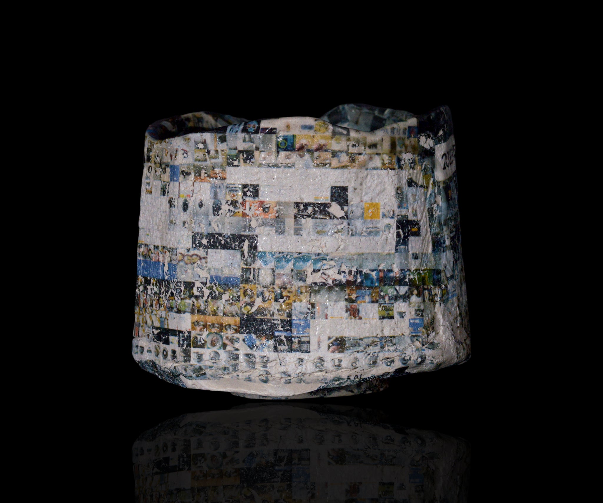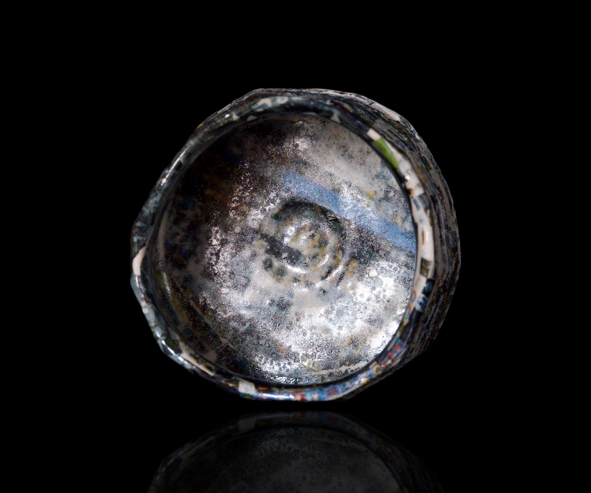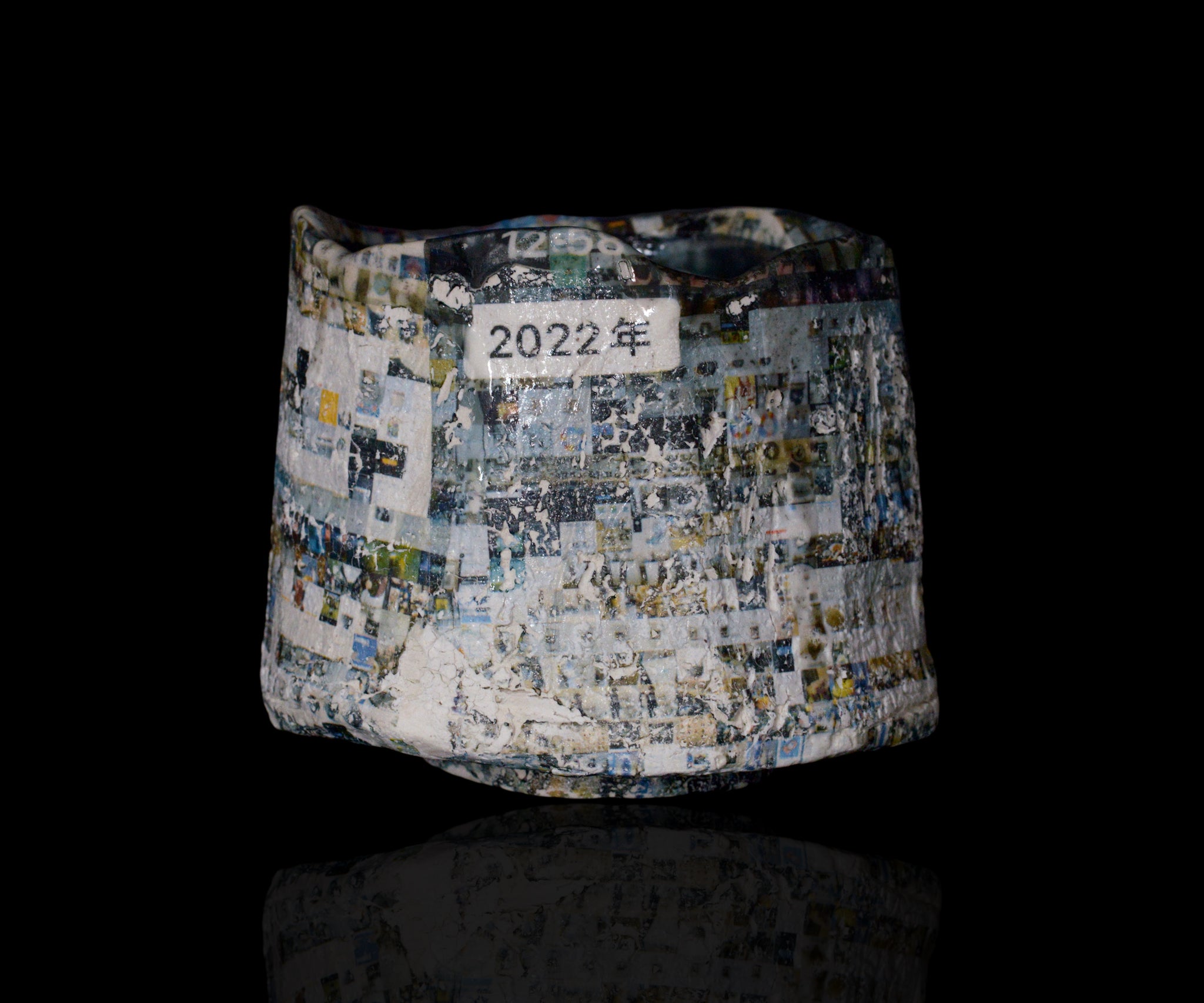 転写やAIを用い独自の作風を生み出している伊勢崎陽太郎さんの最新作、日々面取茶碗。スマートフォンのギャラリーに収められた一年分の写真をスクリーンショットし、それを転写プリントとして用いた、きわめて現代的なアプローチの作品。腰の張ったどしっとした大振りな造形で、ざっくりと面取りされており、焼成の過程で生まれた転写のにじみや削げ、そこから覗く土味が豊かな表情をつくり出しています。
