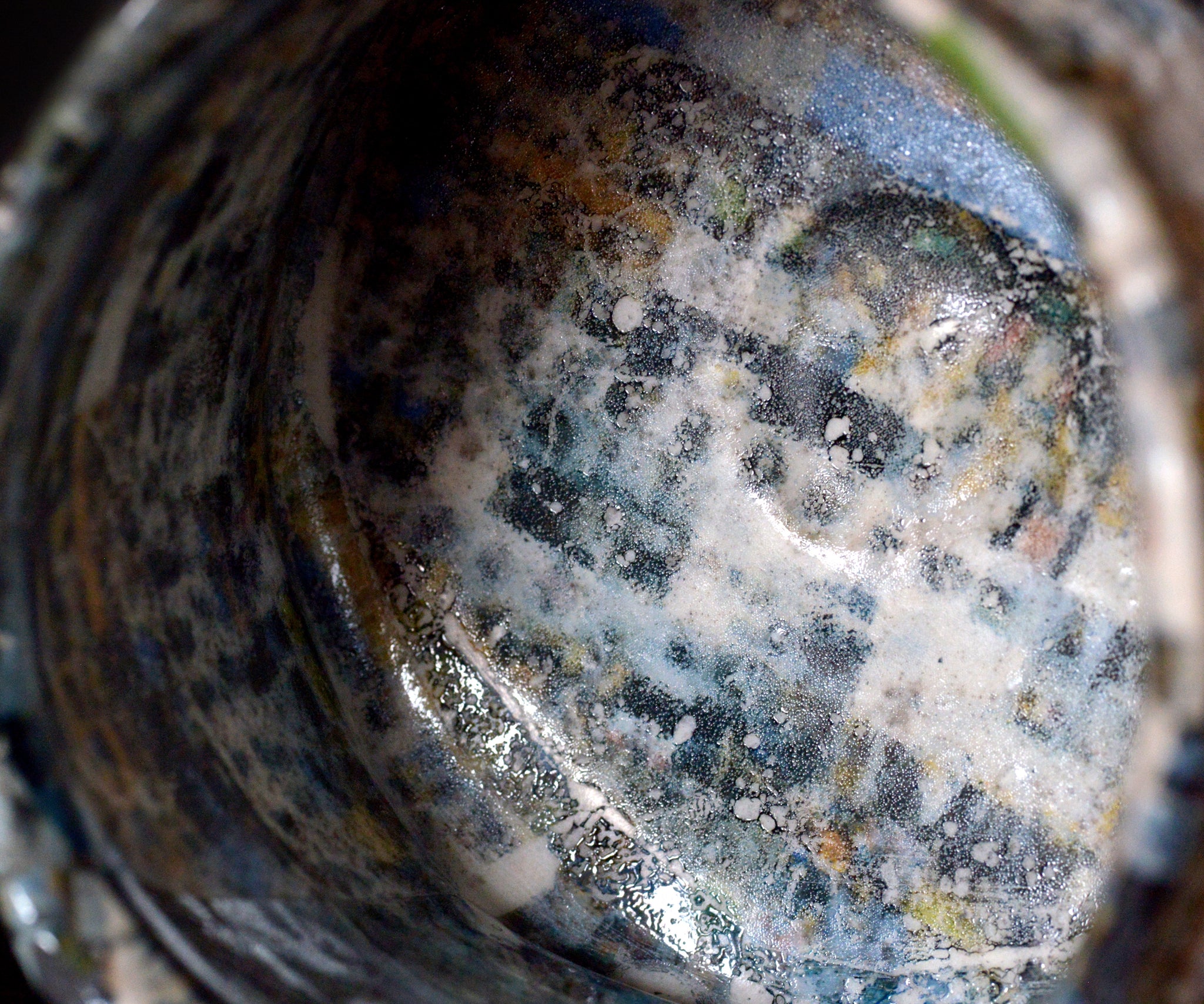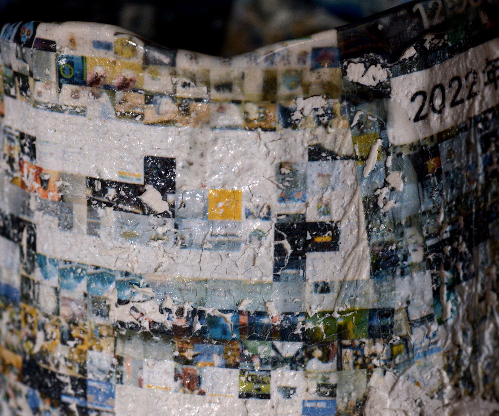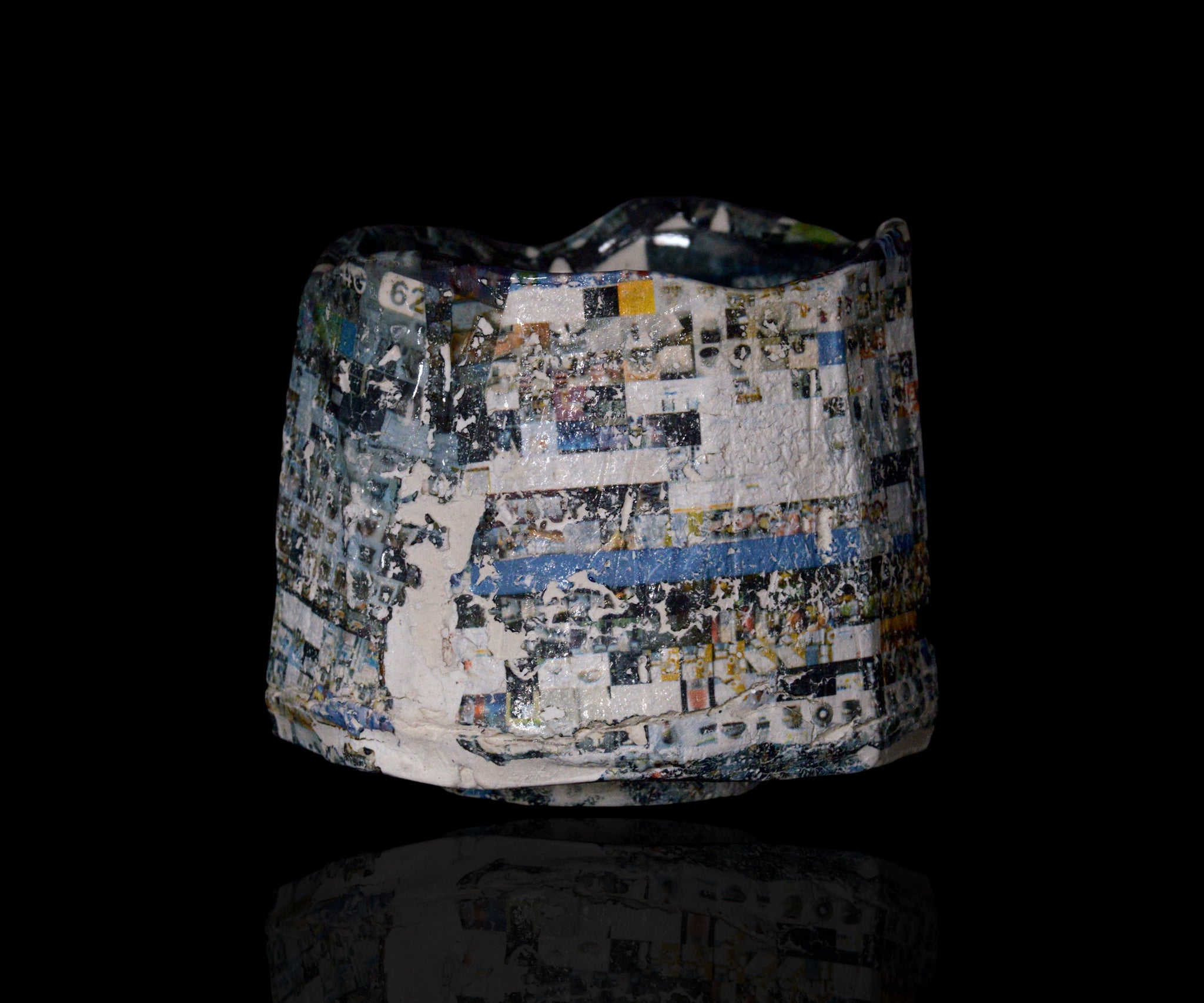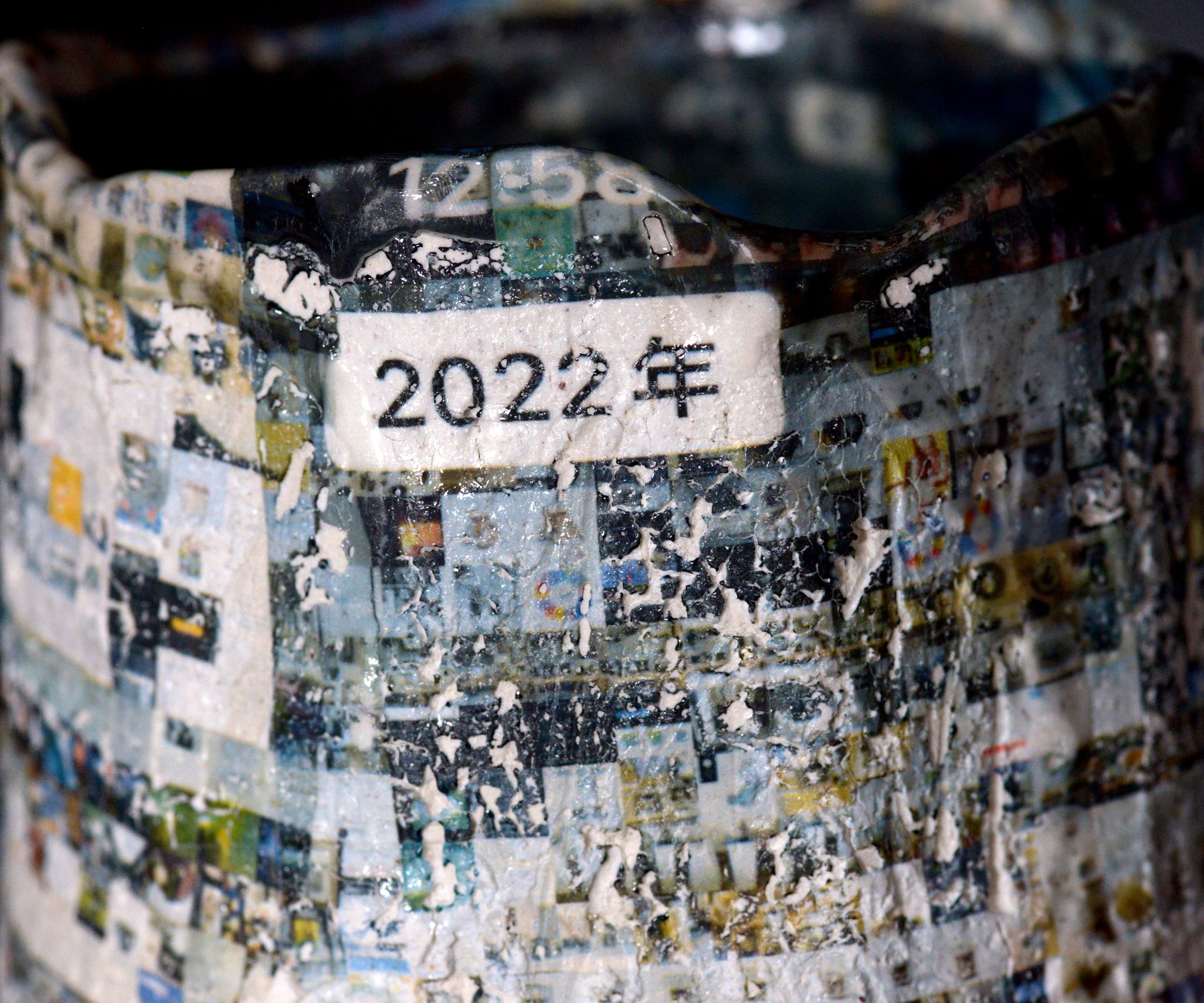 転写やAIを用い独自の作風を生み出している伊勢崎陽太郎さんの最新作、日々面取茶碗。スマートフォンのギャラリーに収められた一年分の写真をスクリーンショットし、それを転写プリントとして用いた、きわめて現代的なアプローチの作品。腰の張ったどしっとした大振りな造形で、ざっくりと面取りされており、焼成の過程で生まれた転写のにじみや削げ、そこから覗く土味が豊かな表情をつくり出しています。