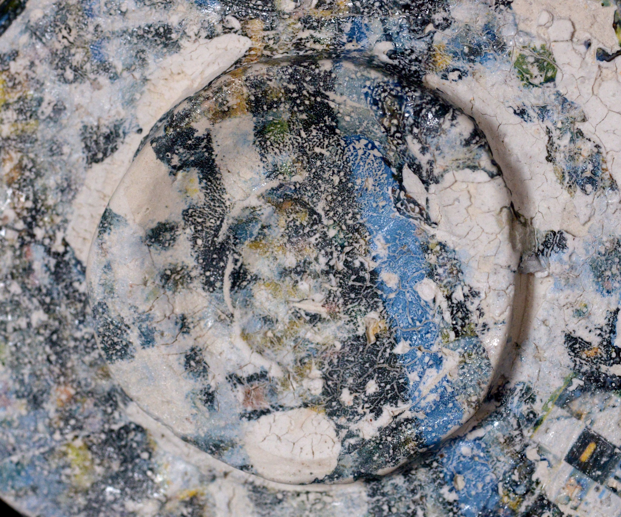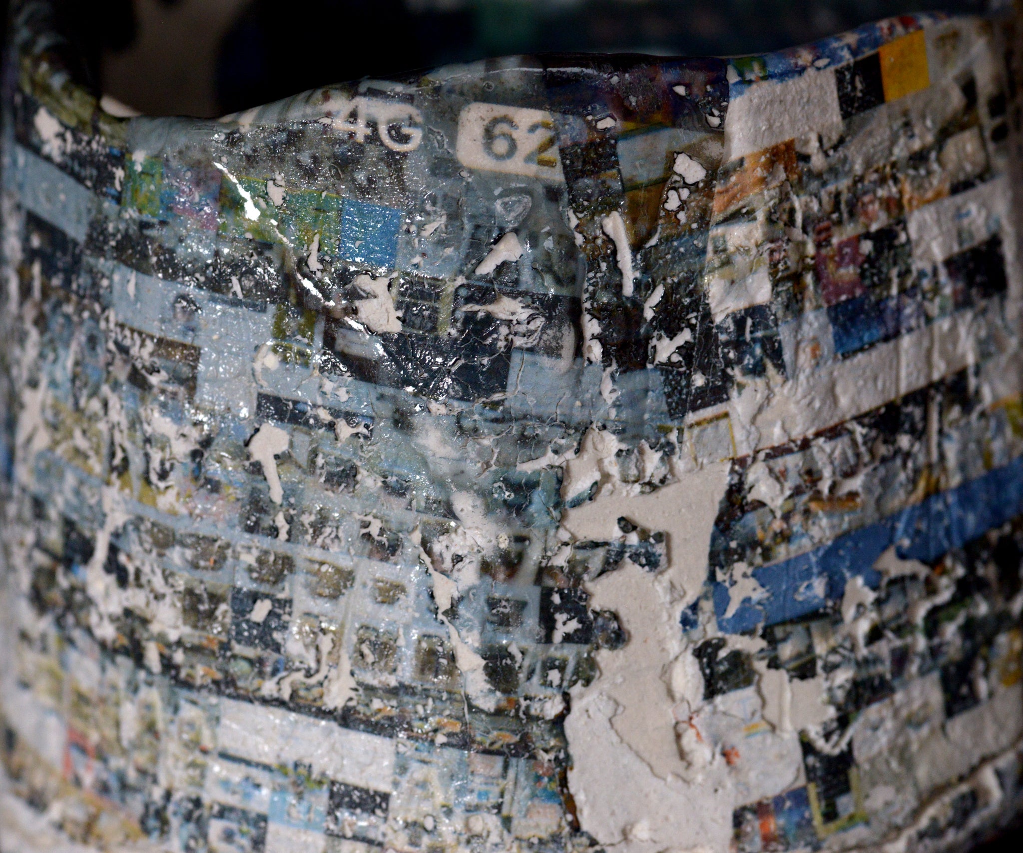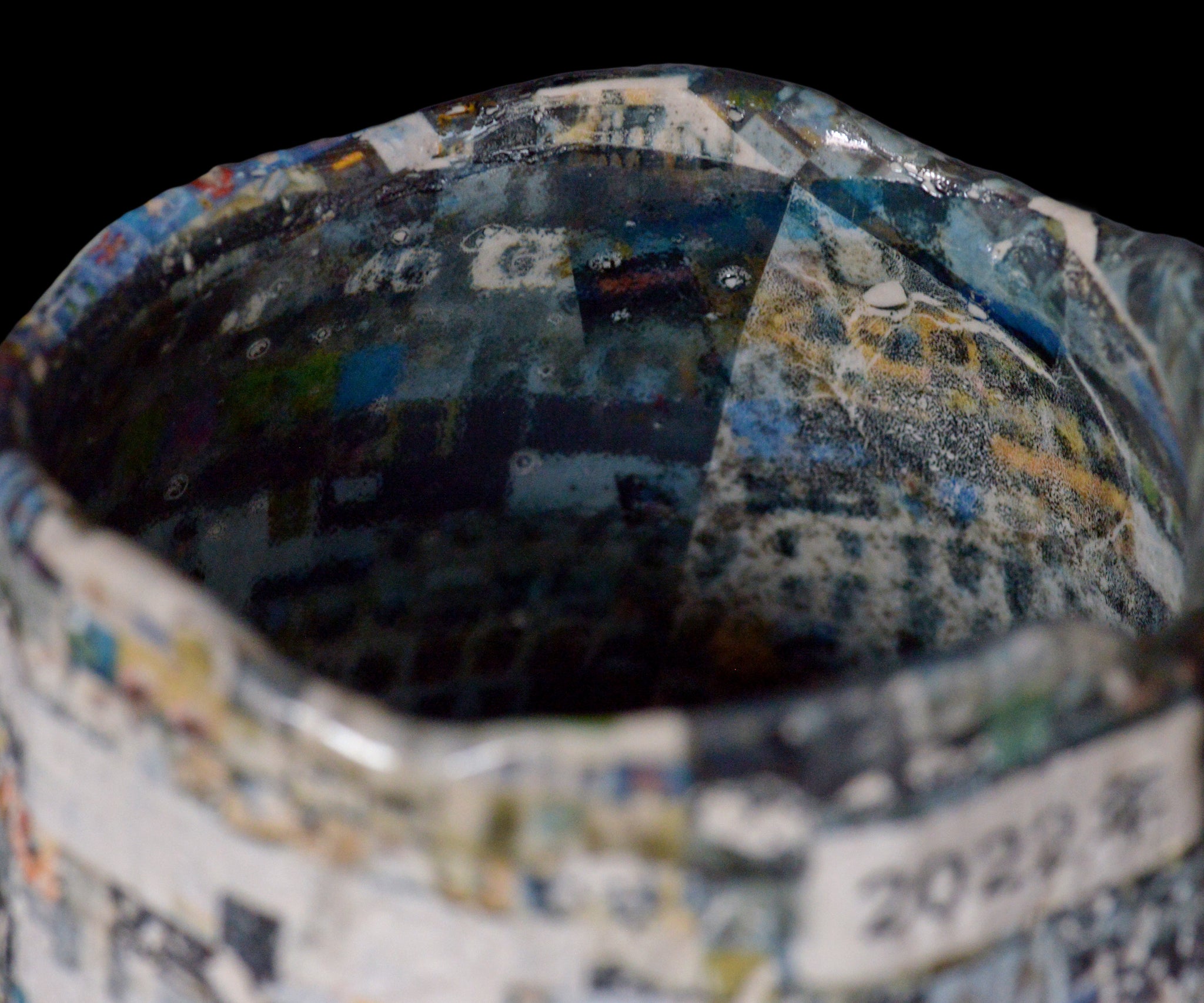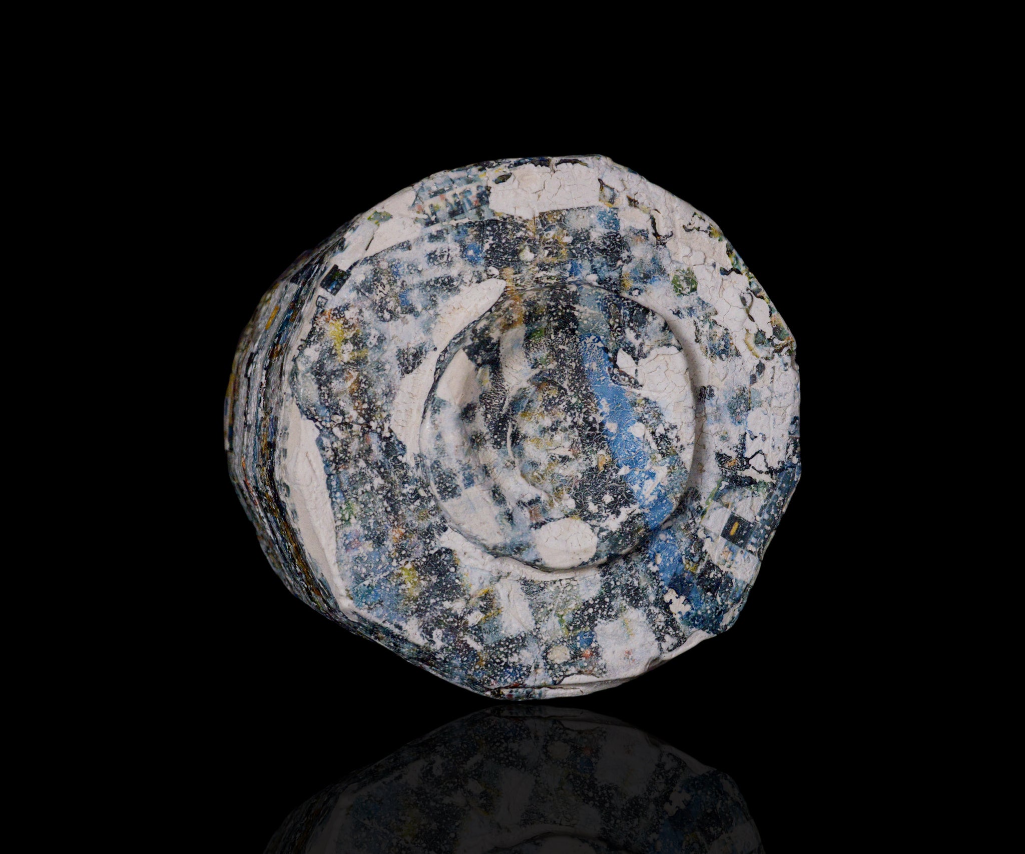 転写やAIを用い独自の作風を生み出している伊勢崎陽太郎さんの最新作、日々面取茶碗。スマートフォンのギャラリーに収められた一年分の写真をスクリーンショットし、それを転写プリントとして用いた、きわめて現代的なアプローチの作品。腰の張ったどしっとした大振りな造形で、ざっくりと面取りされており、焼成の過程で生まれた転写のにじみや削げ、そこから覗く土味が豊かな表情をつくり出しています。