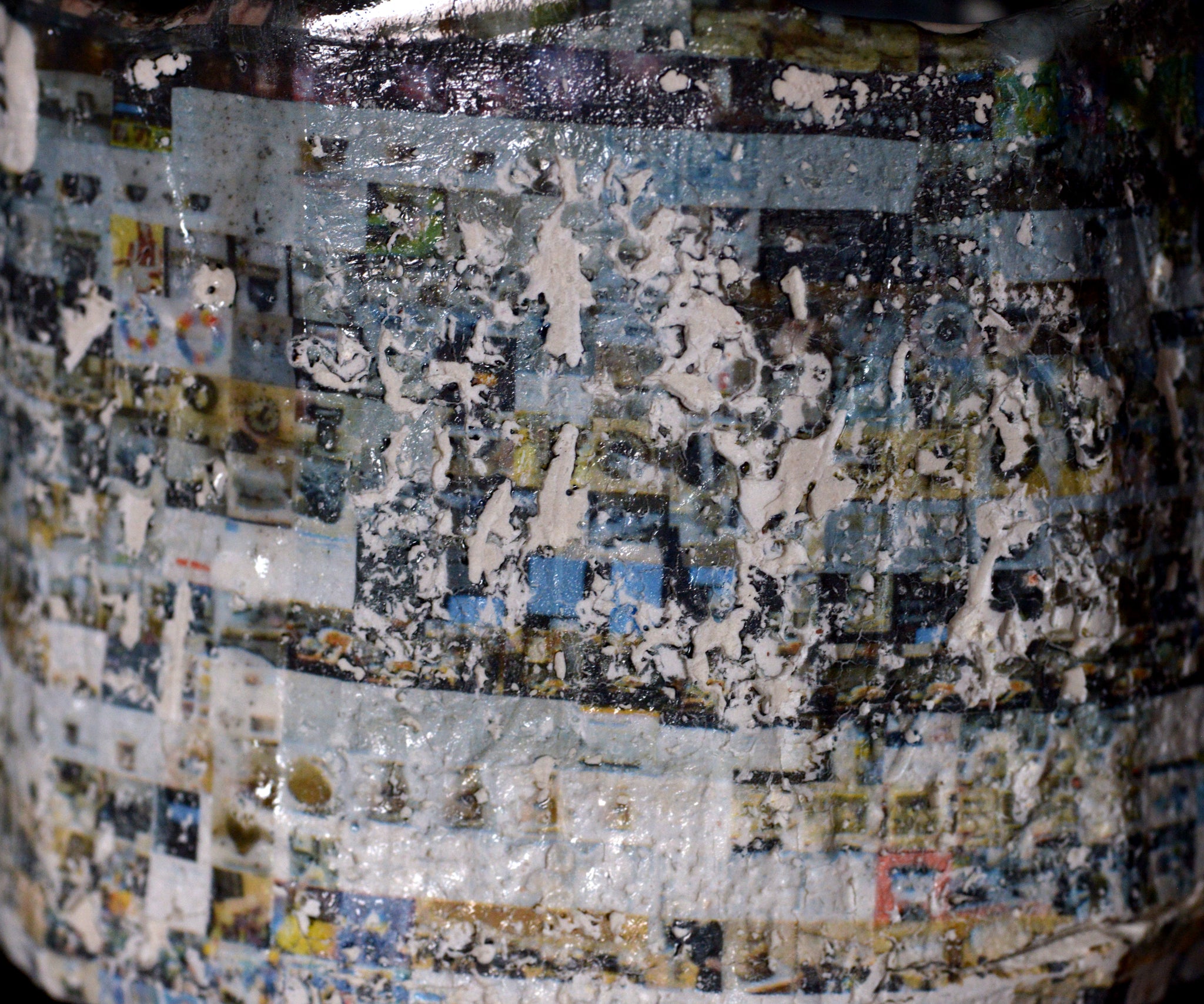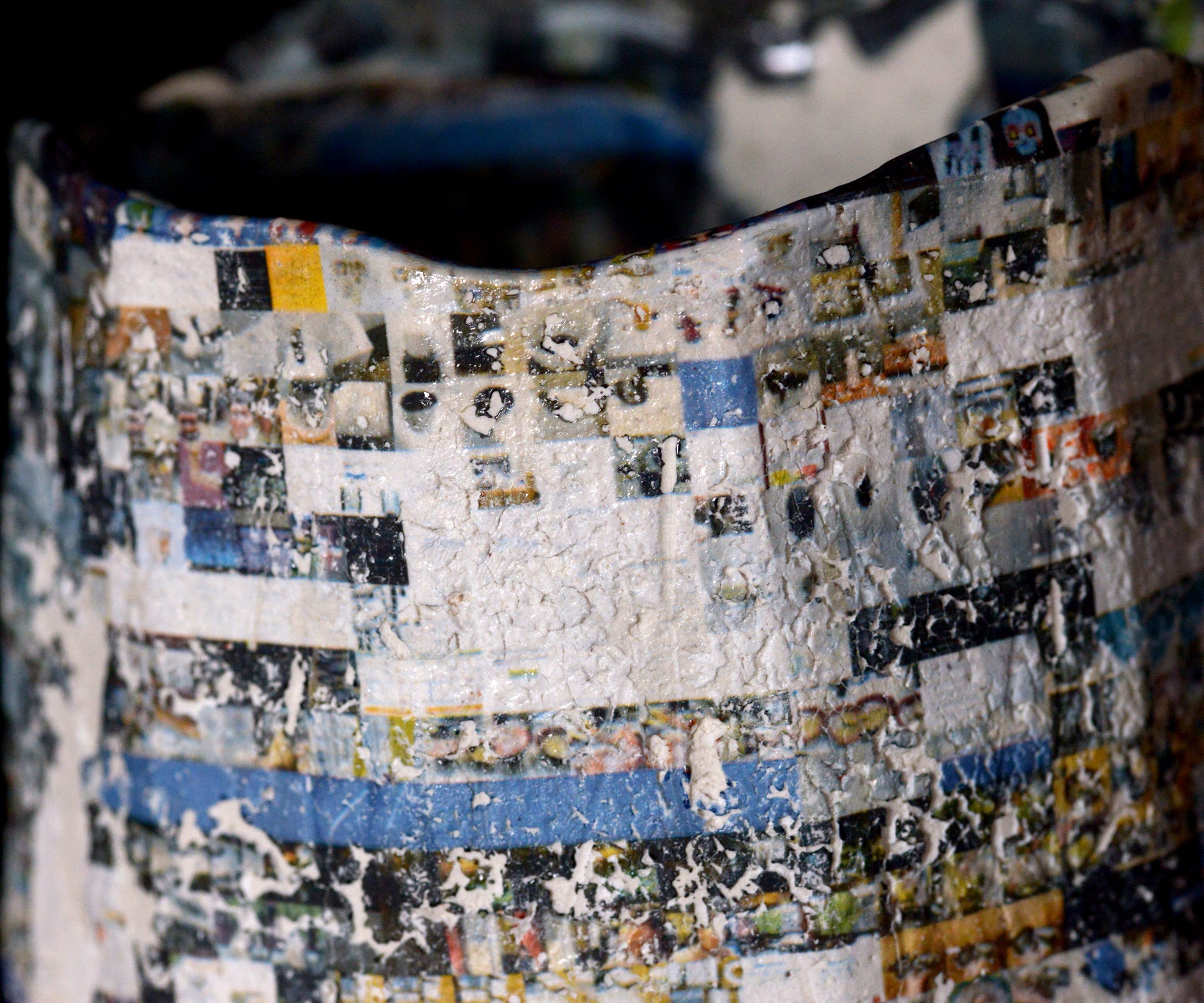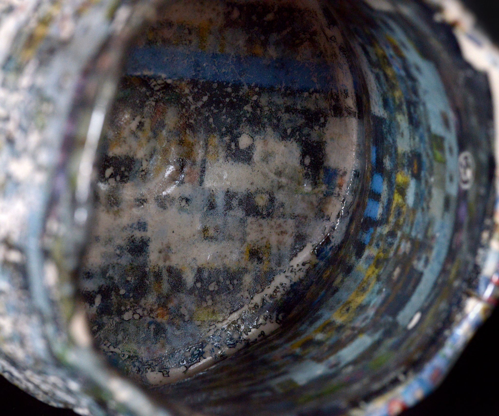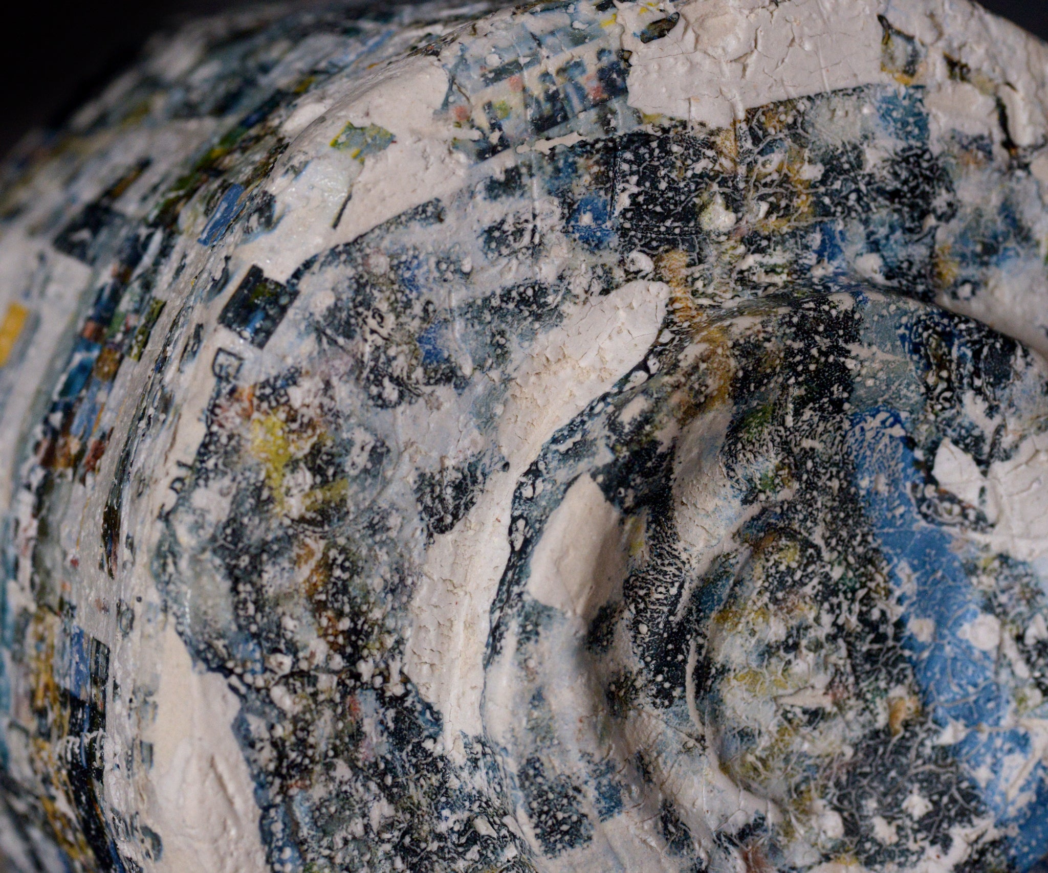 転写やAIを用い独自の作風を生み出している伊勢崎陽太郎さんの最新作、日々面取茶碗。スマートフォンのギャラリーに収められた一年分の写真をスクリーンショットし、それを転写プリントとして用いた、きわめて現代的なアプローチの作品。腰の張ったどしっとした大振りな造形で、ざっくりと面取りされており、焼成の過程で生まれた転写のにじみや削げ、そこから覗く土味が豊かな表情をつくり出しています。