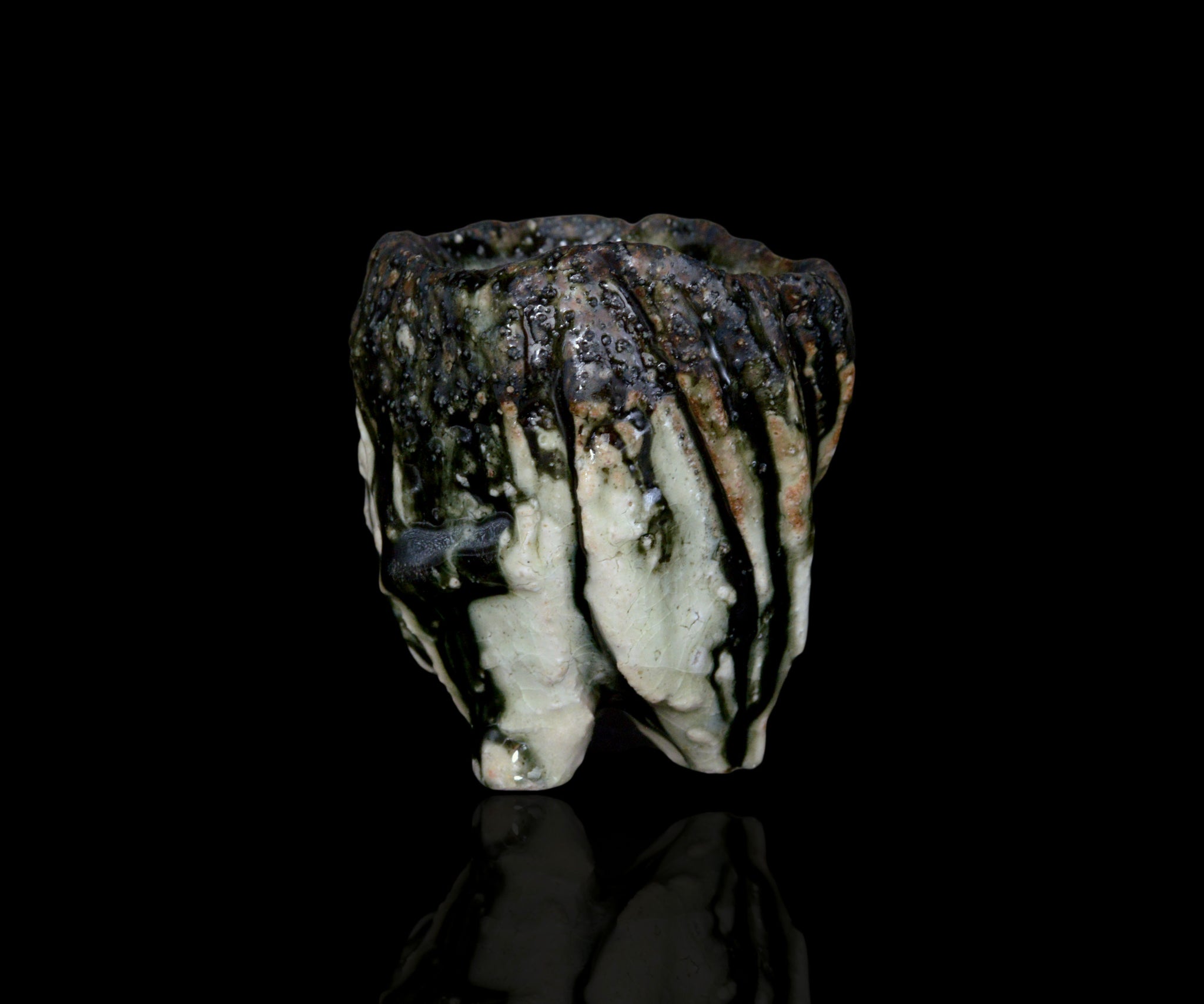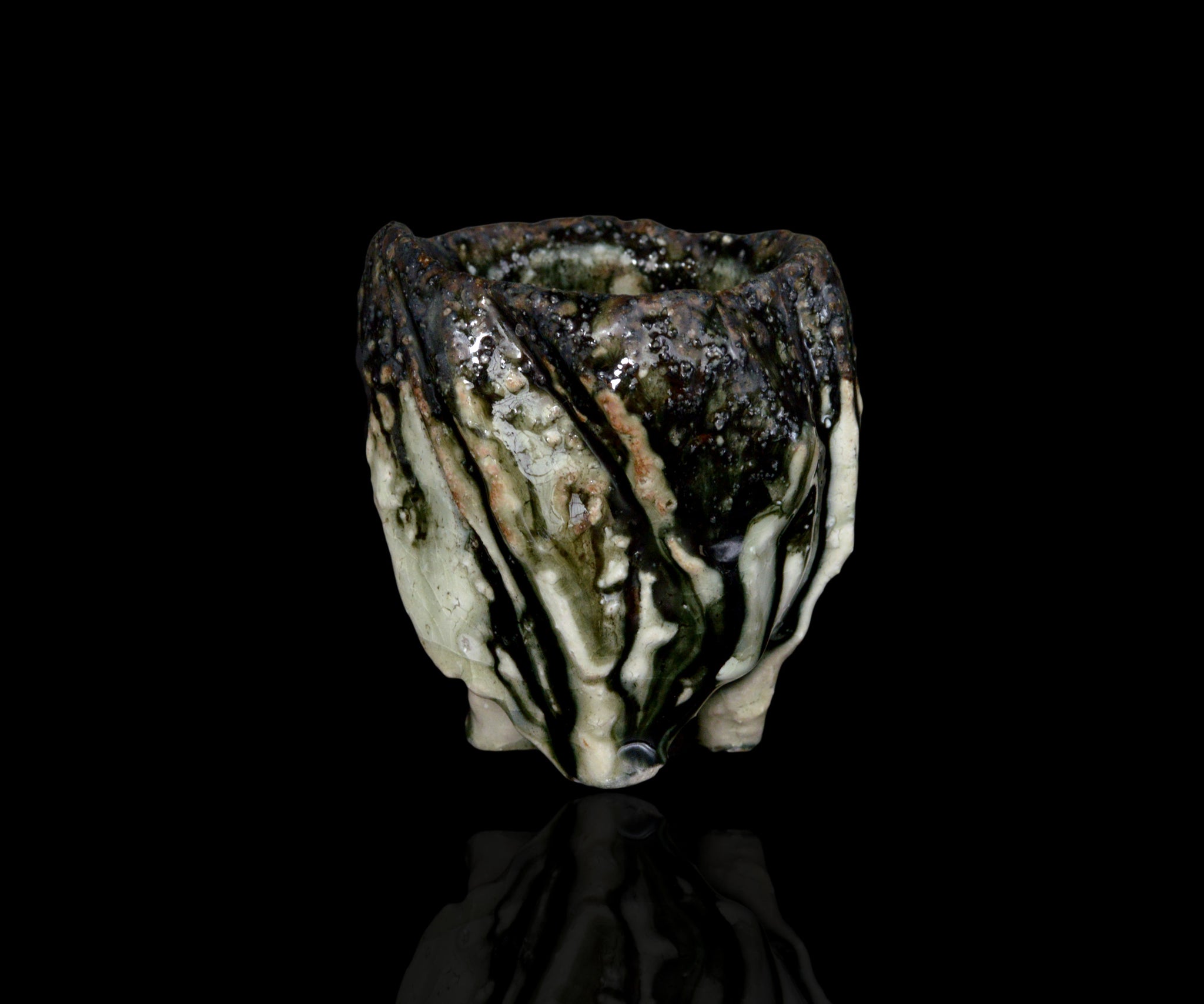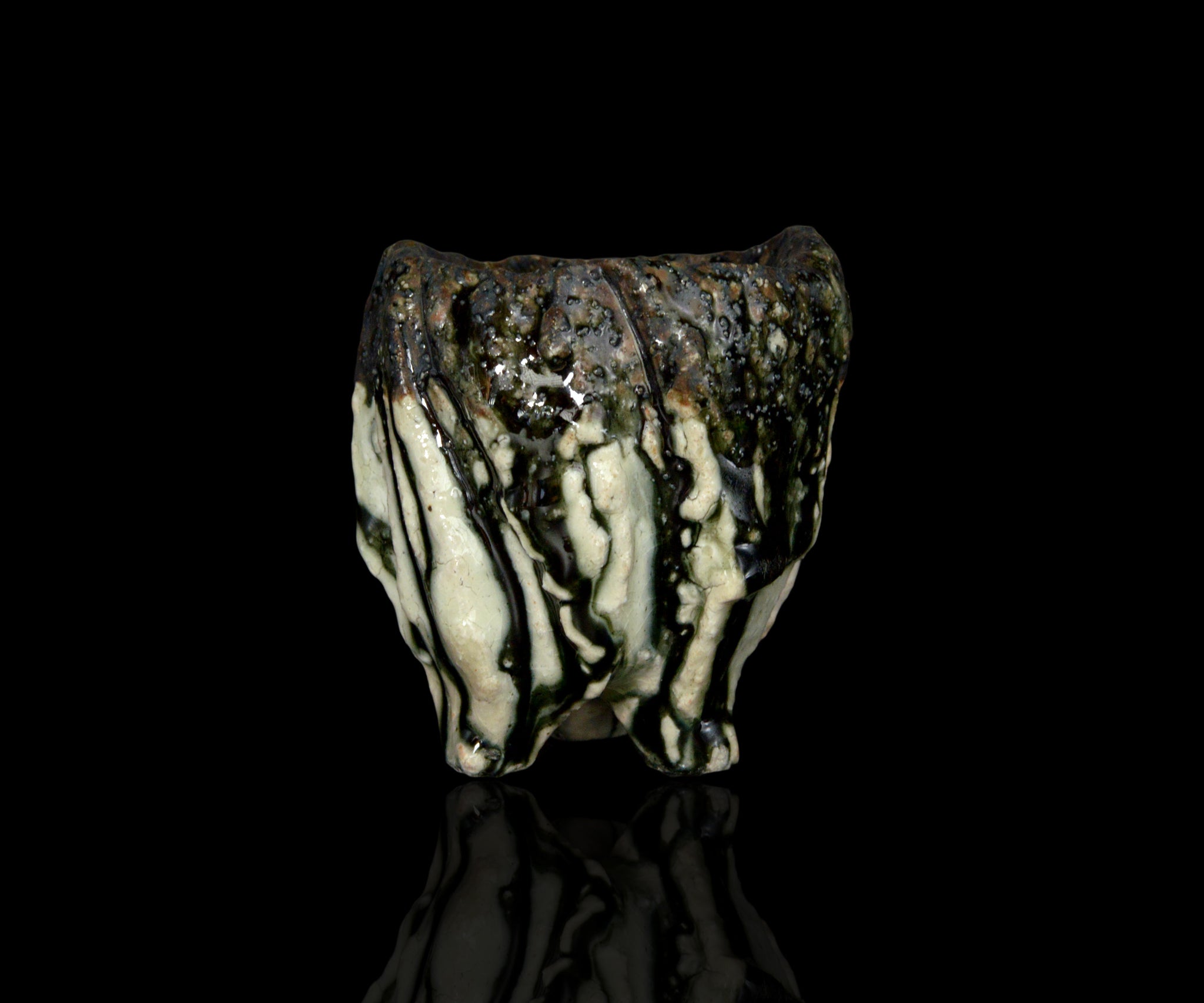 土岐市の陶芸家、塚本治彦さんの黒織部ぐい呑。動物の脚を思わせる、力強くもどこかユーモラスな造形が印象的な作品。黒釉の流れと白土の露出が生む景色と造形は、彫刻的でありながらどこか愛らしさが感じられます。見込みに現れる釉薬の表情も美しく、手に取るたび思わず撫でたくなるような魅力を備えた作品です。