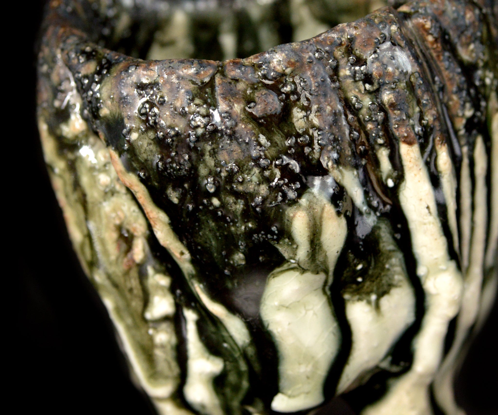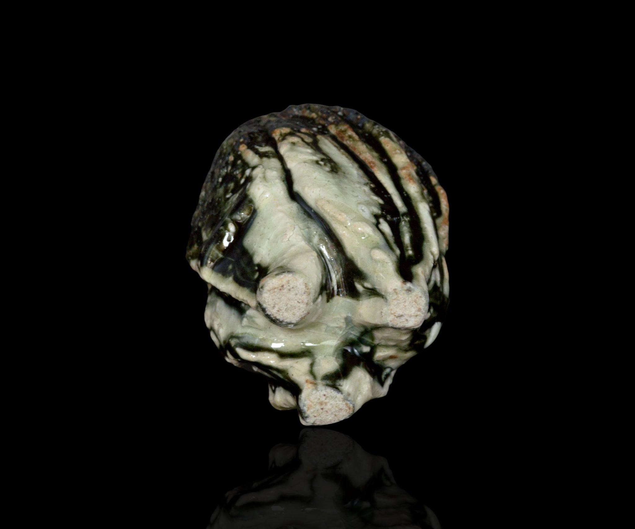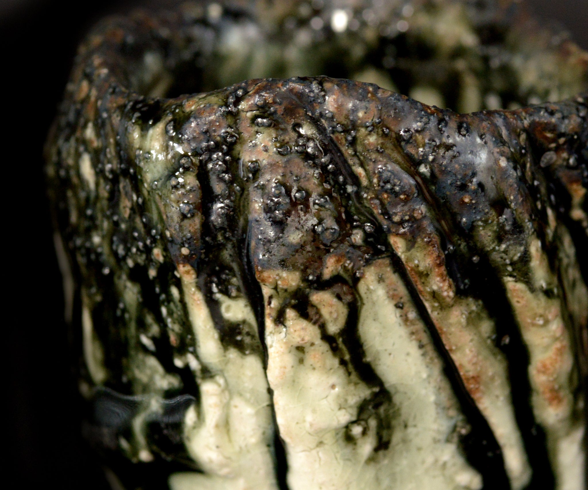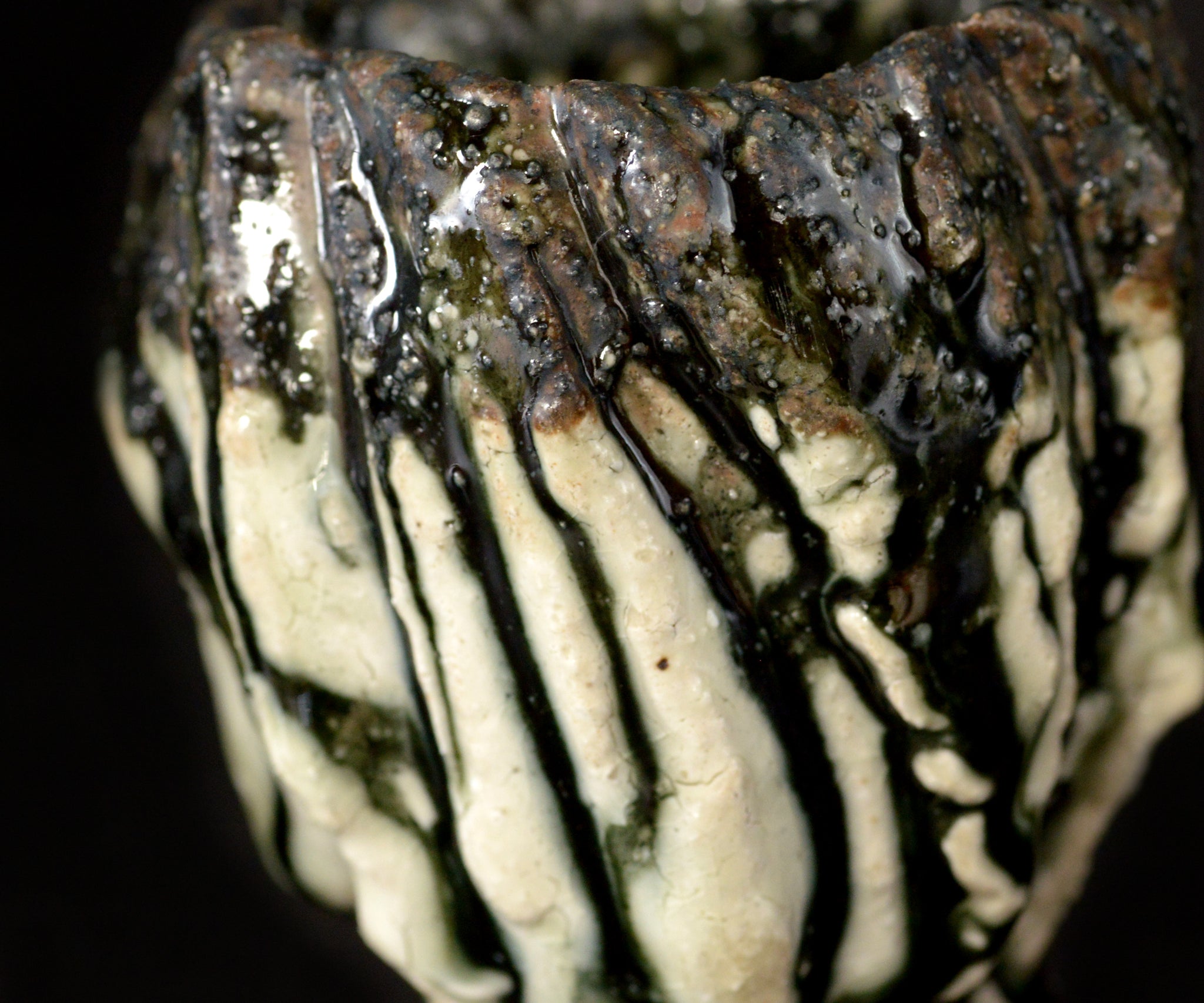 土岐市の陶芸家、塚本治彦さんの黒織部ぐい呑。動物の脚を思わせる、力強くもどこかユーモラスな造形が印象的な作品。黒釉の流れと白土の露出が生む景色と造形は、彫刻的でありながらどこか愛らしさが感じられます。見込みに現れる釉薬の表情も美しく、手に取るたび思わず撫でたくなるような魅力を備えた作品です。