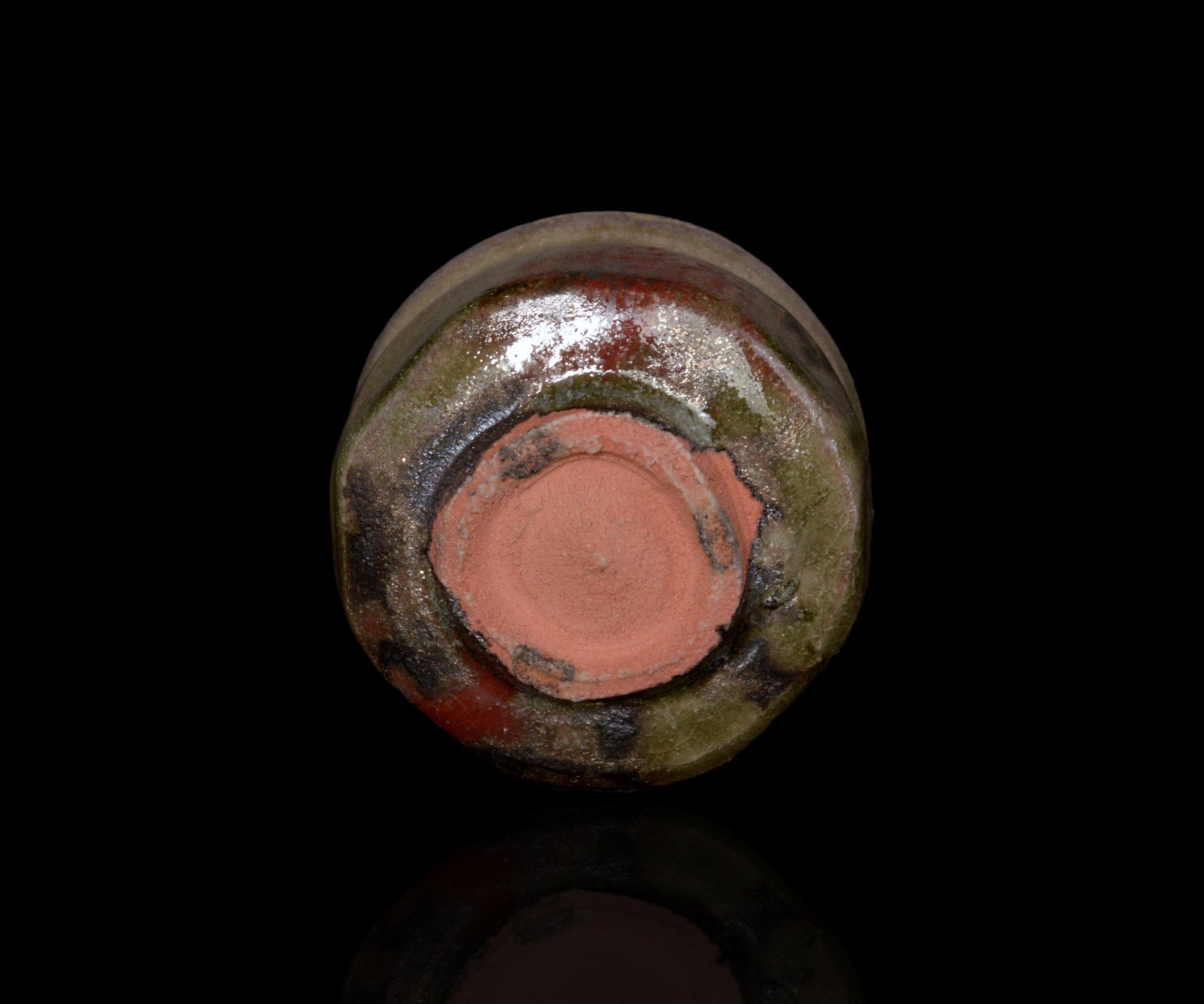 埼玉で黄瀬戸作品を中心に作陶する松村遷さんの黄瀬戸ぐい呑。ガス窯にて黄瀬戸を制作後、さらなる窯変を求め薪窯で焼成し奥行きのある表情を引き出した作品。艶のある黄色のボディに、草紋に現れた赤い胆礬が美しい作品。カセた口縁には紫が現れ、見込みもほのかに赤く色づいています。