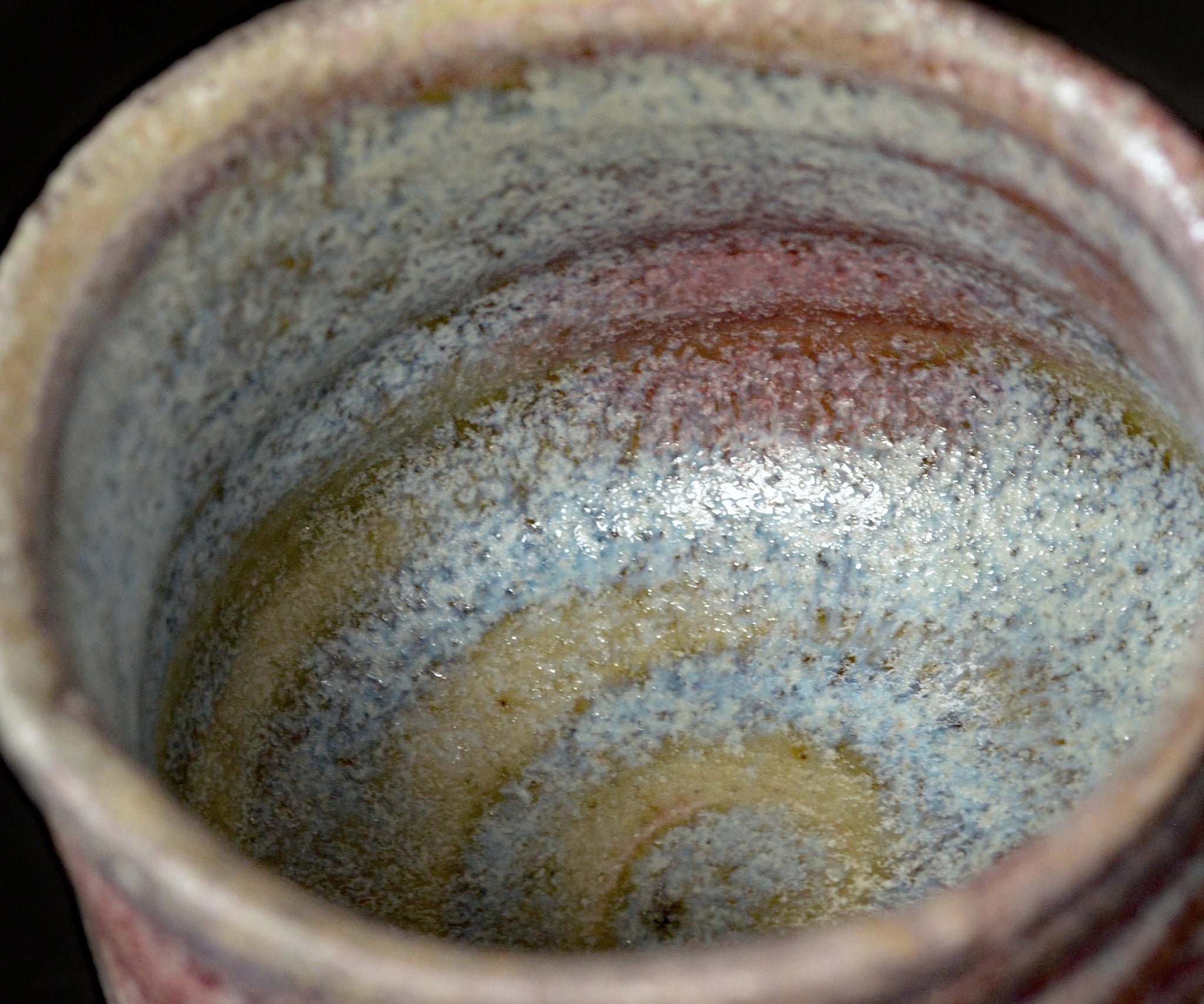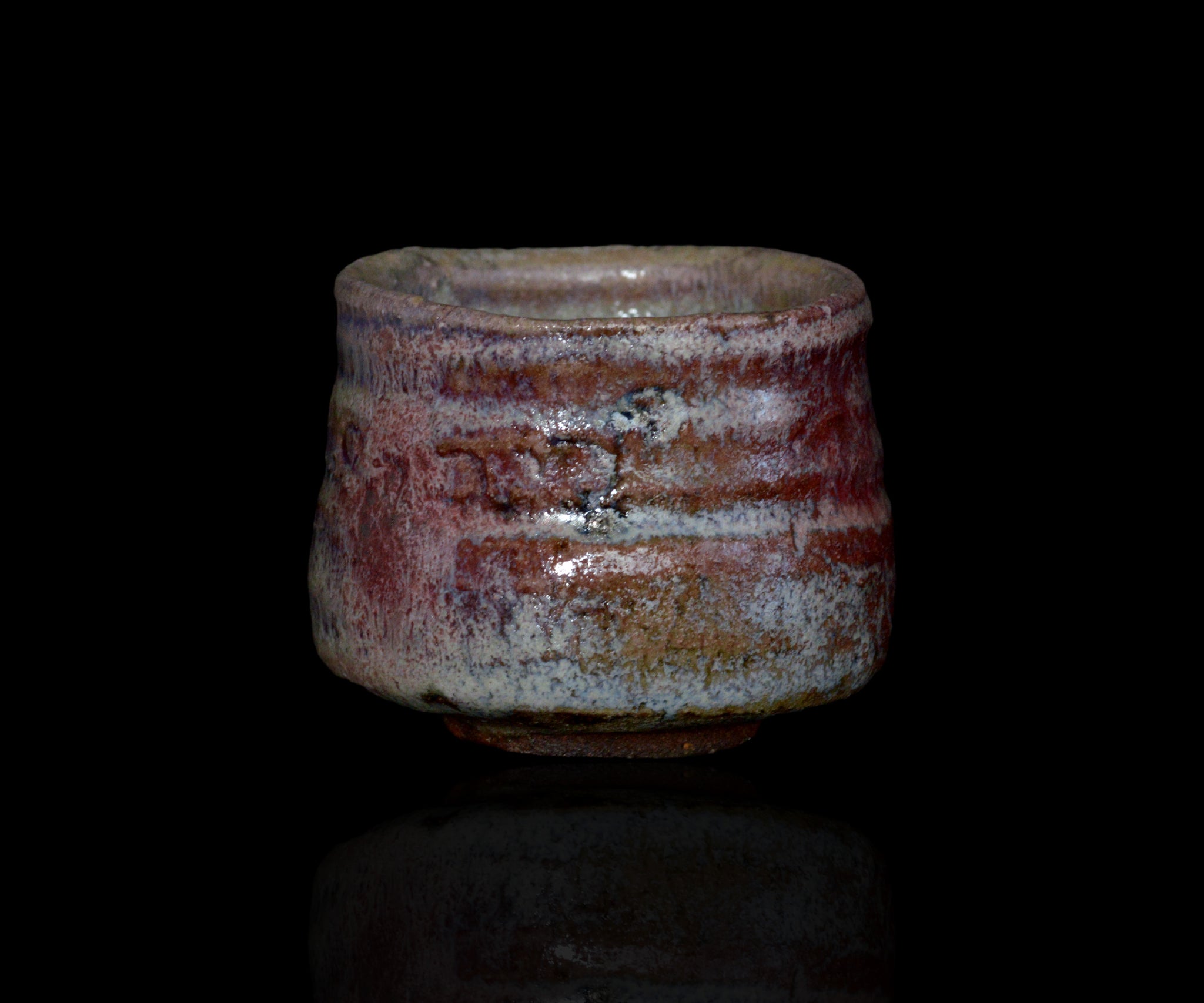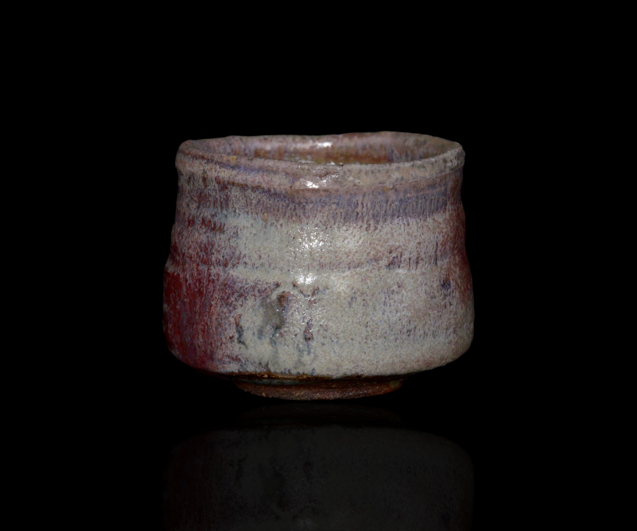 埼玉で黄瀬戸作品を中心に作陶する松村遷さんの黄瀬戸ぐい呑。ガス窯にて黄瀬戸を制作後、さらなる窯変を求め薪窯で焼成し奥行きのある表情を引き出した作品。大ぶりのボディにしっかりと現れた辰砂と卯の斑、そして朝鮮唐津のような釉薬の流れがパワフルな景色を作っています。黄瀬戸の新たな可能性を感じさせる作品です。