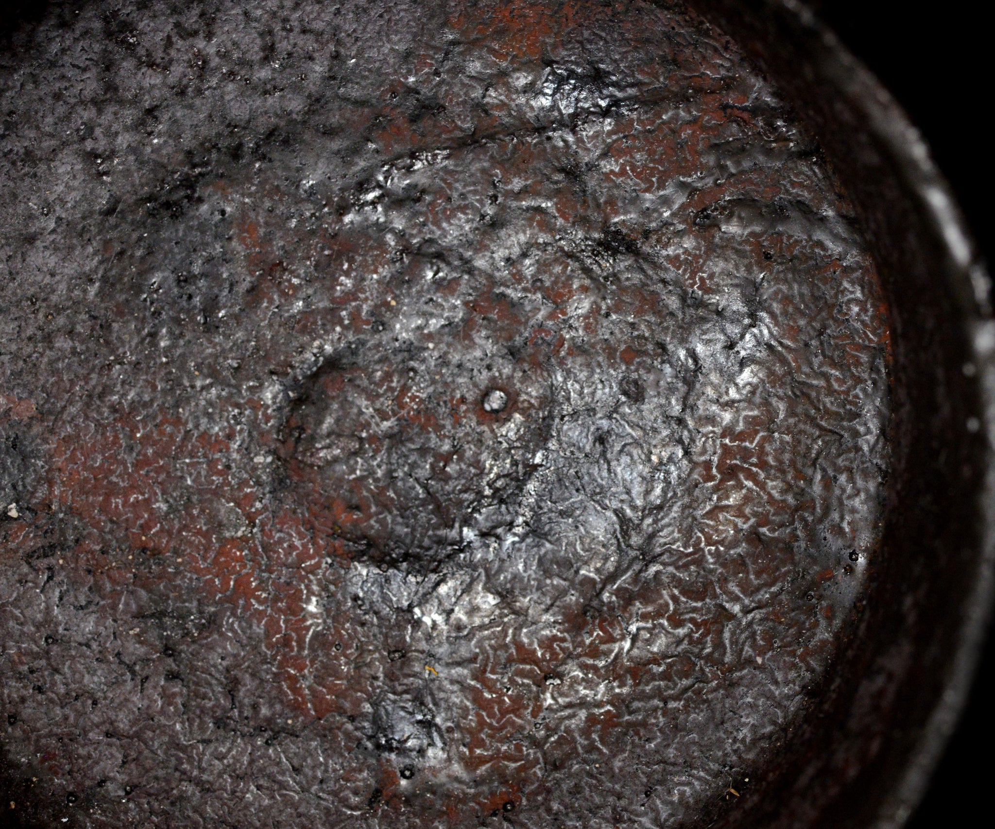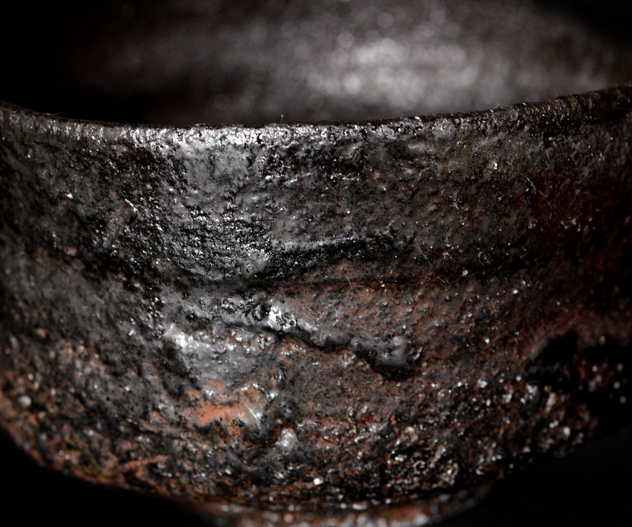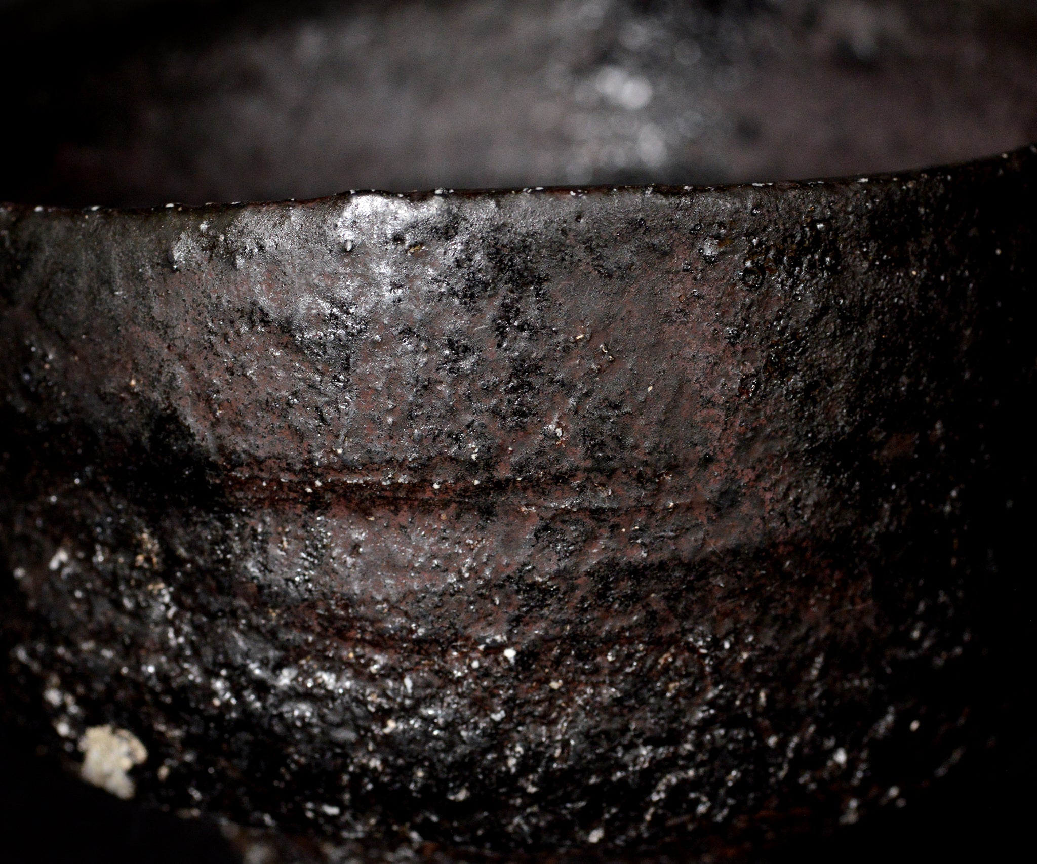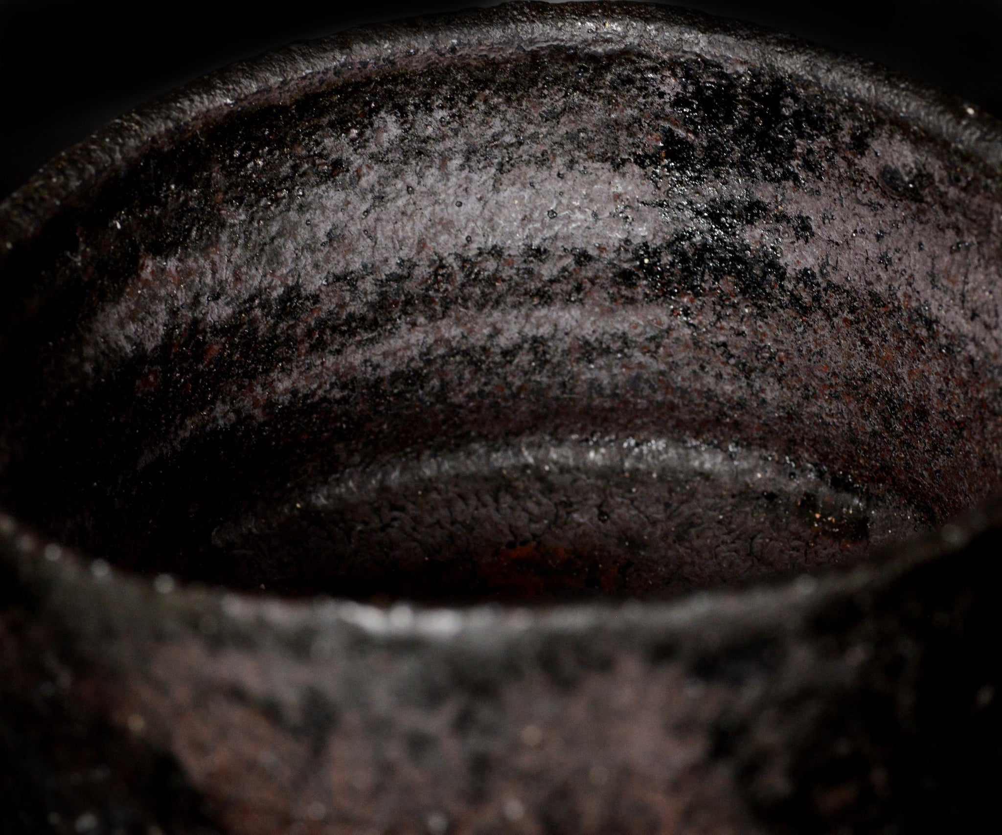 ワイルドな漆黒のボディに、ほのかに赤い窯変が彩りを添える、唐津の陶芸家・三藤るいさんの一碗。強い炎を正面から受け止めた肌は力強く、ざらりとした質感の中に確かな温度を感じさせます。黒の奥から滲むように現れる赤みが、見込みを含み器全体に緊張感と奥行きを与えています。高台は畳付きが白く彩られ、高台内と脇の赤とのコントラストは絶景。炎と土が真正面からぶつかり合って生まれた、野性味と静けさを併せ持つエナジー溢れる一碗です。