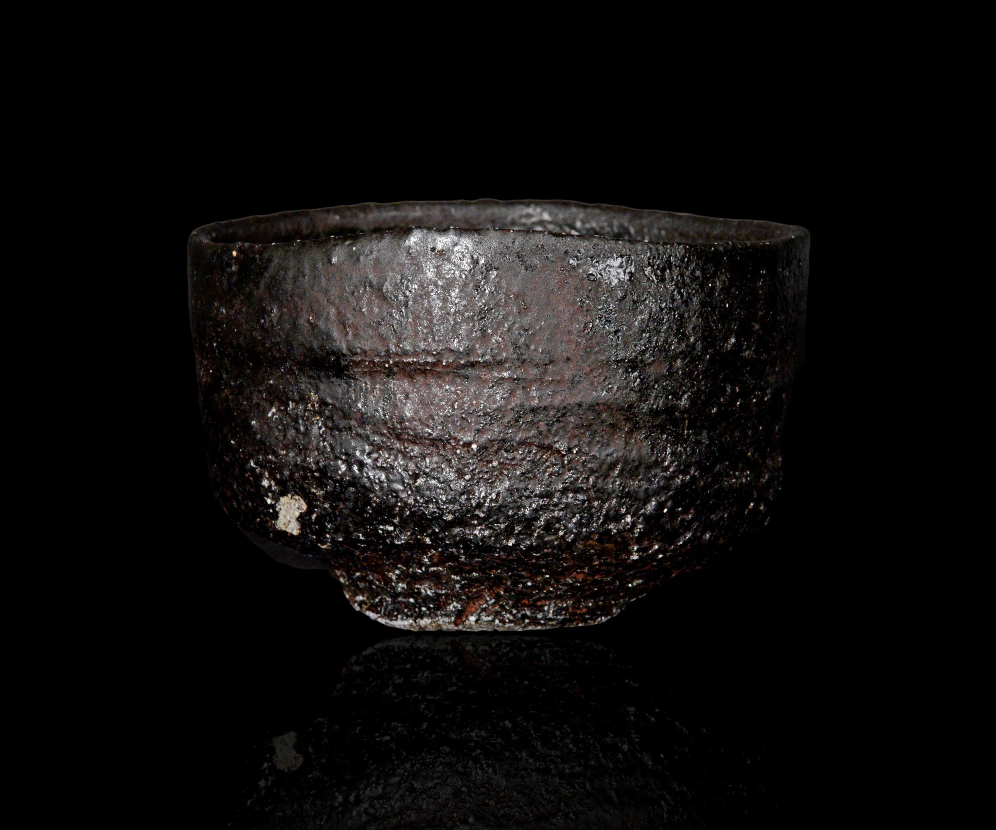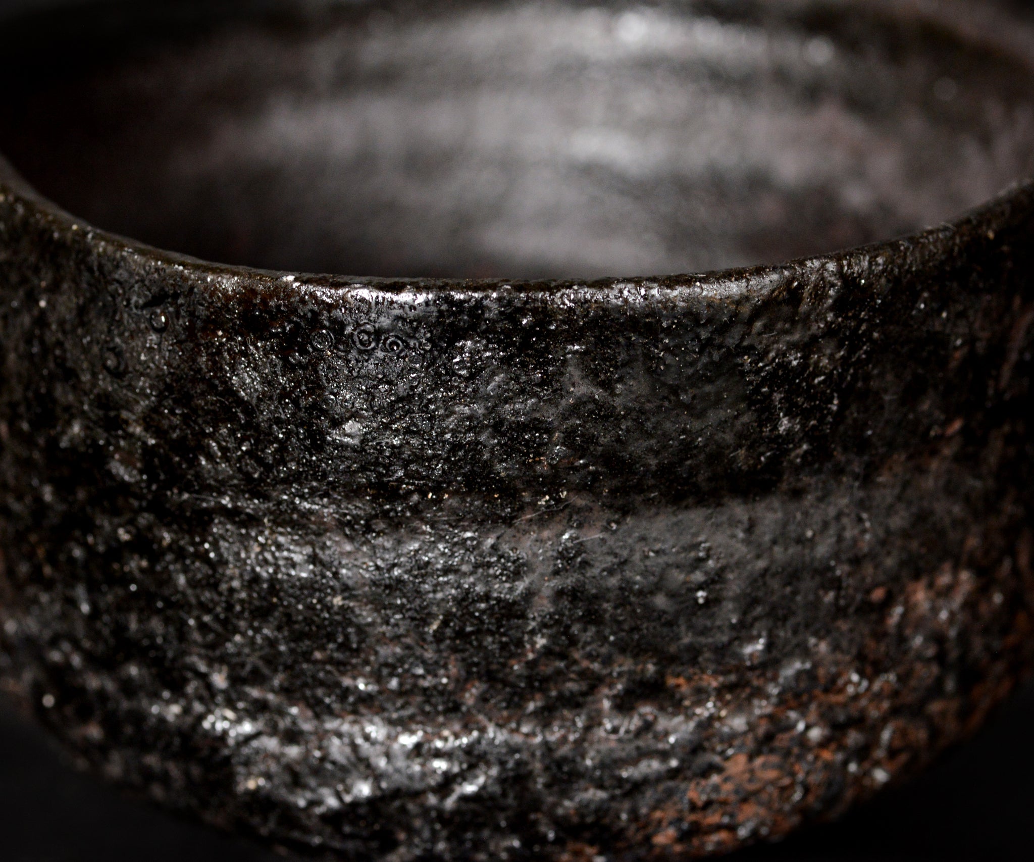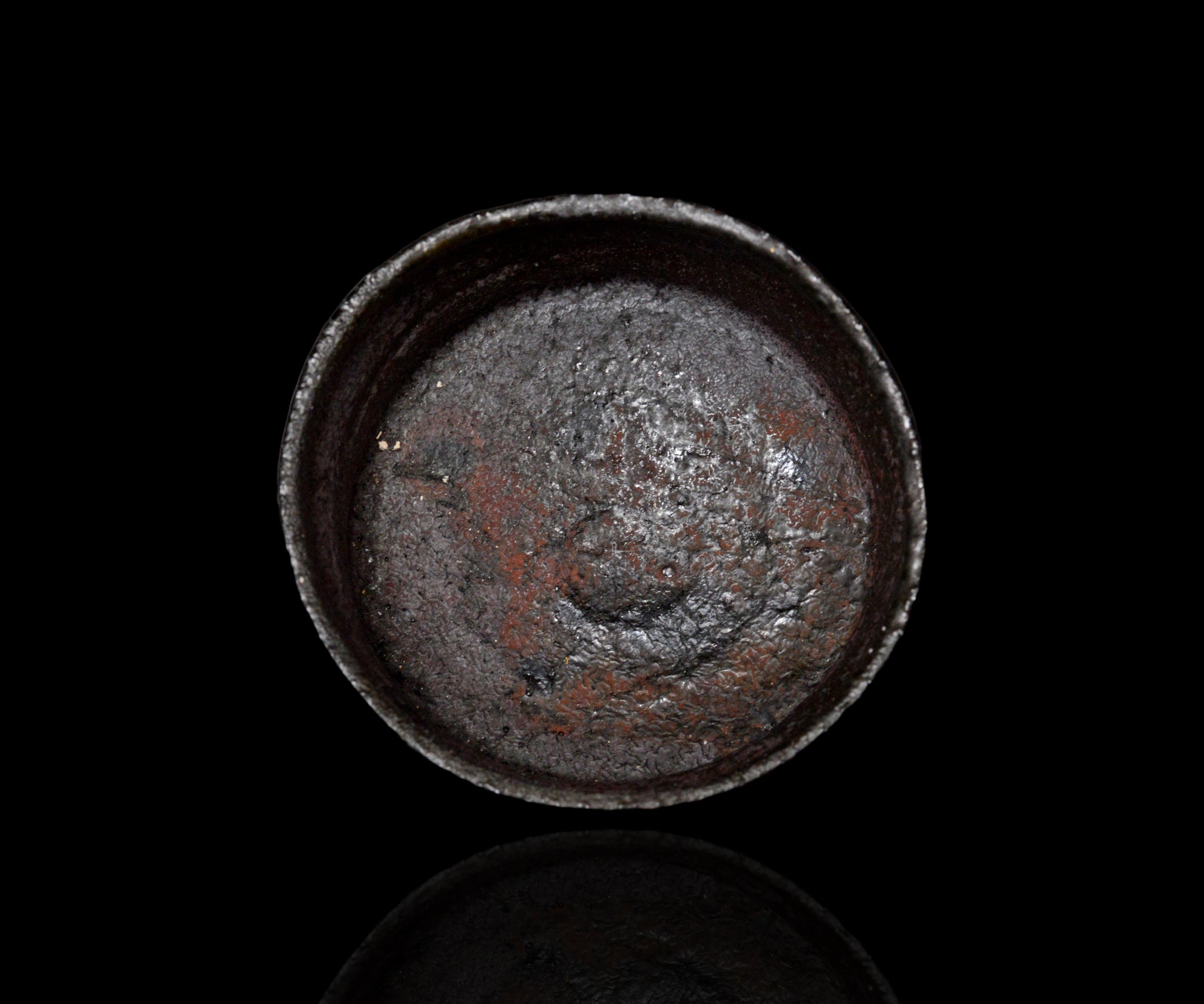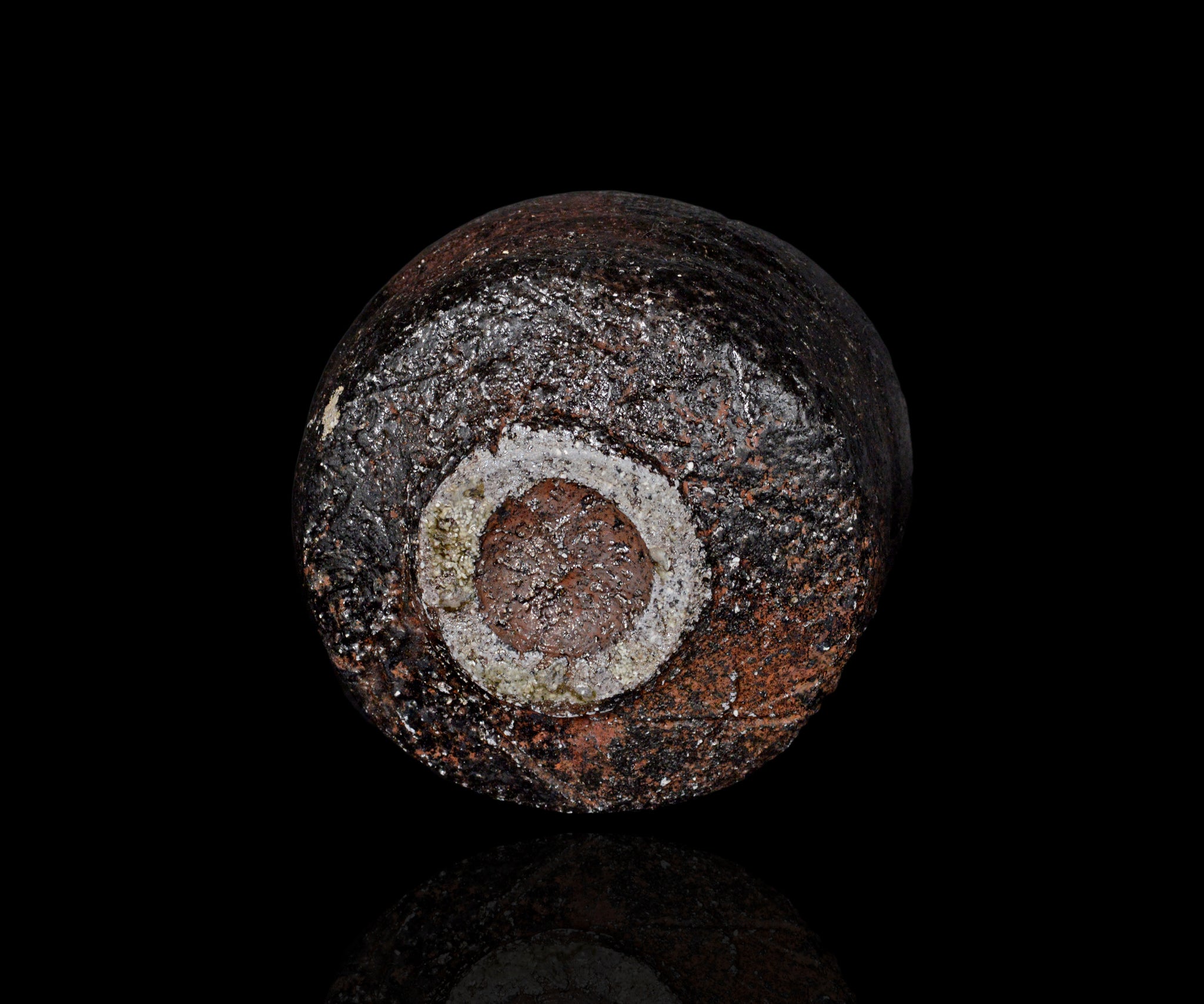 ワイルドな漆黒のボディに、ほのかに赤い窯変が彩りを添える、唐津の陶芸家・三藤るいさんの一碗。強い炎を正面から受け止めた肌は力強く、ざらりとした質感の中に確かな温度を感じさせます。黒の奥から滲むように現れる赤みが、見込みを含み器全体に緊張感と奥行きを与えています。高台は畳付きが白く彩られ、高台内と脇の赤とのコントラストは絶景。炎と土が真正面からぶつかり合って生まれた、野性味と静けさを併せ持つエナジー溢れる一碗です。