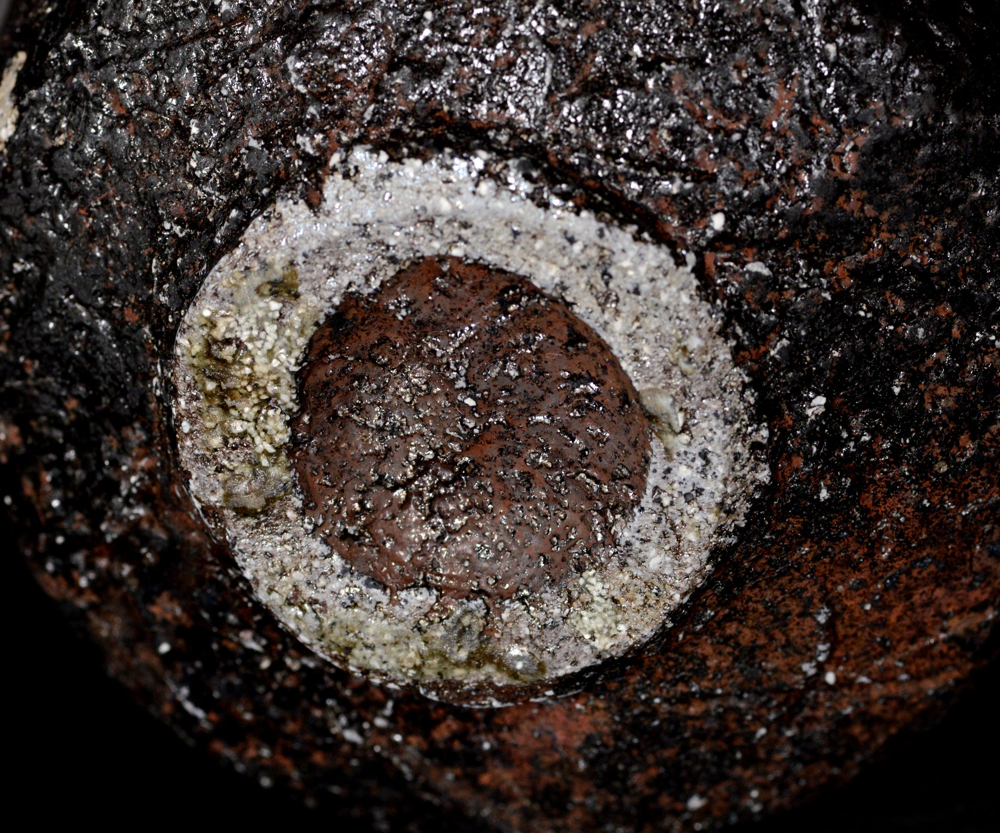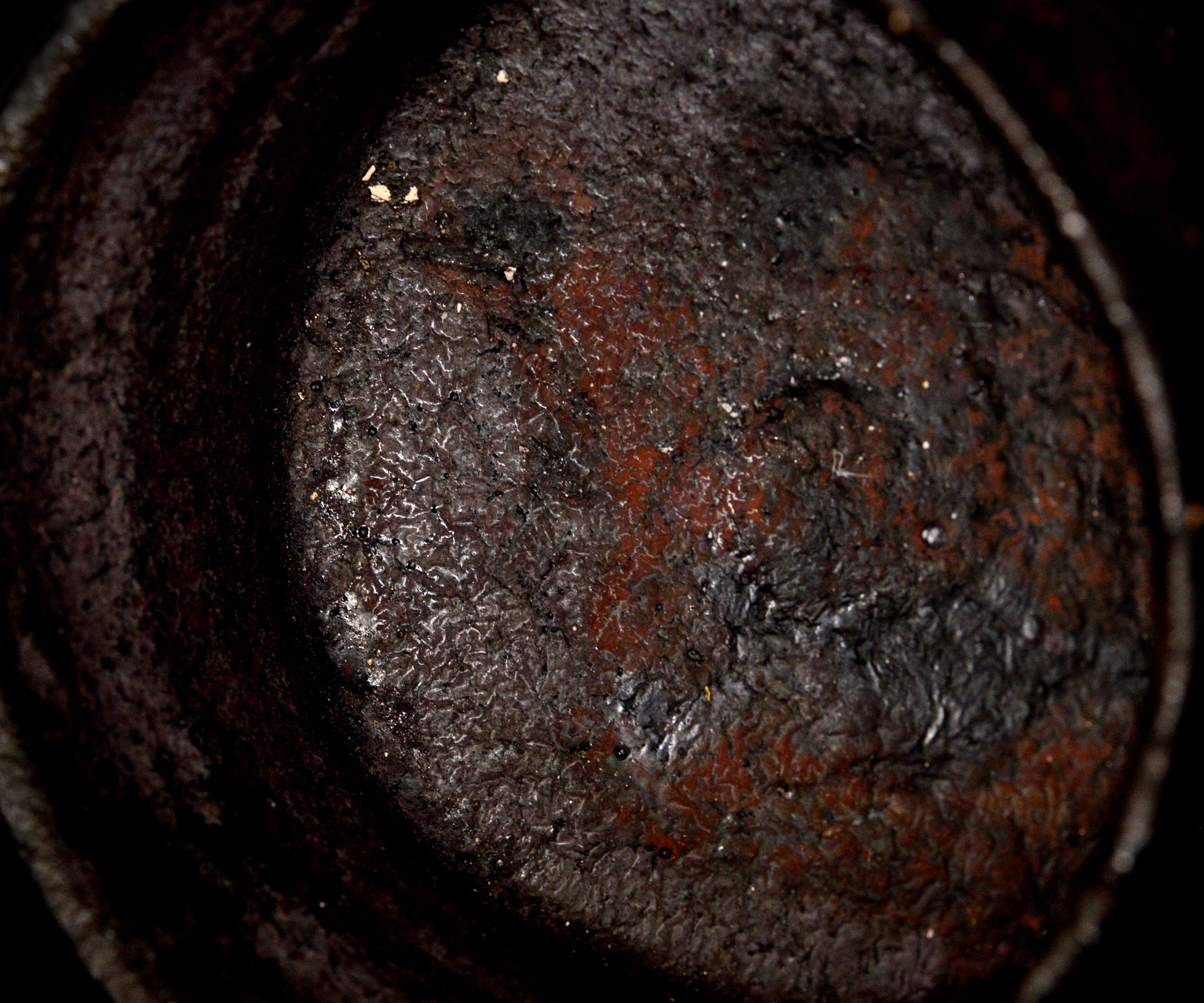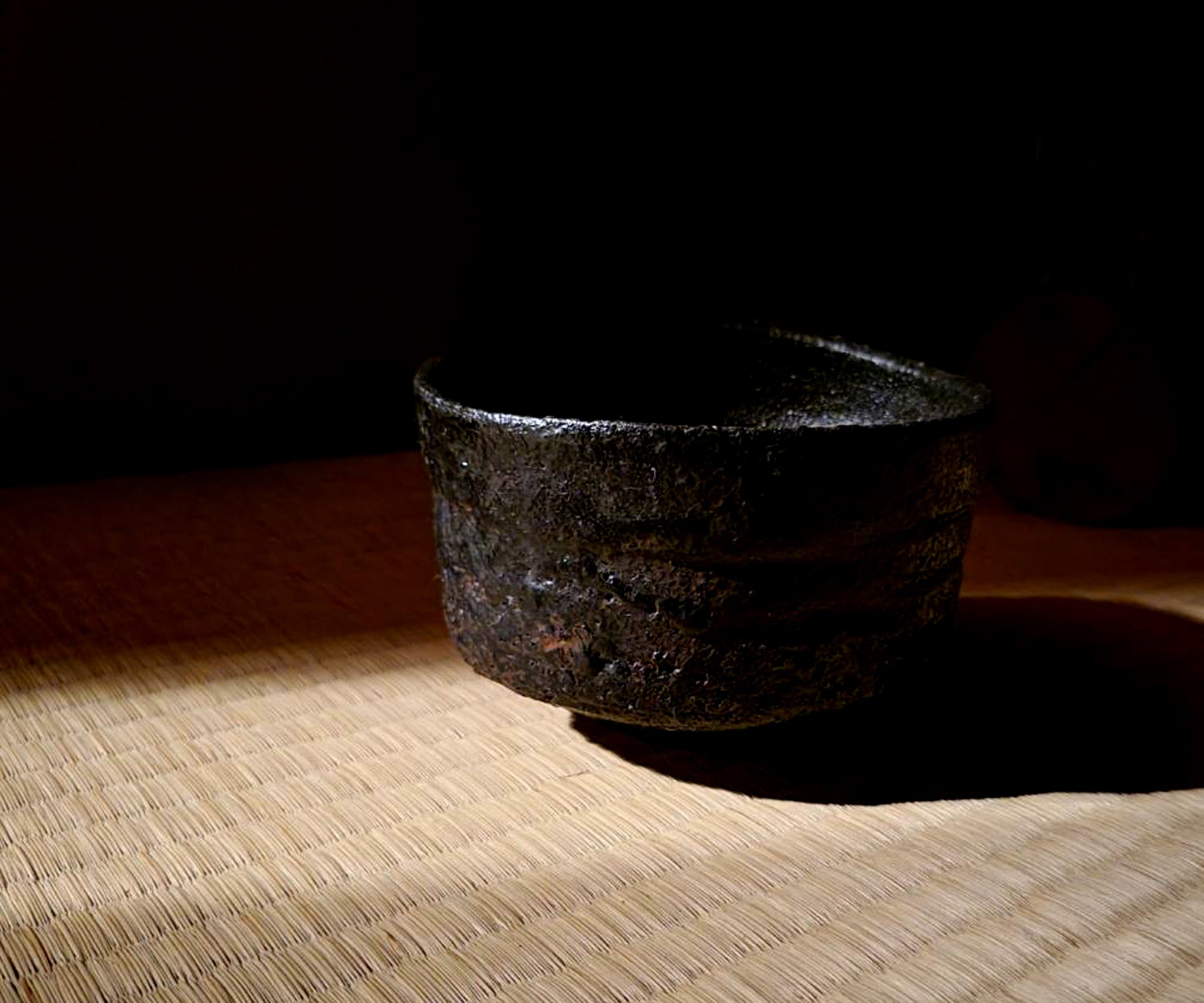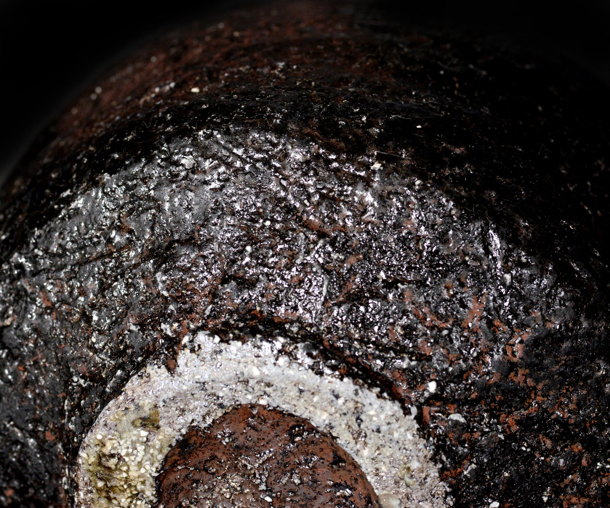ワイルドな漆黒のボディに、ほのかに赤い窯変が彩りを添える、唐津の陶芸家・三藤るいさんの一碗。強い炎を正面から受け止めた肌は力強く、ざらりとした質感の中に確かな温度を感じさせます。黒の奥から滲むように現れる赤みが、見込みを含み器全体に緊張感と奥行きを与えています。高台は畳付きが白く彩られ、高台内と脇の赤とのコントラストは絶景。炎と土が真正面からぶつかり合って生まれた、野性味と静けさを併せ持つエナジー溢れる一碗です。