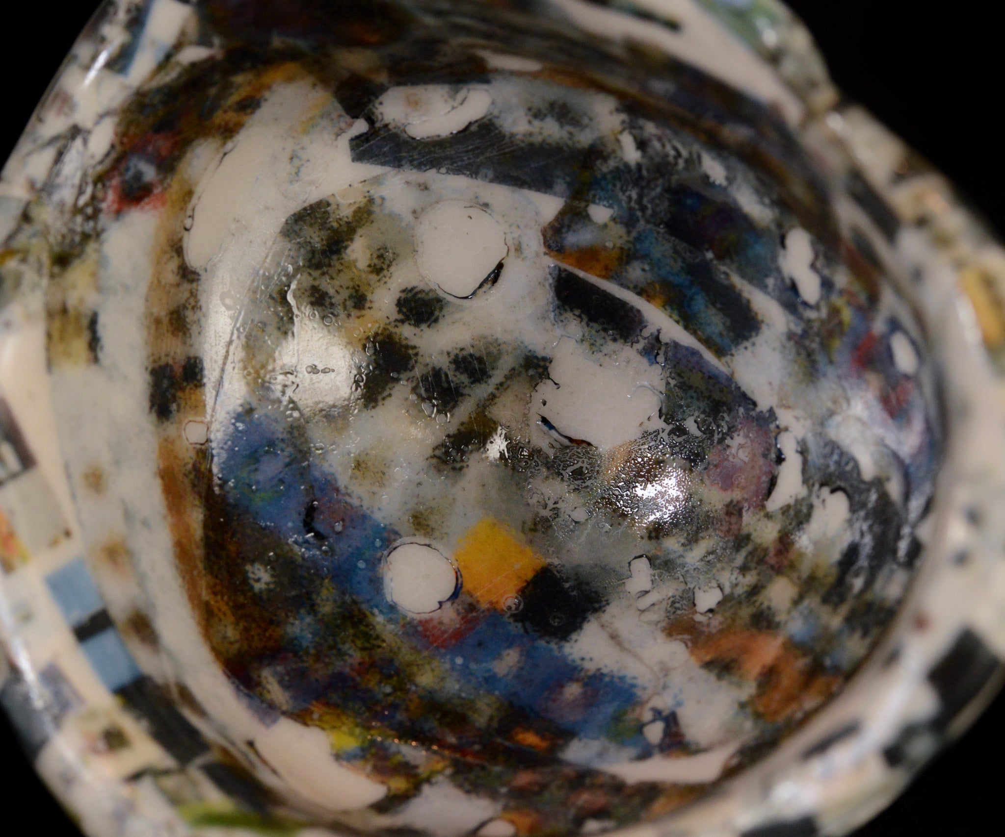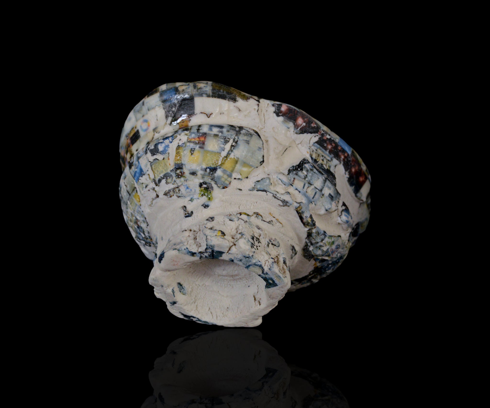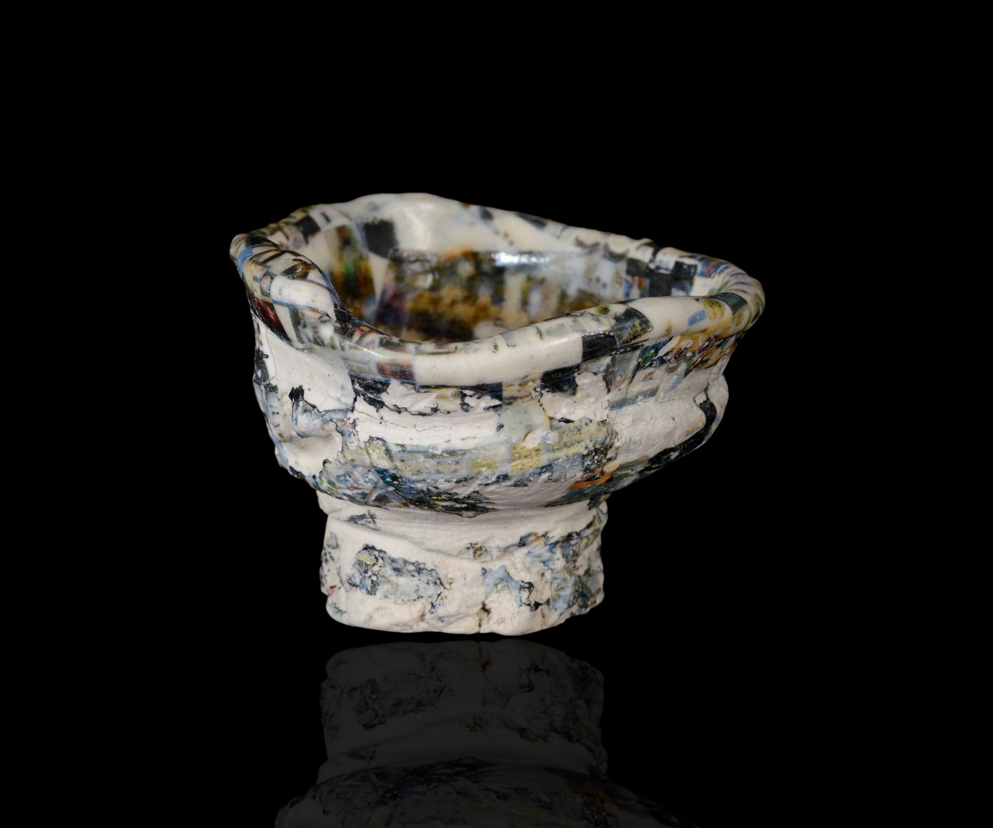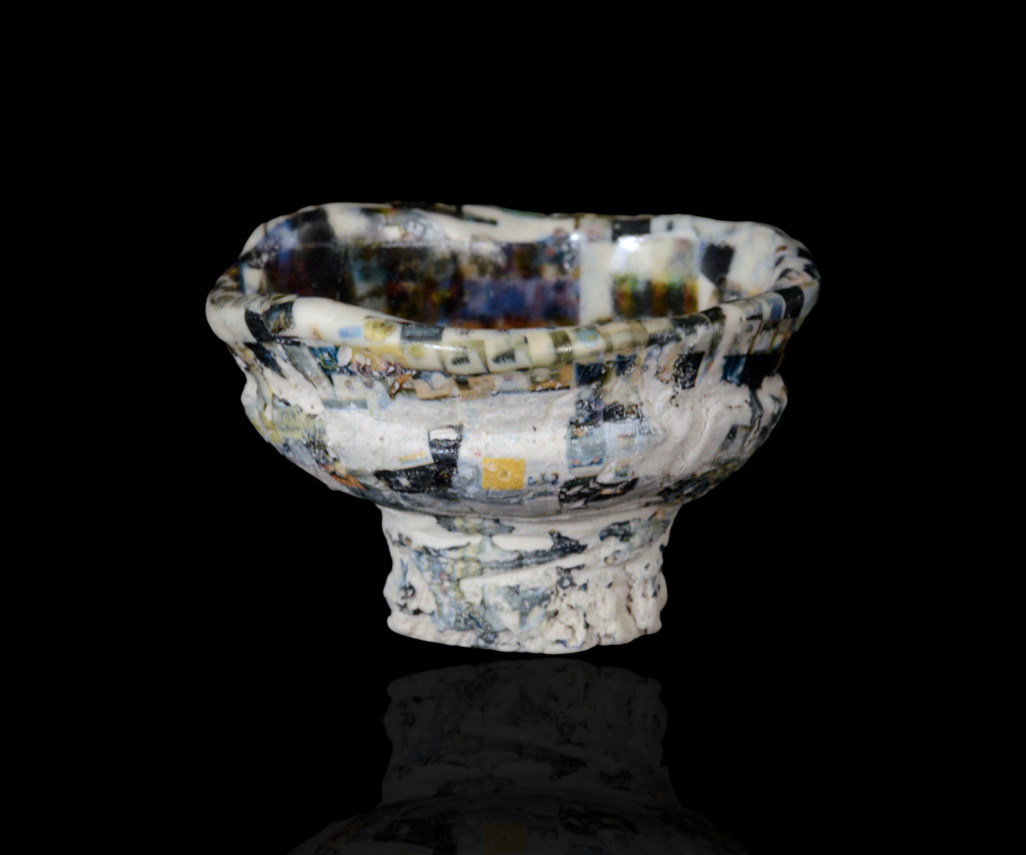 転写やAIを用い独自の作風を生み出している伊勢崎陽太郎さんの最新作、日々箆目ぐい呑。スマートフォンのギャラリーに収められた一年分の写真をスクリーンショットし、それを転写プリントとして用いた、きわめて現代的なアプローチの作品。大ぶりでパワフルな造形と彫り、そして転写のコントラストが楽しめる酒杯です。