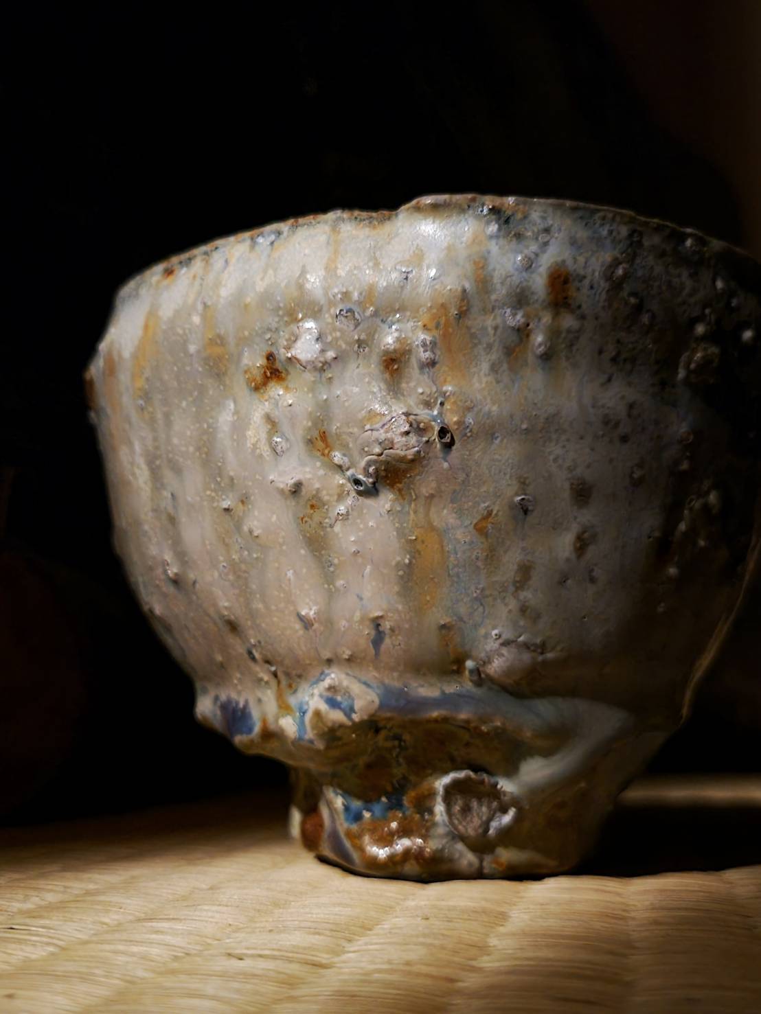 ジェフシャピロさんの最新作、穴窯焼成の茶碗。大きく歪みを伴った美しい造形の碗に、白釉と灰釉を混ぜて作ったという釉薬がたっぷりとかけられた作品。流れる釉薬と窯変が非常に美しく、ブルーやイエロー、ゴールドと様々な色合いが楽しめます。見込みにも灰釉がカセを作りながら流れ、茶溜まりには青い窯変が現れています。独特の削りを施したシャープな高台も健在で、ガラスのような釉溜まりや貝目、石爆ととにかく見どころが多い逸品。その造形と色合いから「エベレスト」の銘が号されています。