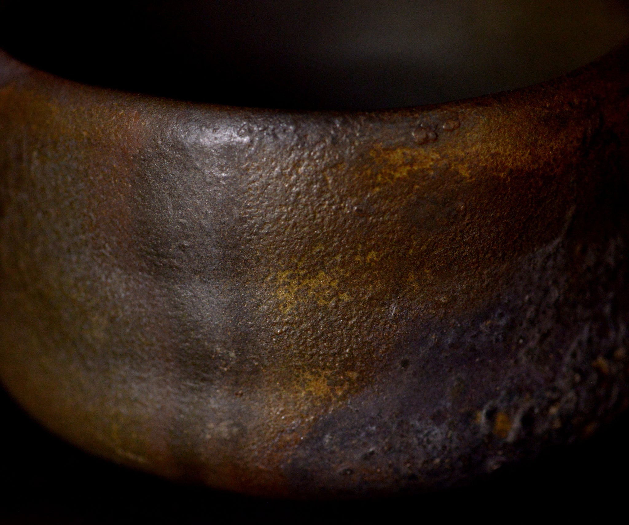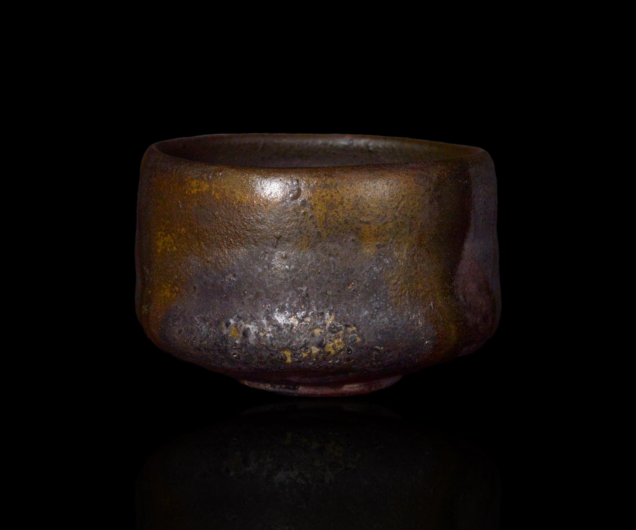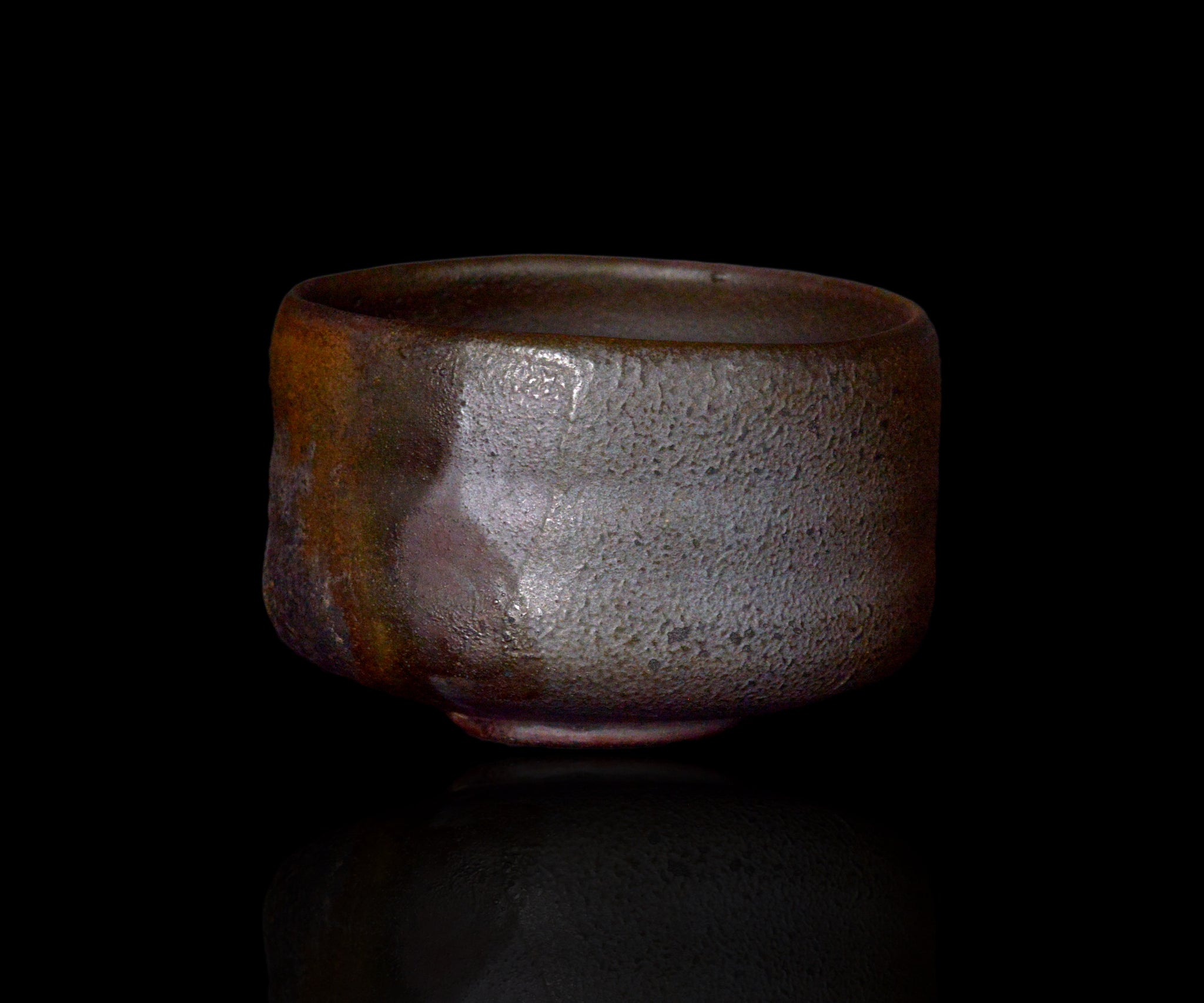 唐津の陶芸家・三藤るいさんによる黒唐津茶碗。黒の中に黄金色や赤みを帯びた斑など、焼成によって生まれた多彩な表情が重なり合い、深い奥行きを感じさせる作品。正面には艶やかなゴールドと荒々しい黒が強いコントラストを成し、茶盌を回すことで片身替のように移ろう景色が立ち現れます。カセた見込みや高台脇にも豊かな色彩の変化が現れ、どこを見ても見どころに満ちています。手に取ると自然に収まる造形で、鑑賞と実用の双方を高い次元で兼ね備えた一碗です。