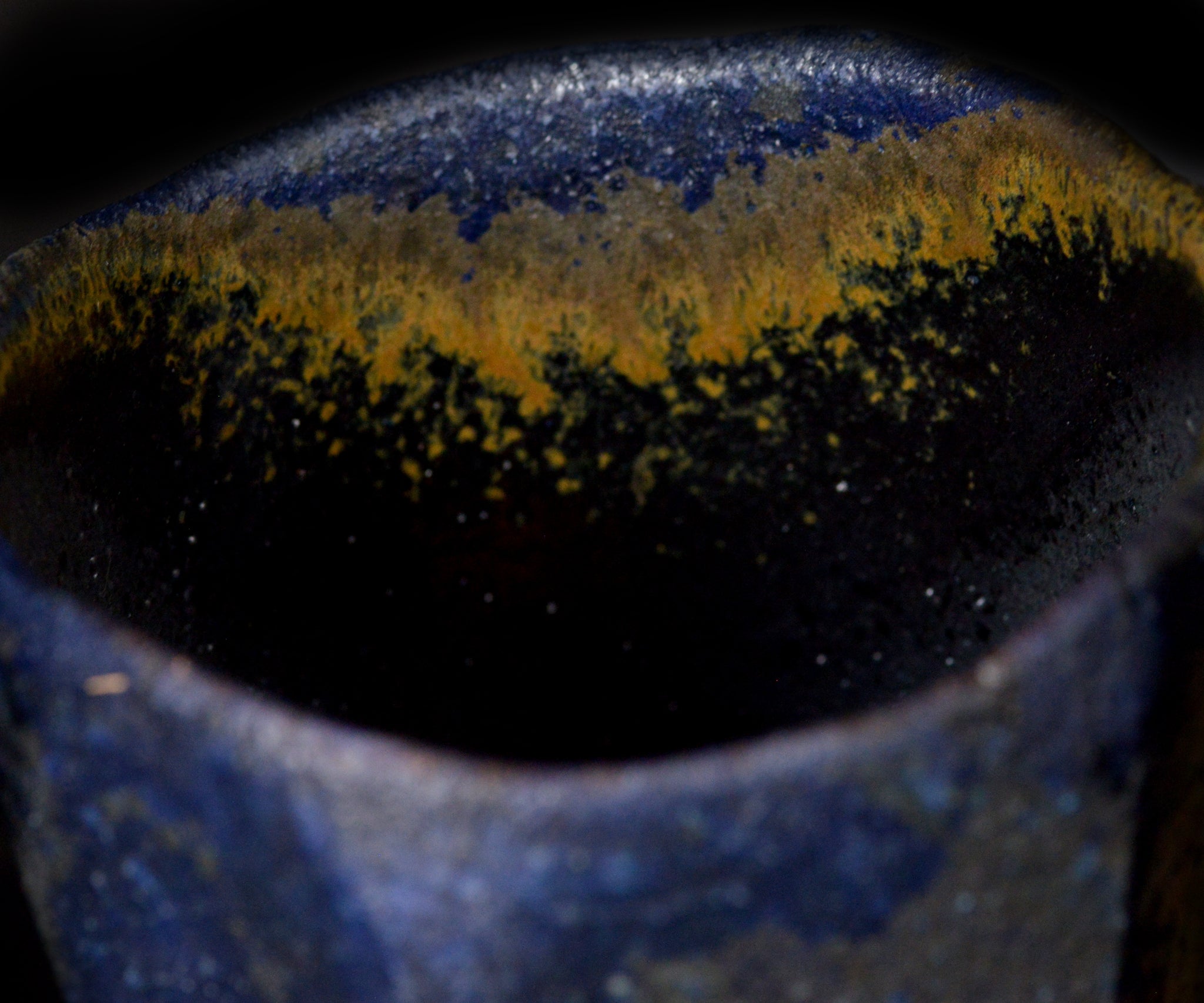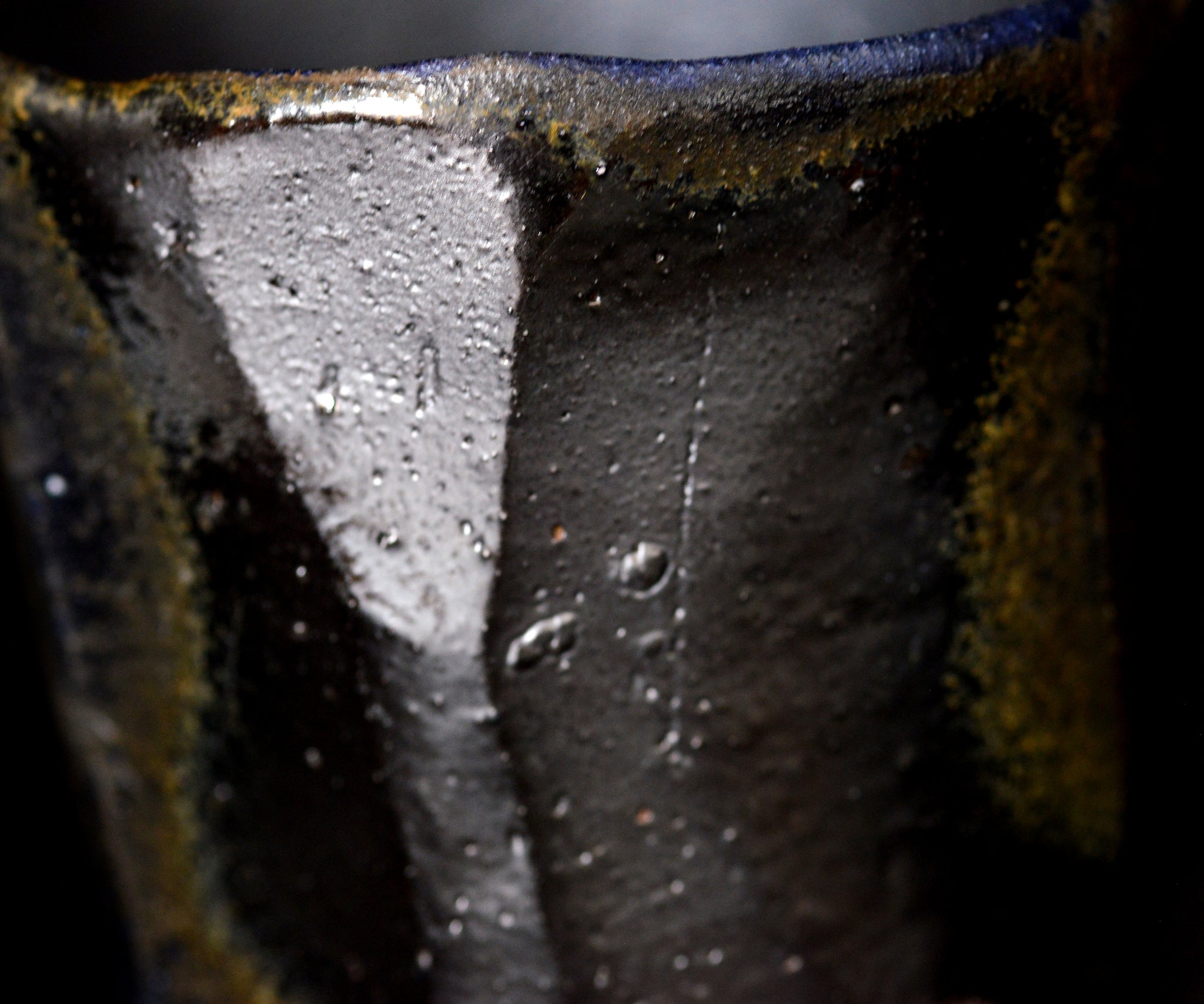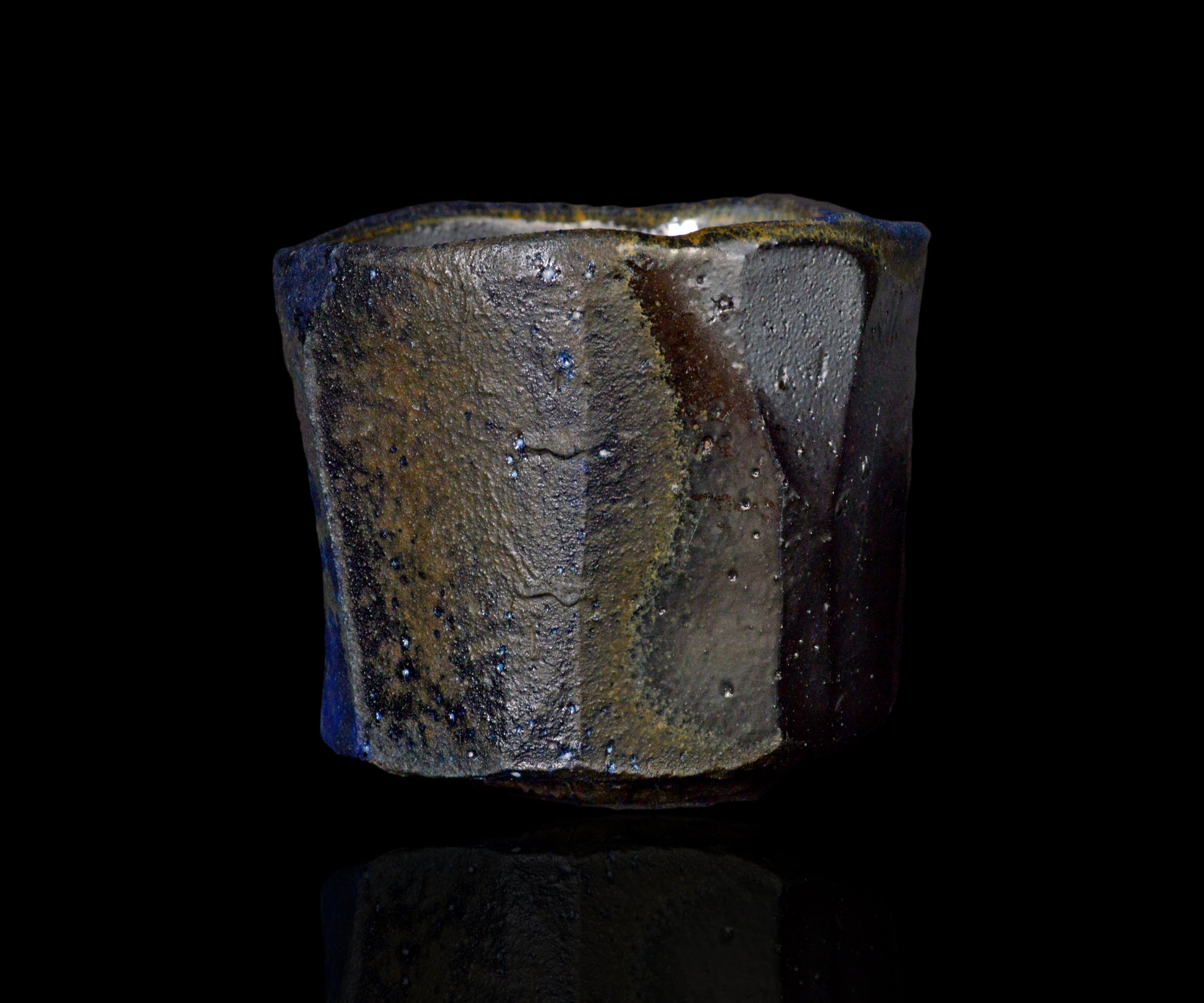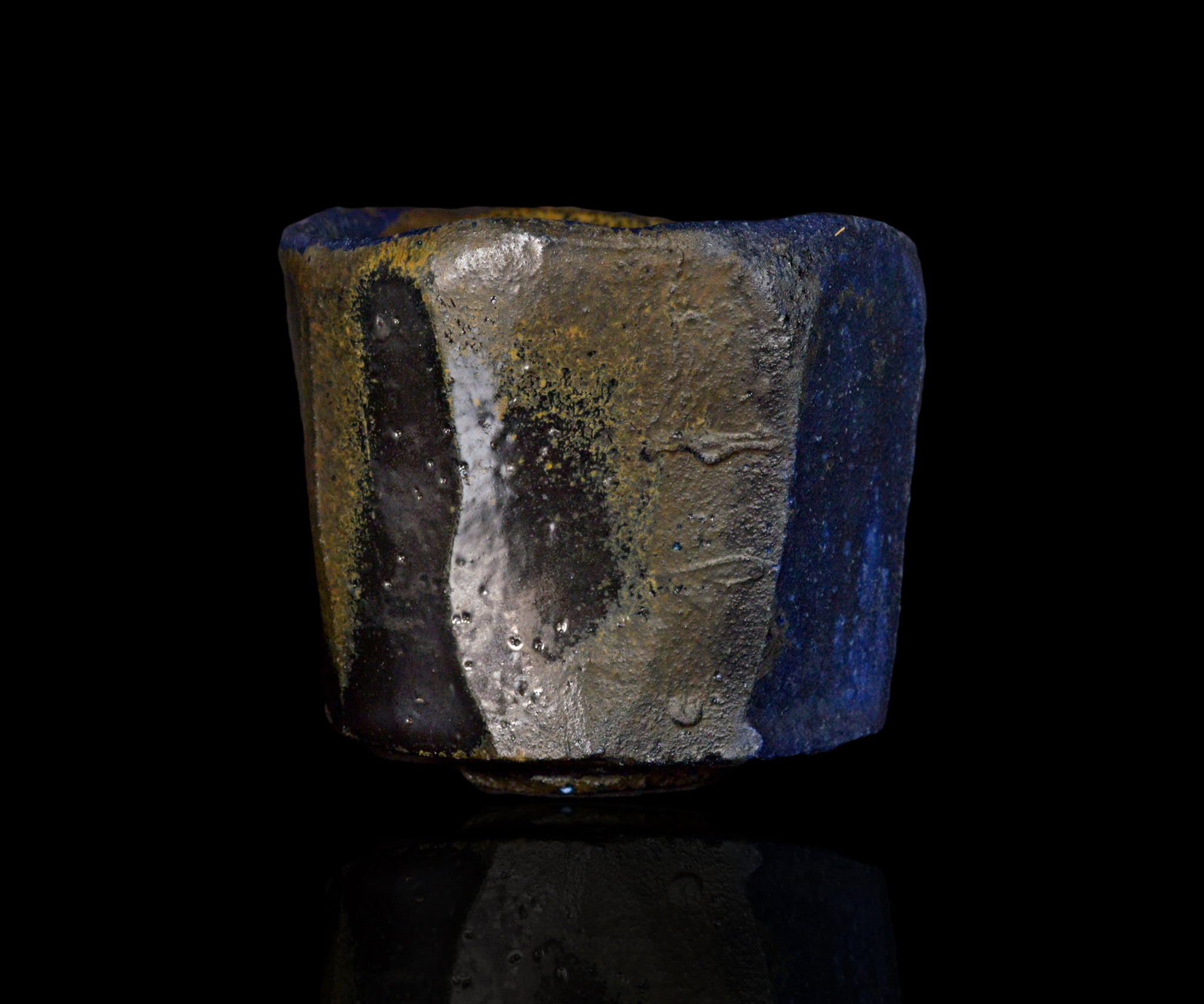 茨城県で作陶する後関裕士さんのマスターピース、面取りによって生まれた新たな造形は「黒削茶盌」と名づけられた新作。ヴァンゴッホの星月夜を思わせる景色が現れていることから、La nuit étoiléeコレクションと称されています。力強い動きのあるフォルムに、青や黄金の窯変が重なり合い、独特のうねりと華やかさを生み出しています。見込みには淡く緑を帯びた灰被りの窯変が広がり、高台脇にも蒼が流れ、黄金の窯変もしっかりと現れております。削りによる光のコントラストも美しい、360°どの角度からも楽しめる逸品です。