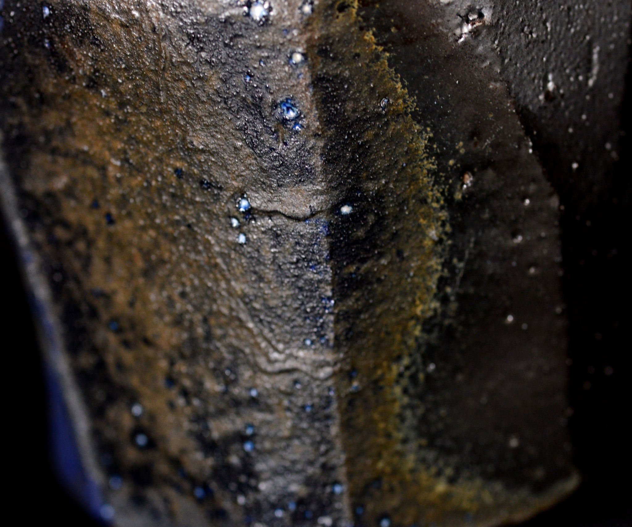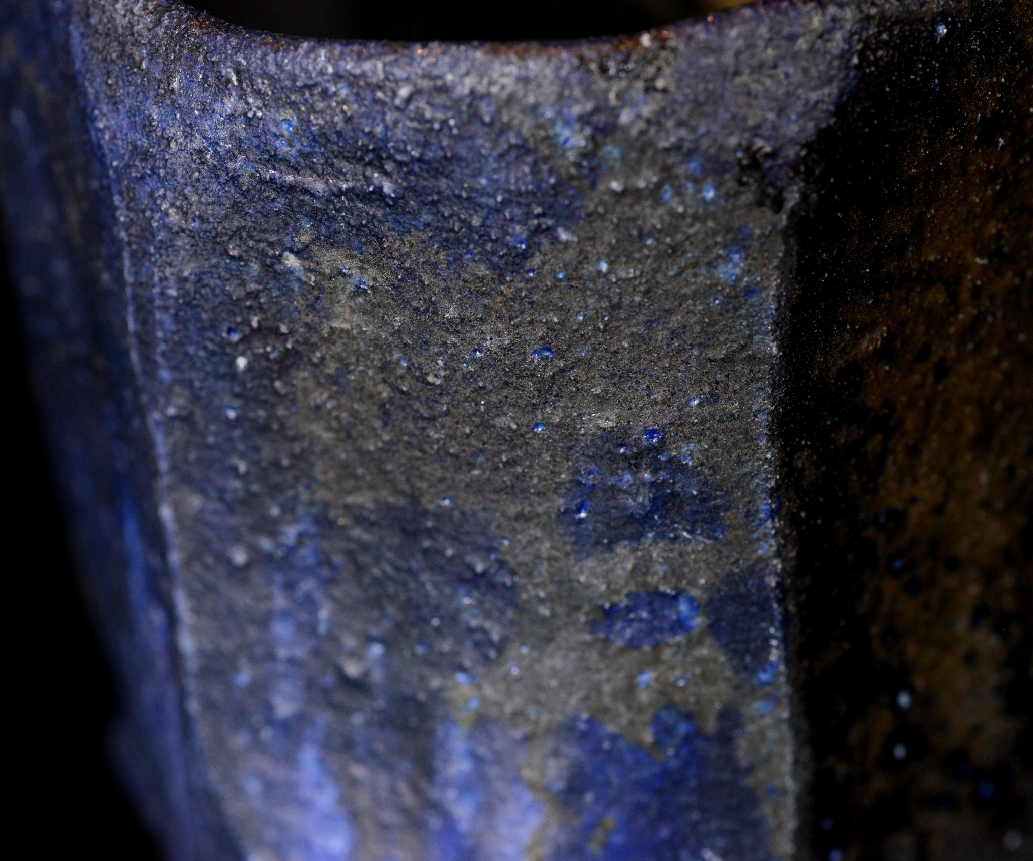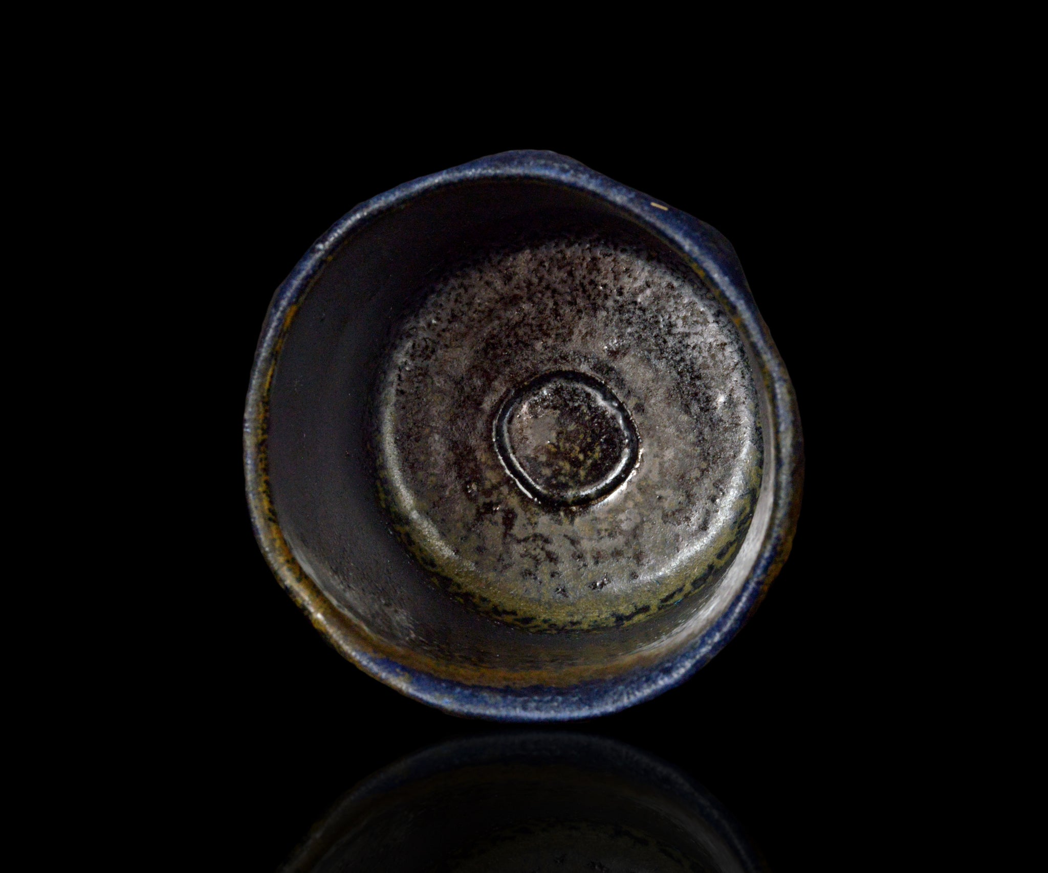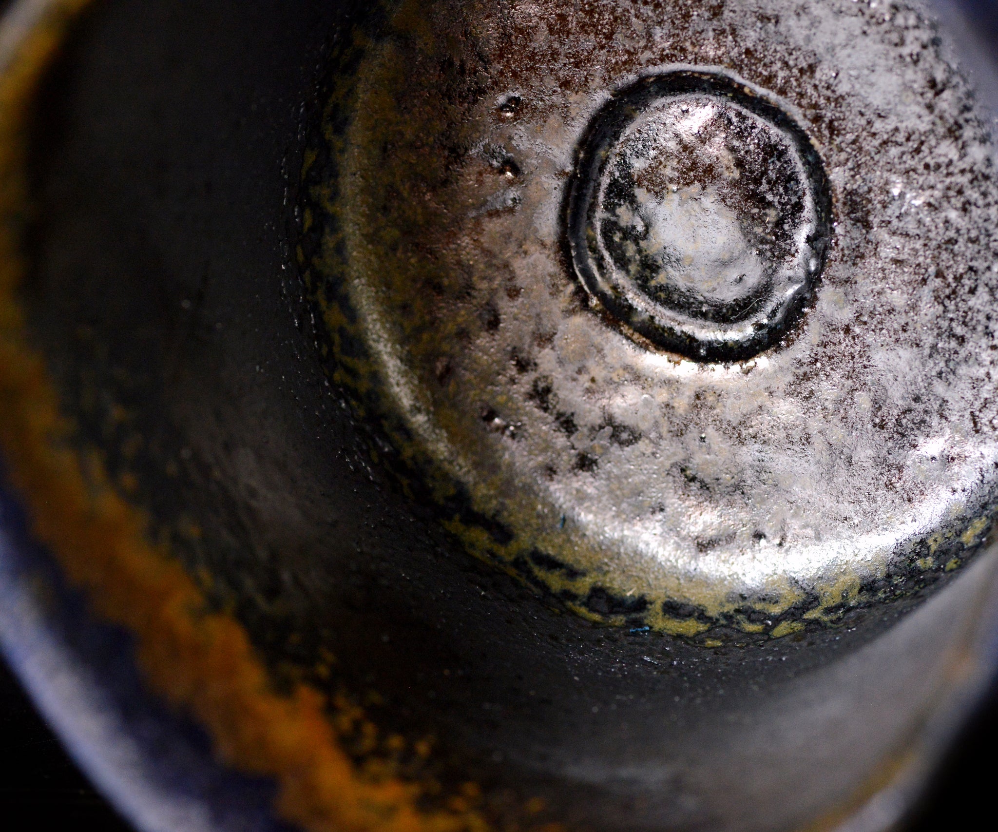 茨城県で作陶する後関裕士さんのマスターピース、面取りによって生まれた新たな造形は「黒削茶盌」と名づけられた新作。ヴァンゴッホの星月夜を思わせる景色が現れていることから、La nuit étoiléeコレクションと称されています。力強い動きのあるフォルムに、青や黄金の窯変が重なり合い、独特のうねりと華やかさを生み出しています。見込みには淡く緑を帯びた灰被りの窯変が広がり、高台脇にも蒼が流れ、黄金の窯変もしっかりと現れております。削りによる光のコントラストも美しい、360°どの角度からも楽しめる逸品です。