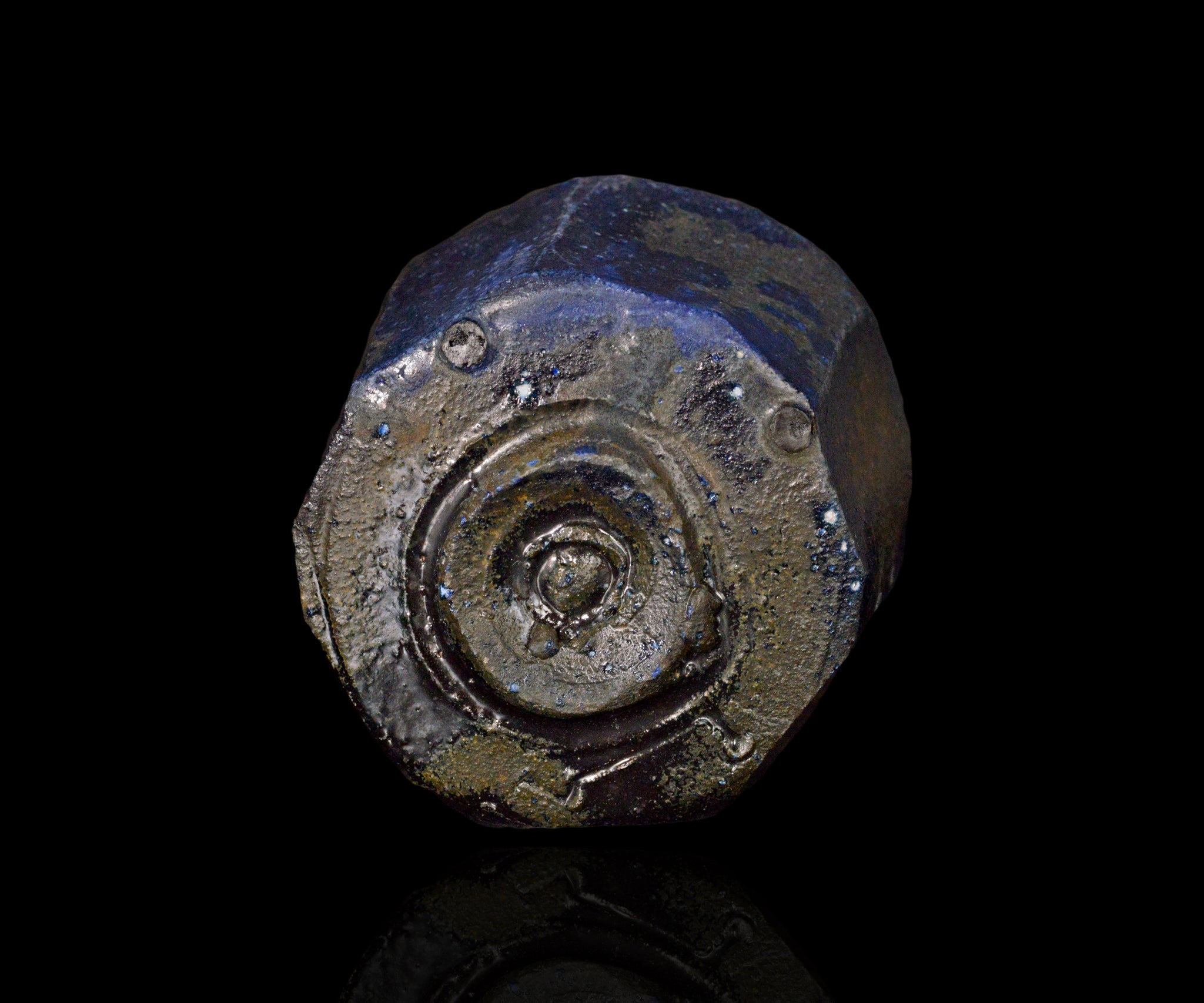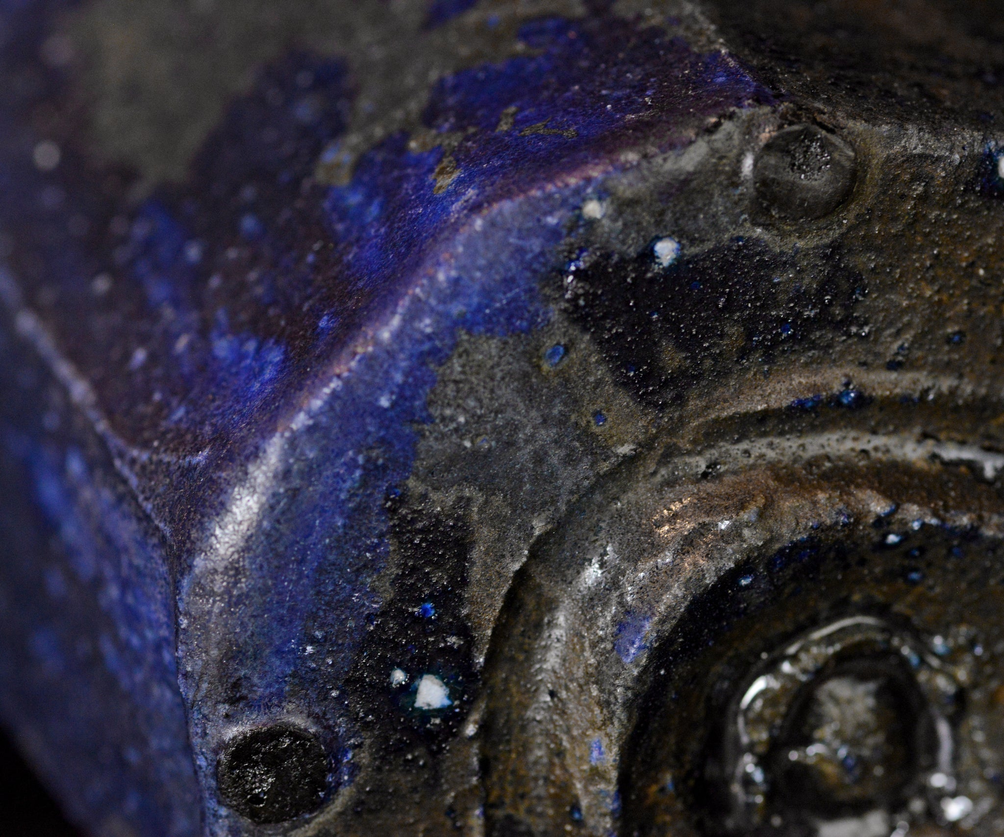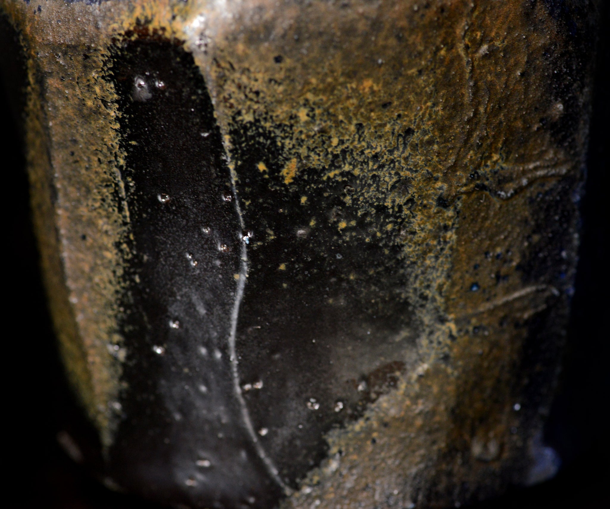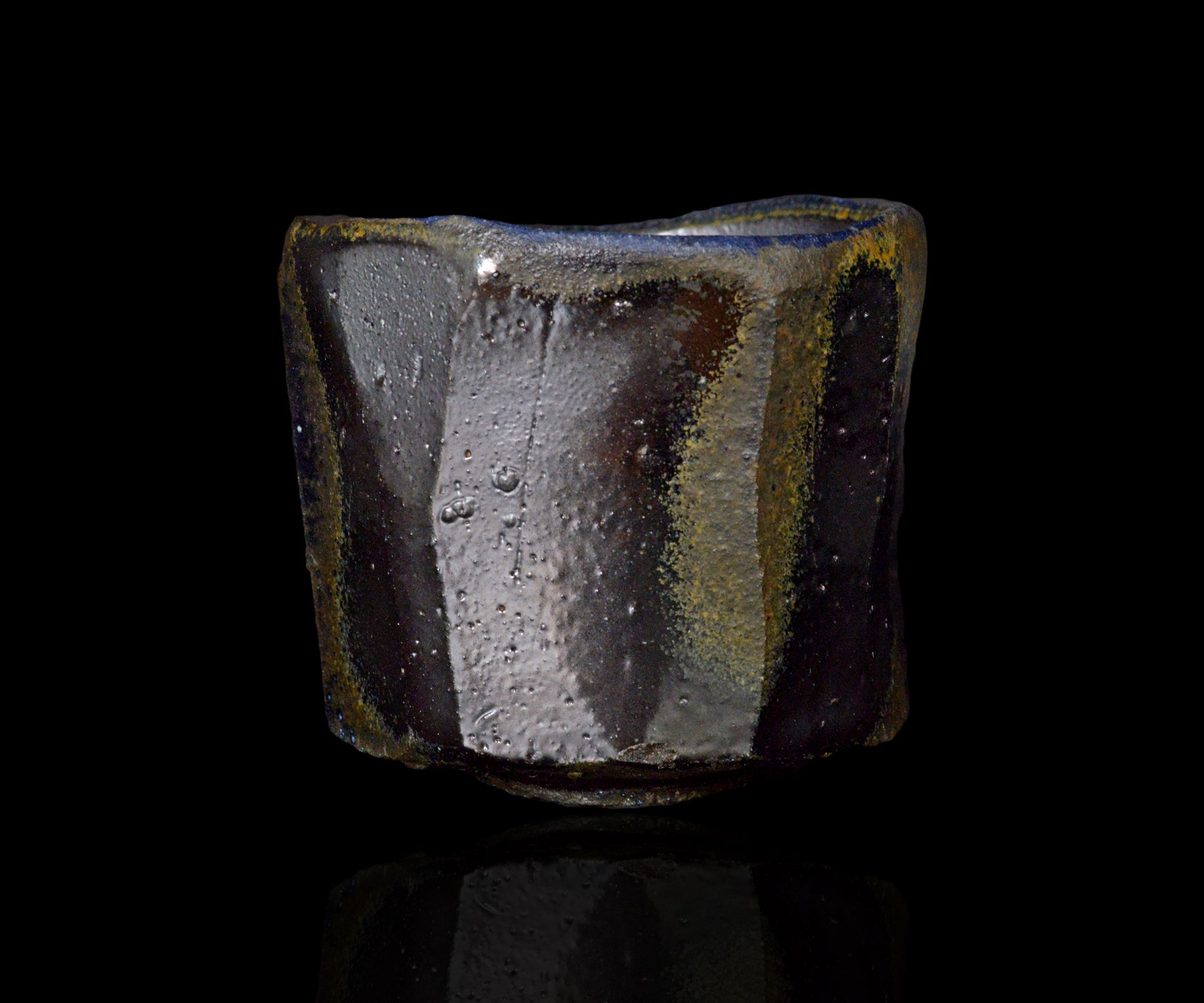 茨城県で作陶する後関裕士さんのマスターピース、面取りによって生まれた新たな造形は「黒削茶盌」と名づけられた新作。ヴァンゴッホの星月夜を思わせる景色が現れていることから、La nuit étoiléeコレクションと称されています。力強い動きのあるフォルムに、青や黄金の窯変が重なり合い、独特のうねりと華やかさを生み出しています。見込みには淡く緑を帯びた灰被りの窯変が広がり、高台脇にも蒼が流れ、黄金の窯変もしっかりと現れております。削りによる光のコントラストも美しい、360°どの角度からも楽しめる逸品です。