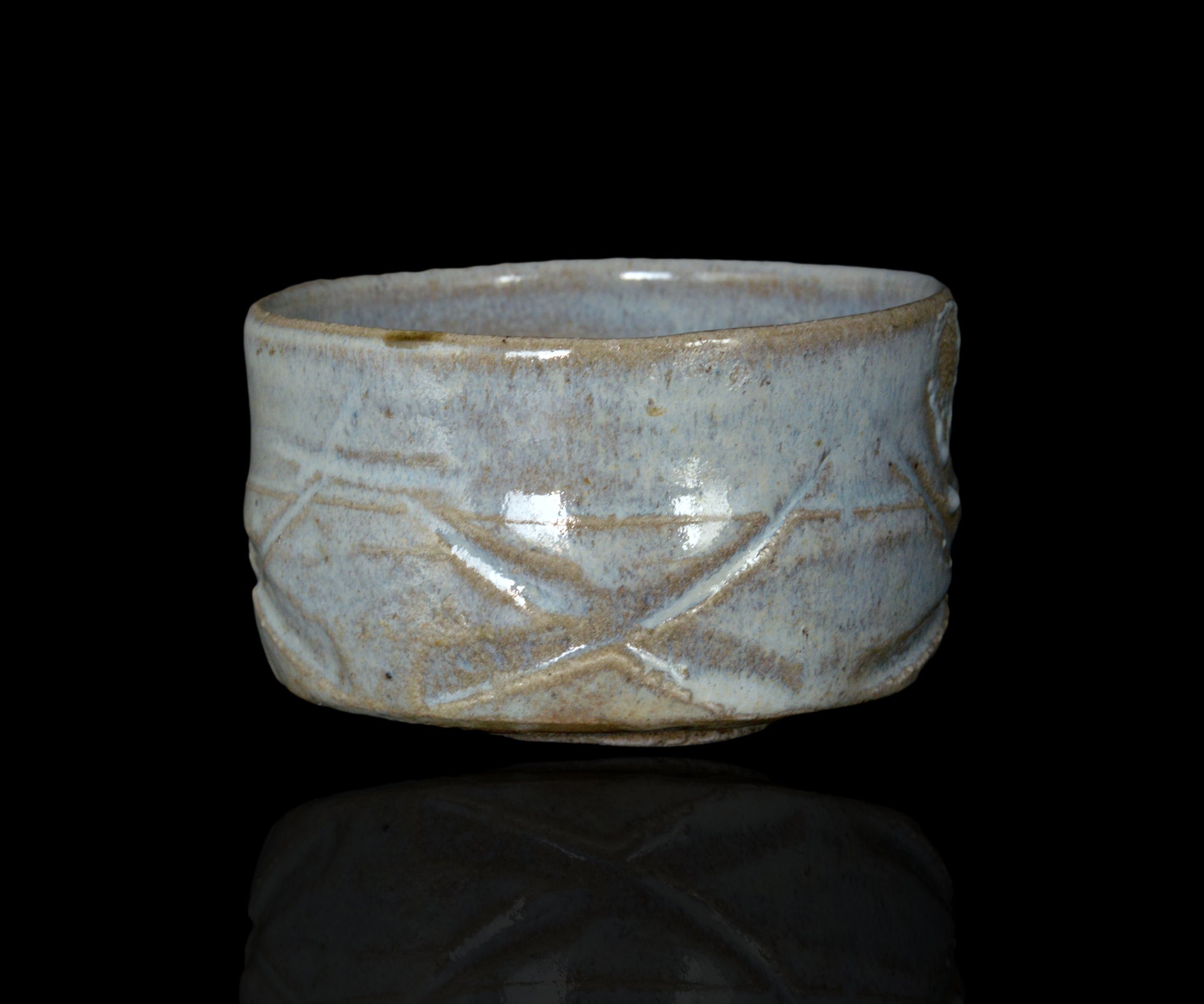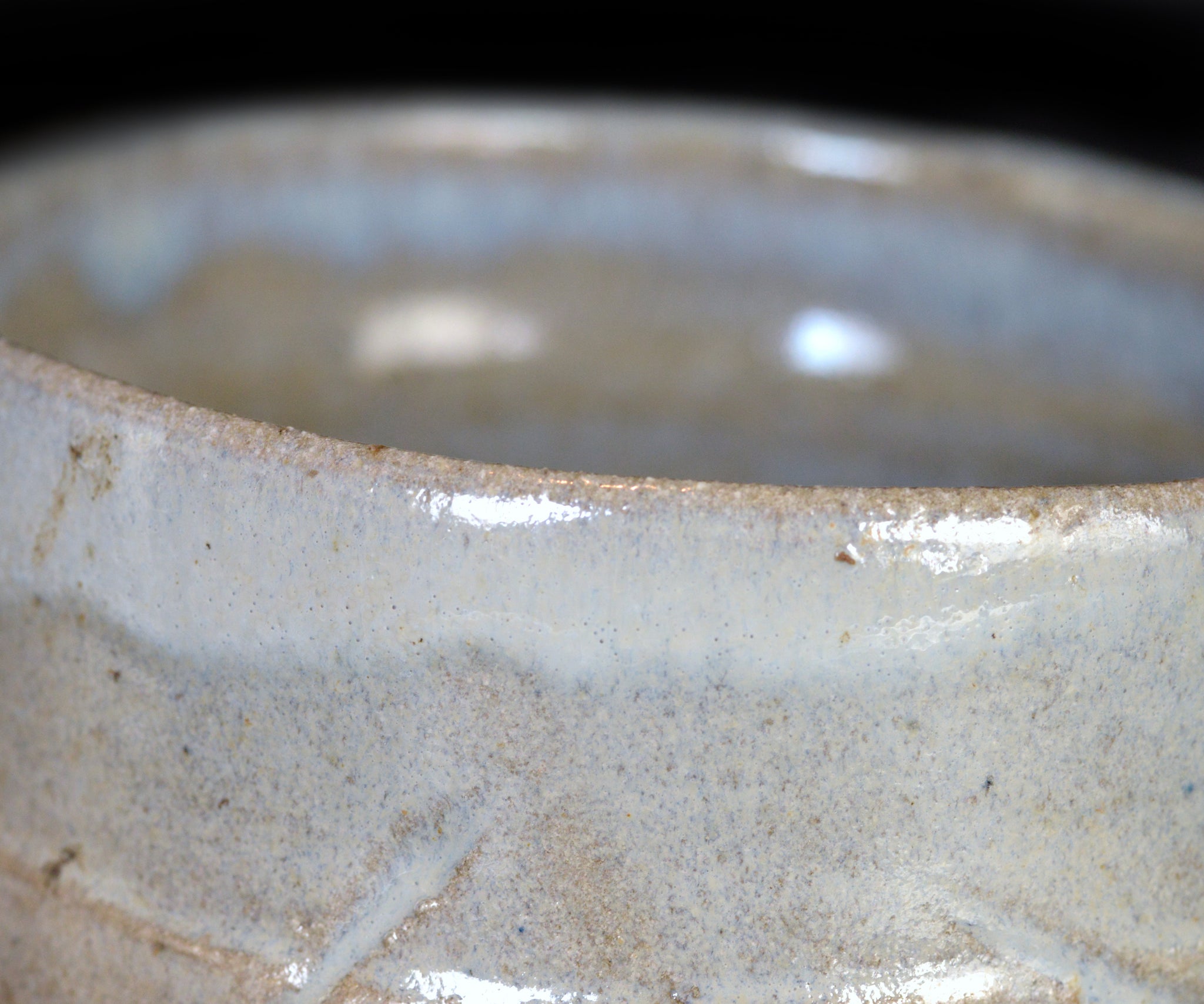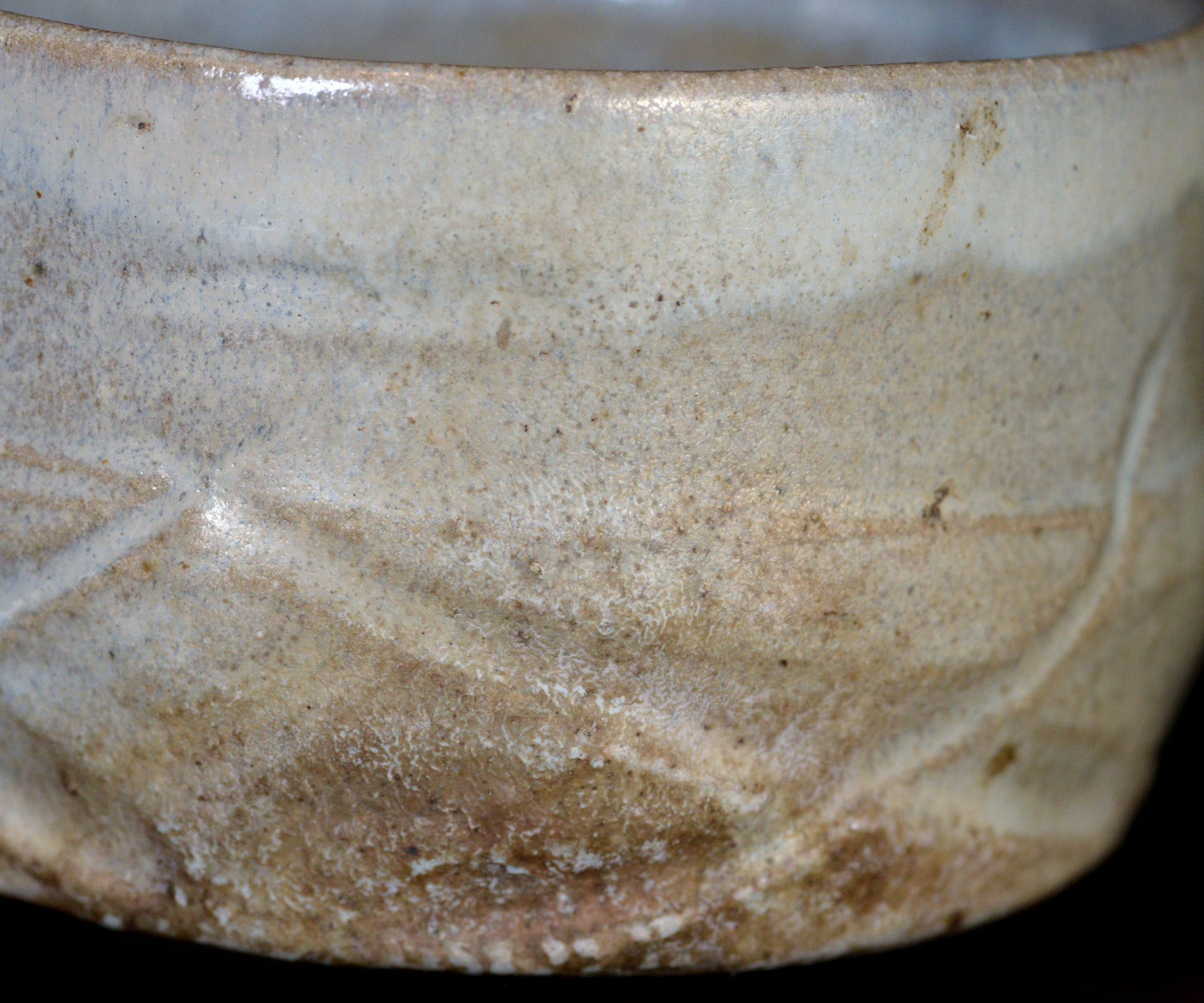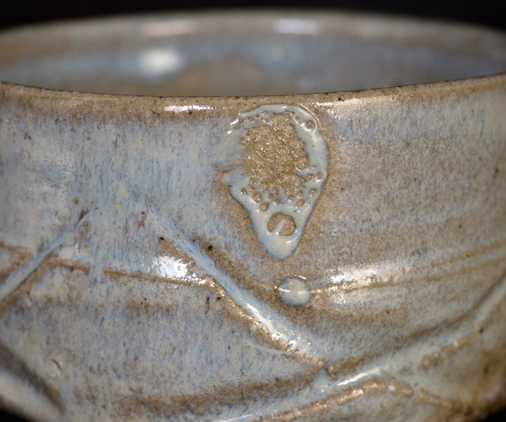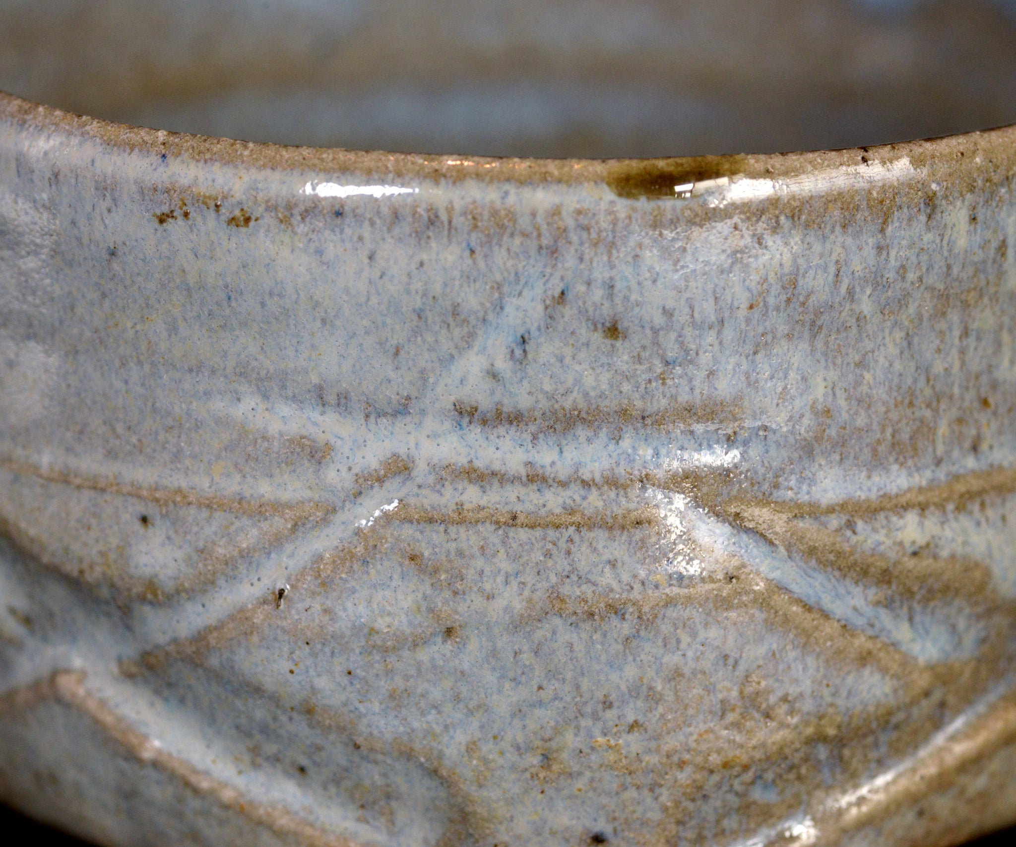 唐津の陶芸家、三藤るいさんの斑唐津茶碗。✗の彫りが施されたボディに白釉が青く変化し、美しい景色を描き出しています。茶碗を回すと、引き落としによるカセや力強い縮れが現れ、その鮮やかなコントラストを堪能できます。口縁から見込みにかけては青が流れ込み、内側にも斑状の窯変がしっかりと表れています。さらに、引き落としによる釉薬の変化と、強火で焼き締められた土味が感じられる高台脇の風合いも大きな見どころ。