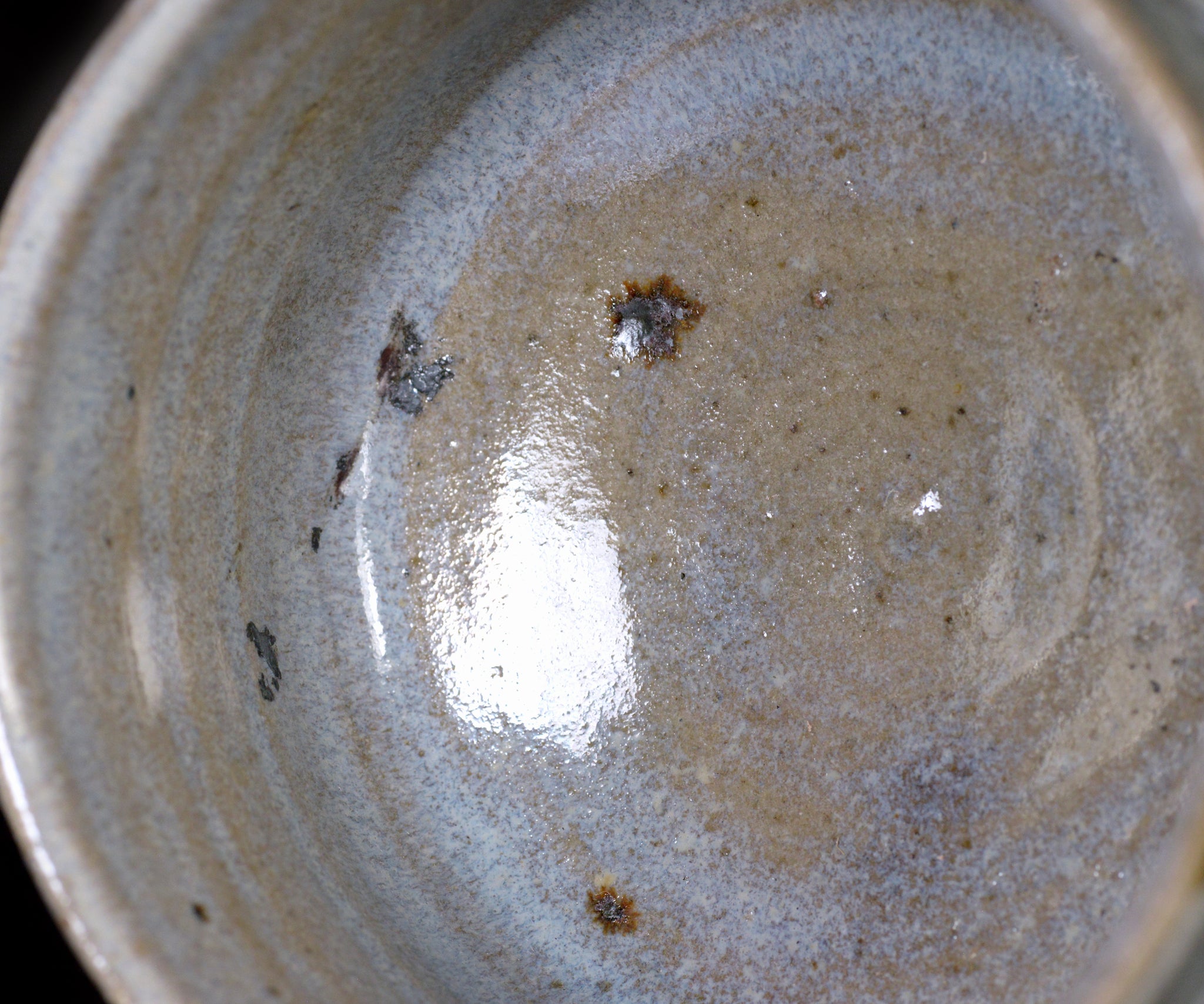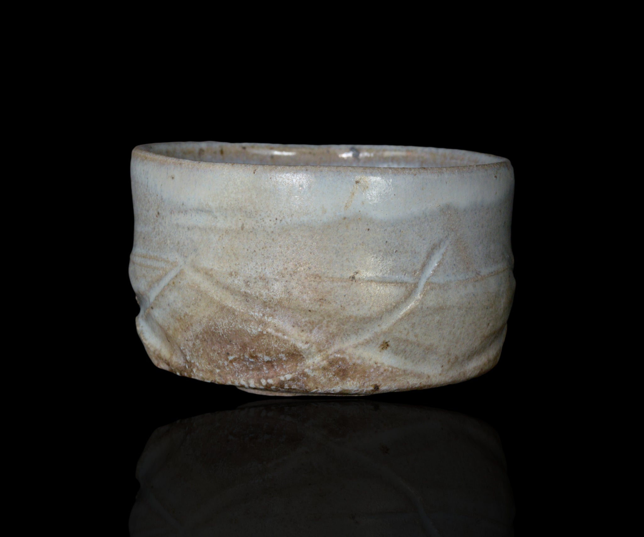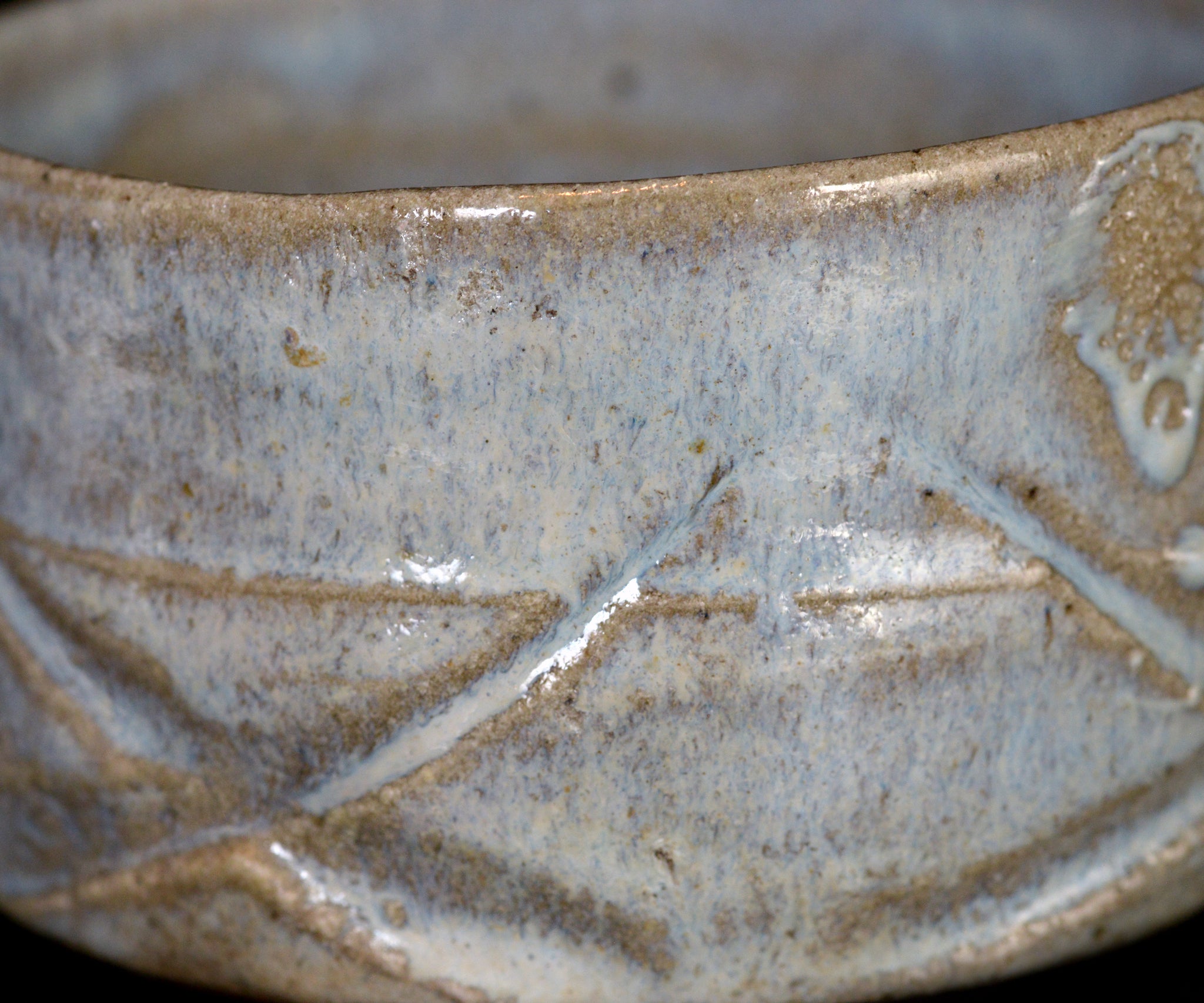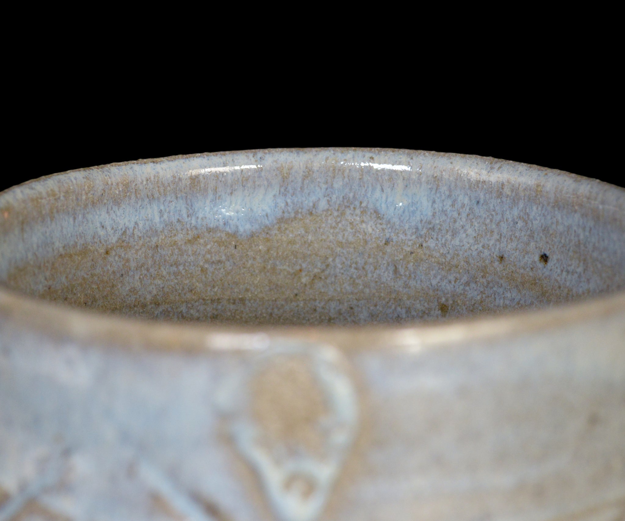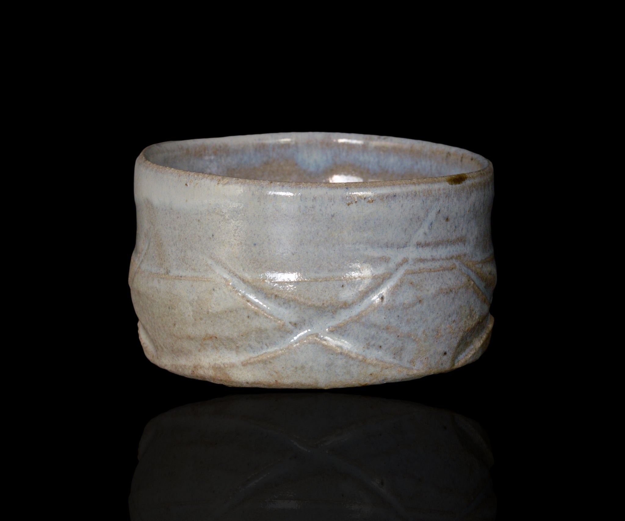 唐津の陶芸家、三藤るいさんの斑唐津茶碗。✗の彫りが施されたボディに白釉が青く変化し、美しい景色を描き出しています。茶碗を回すと、引き落としによるカセや力強い縮れが現れ、その鮮やかなコントラストを堪能できます。口縁から見込みにかけては青が流れ込み、内側にも斑状の窯変がしっかりと表れています。さらに、引き落としによる釉薬の変化と、強火で焼き締められた土味が感じられる高台脇の風合いも大きな見どころ。