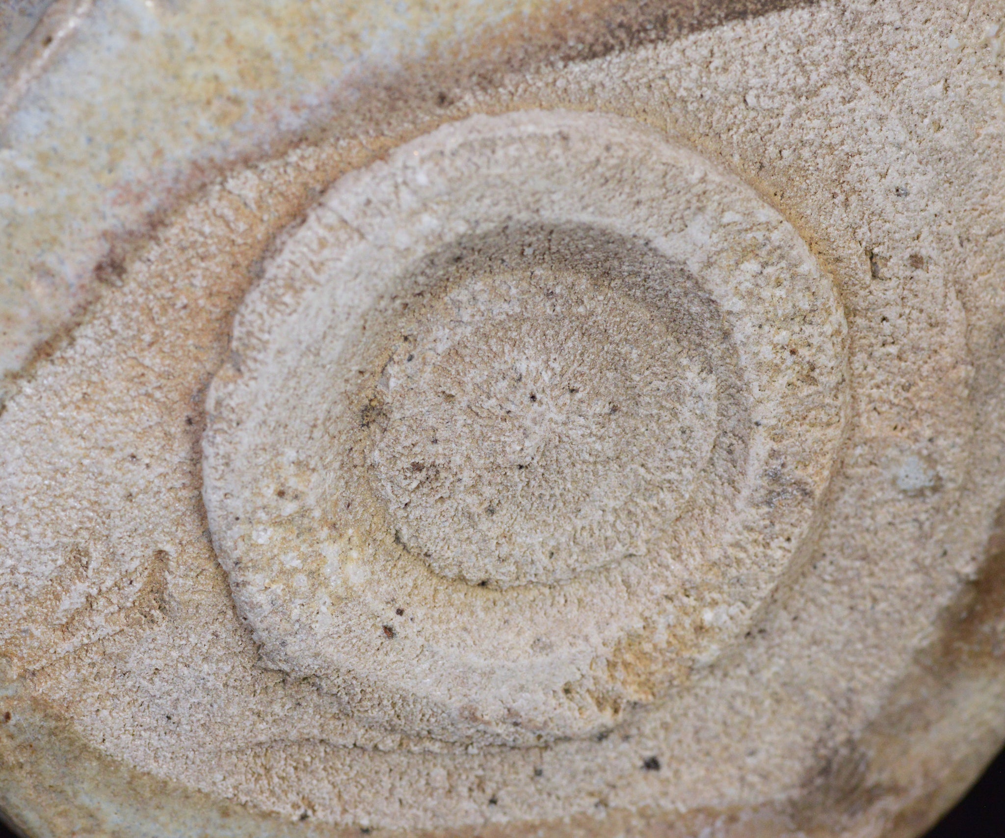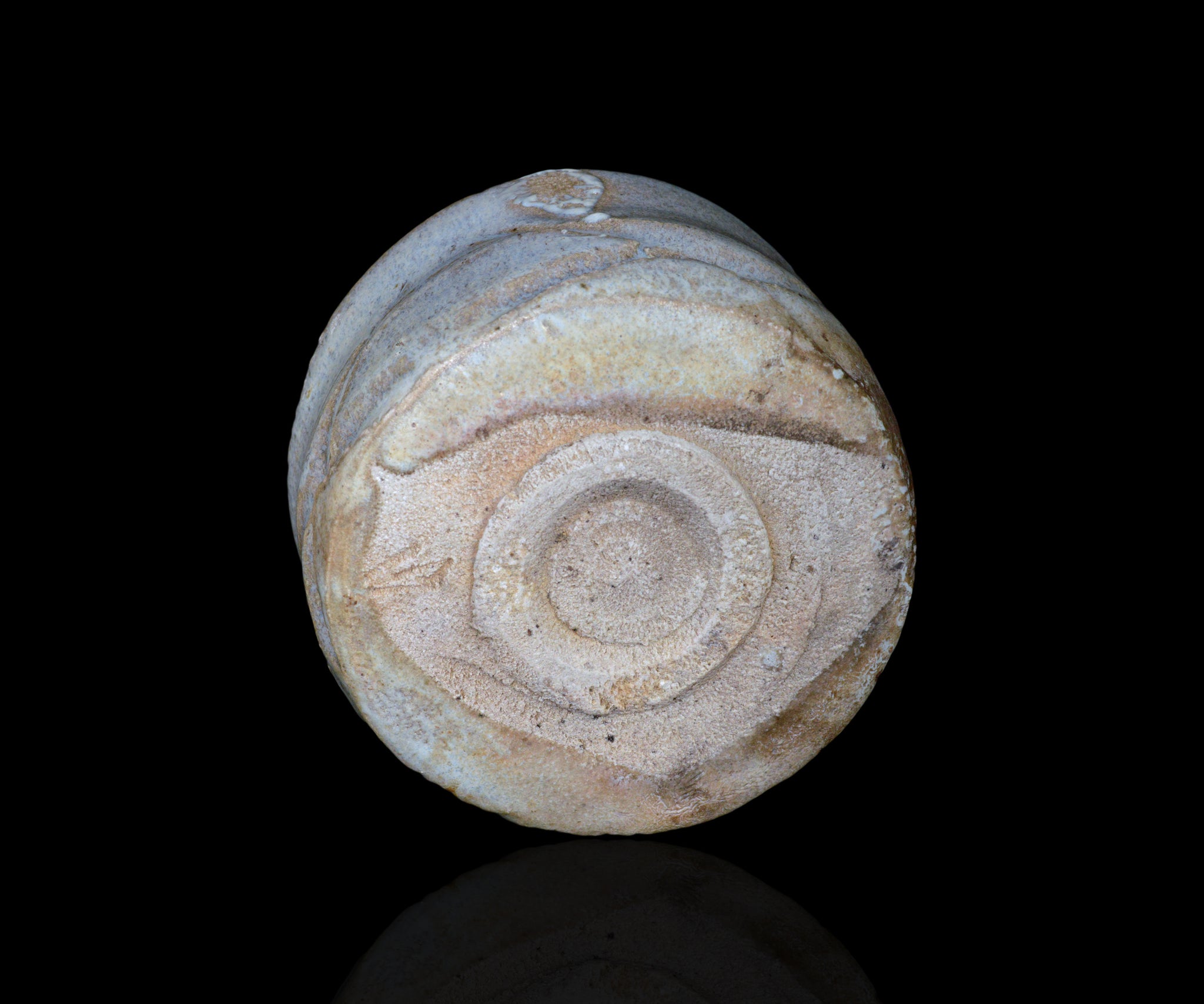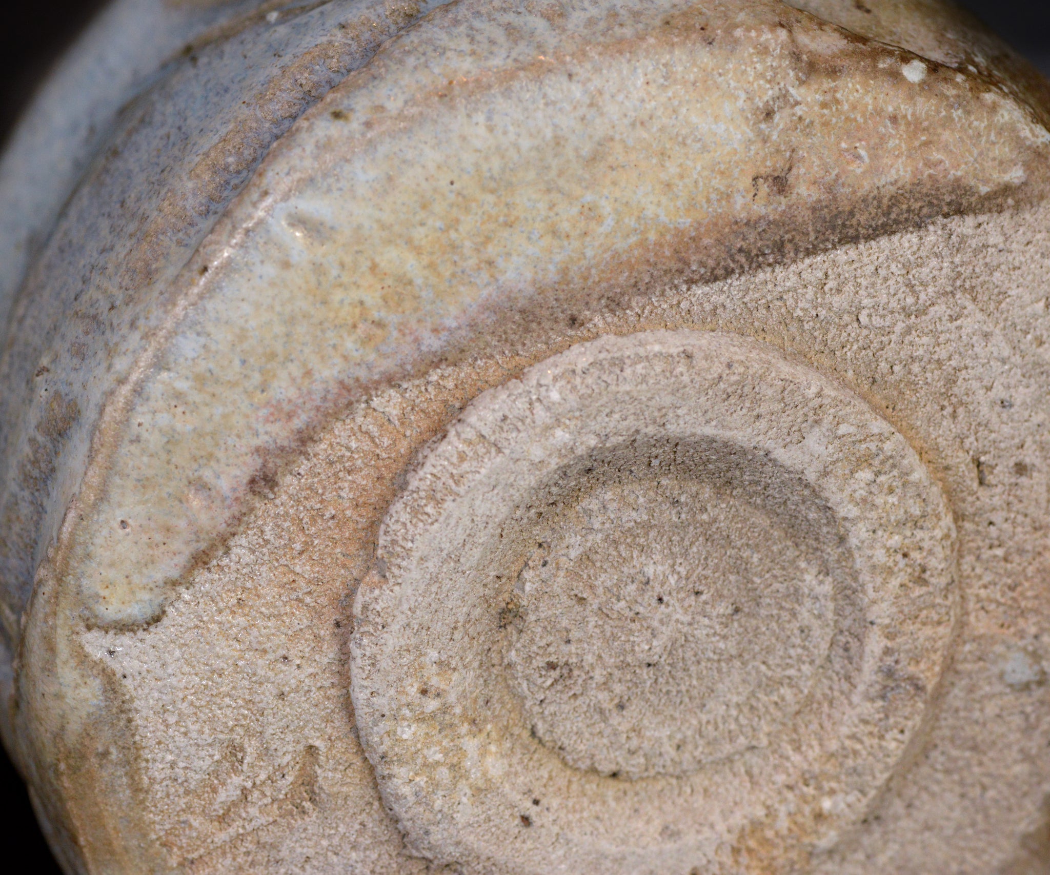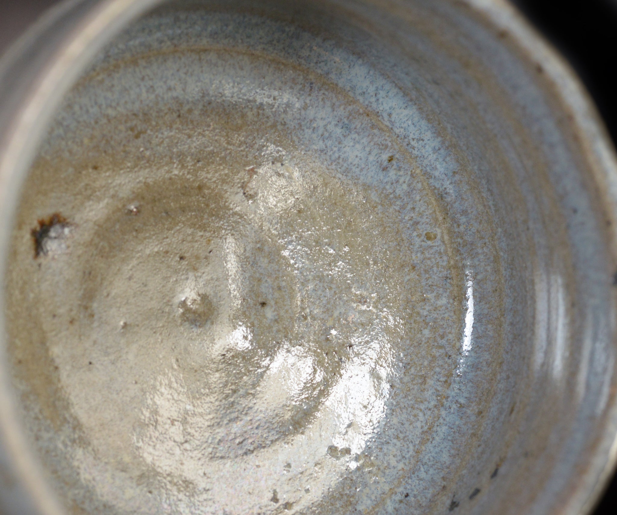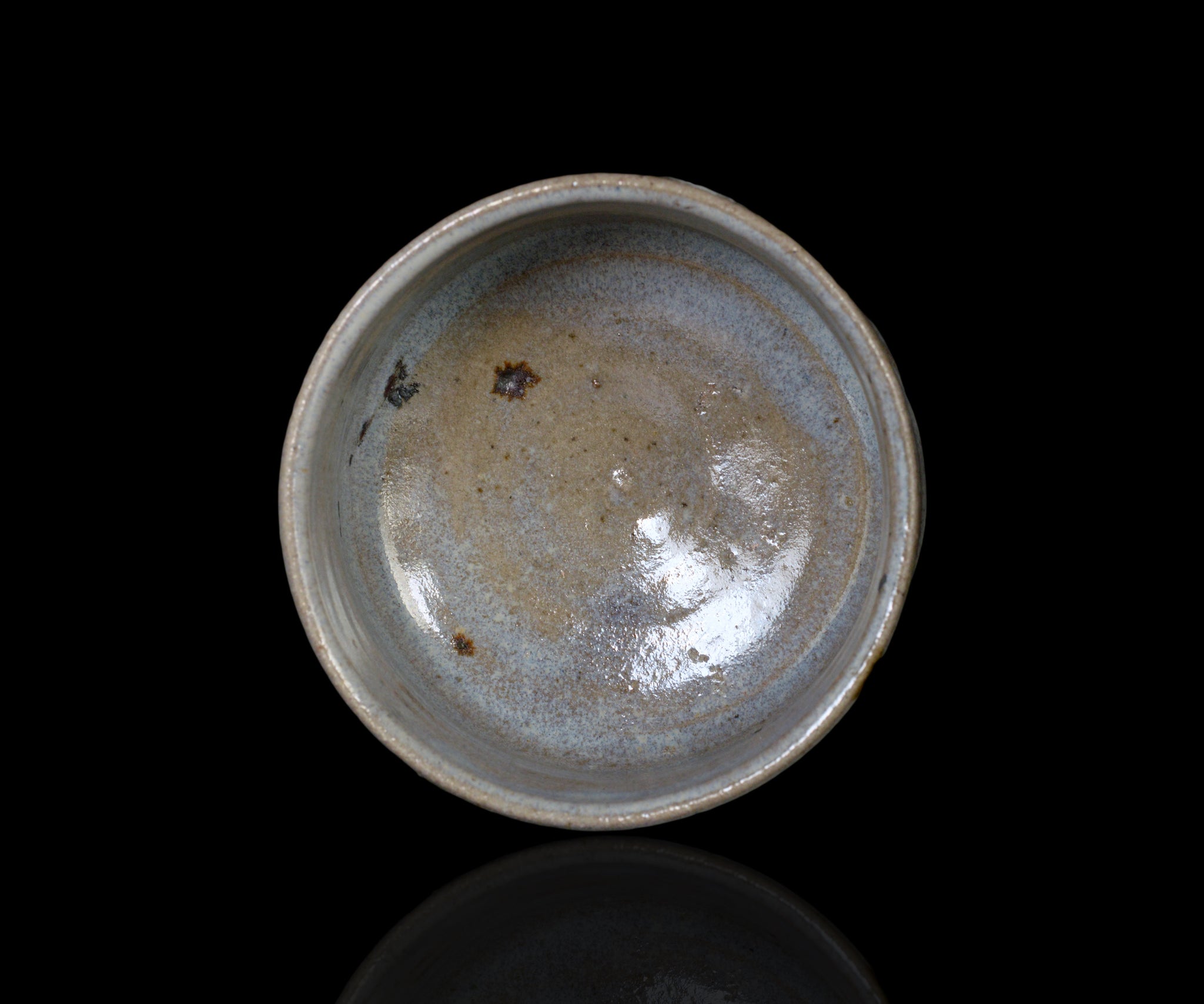 唐津の陶芸家、三藤るいさんの斑唐津茶碗。✗の彫りが施されたボディに白釉が青く変化し、美しい景色を描き出しています。茶碗を回すと、引き落としによるカセや力強い縮れが現れ、その鮮やかなコントラストを堪能できます。口縁から見込みにかけては青が流れ込み、内側にも斑状の窯変がしっかりと表れています。さらに、引き落としによる釉薬の変化と、強火で焼き締められた土味が感じられる高台脇の風合いも大きな見どころ。