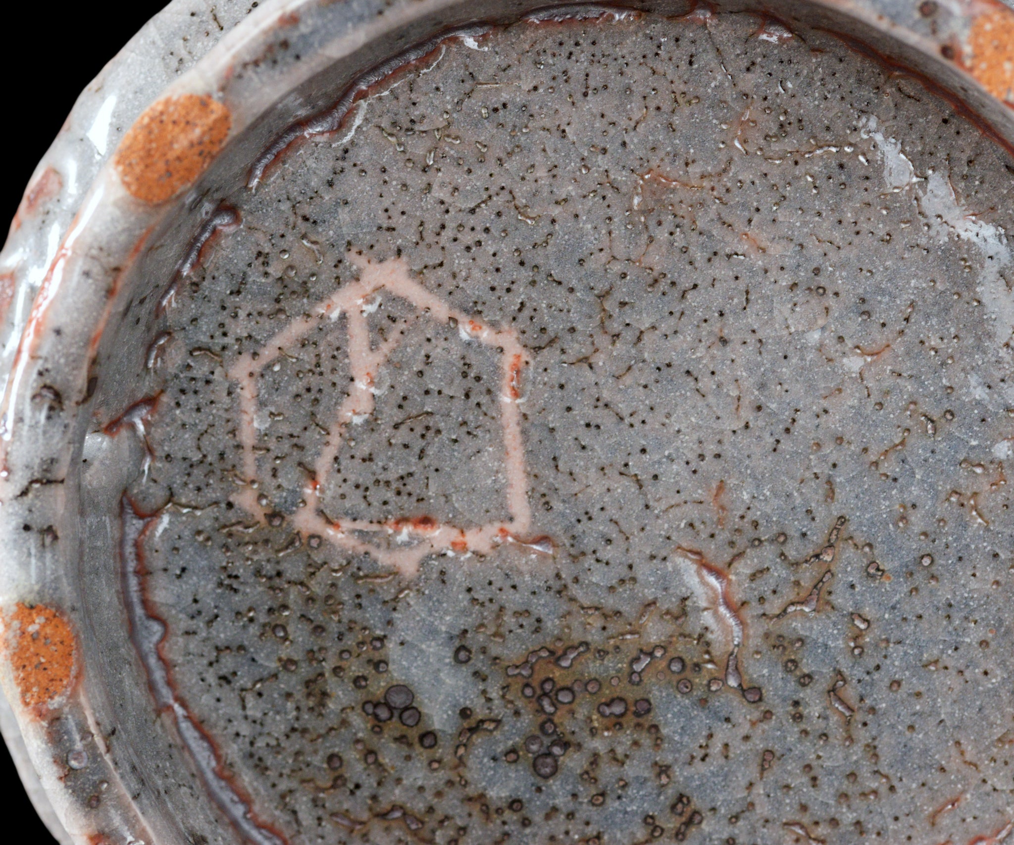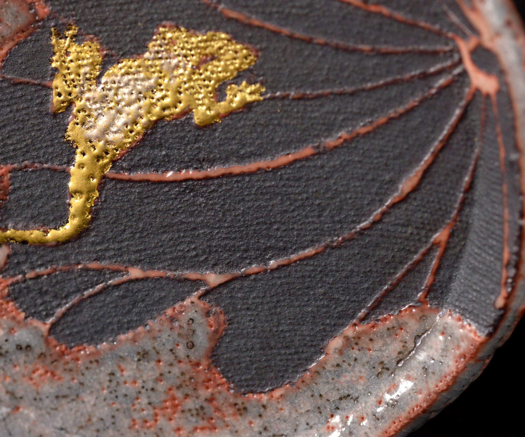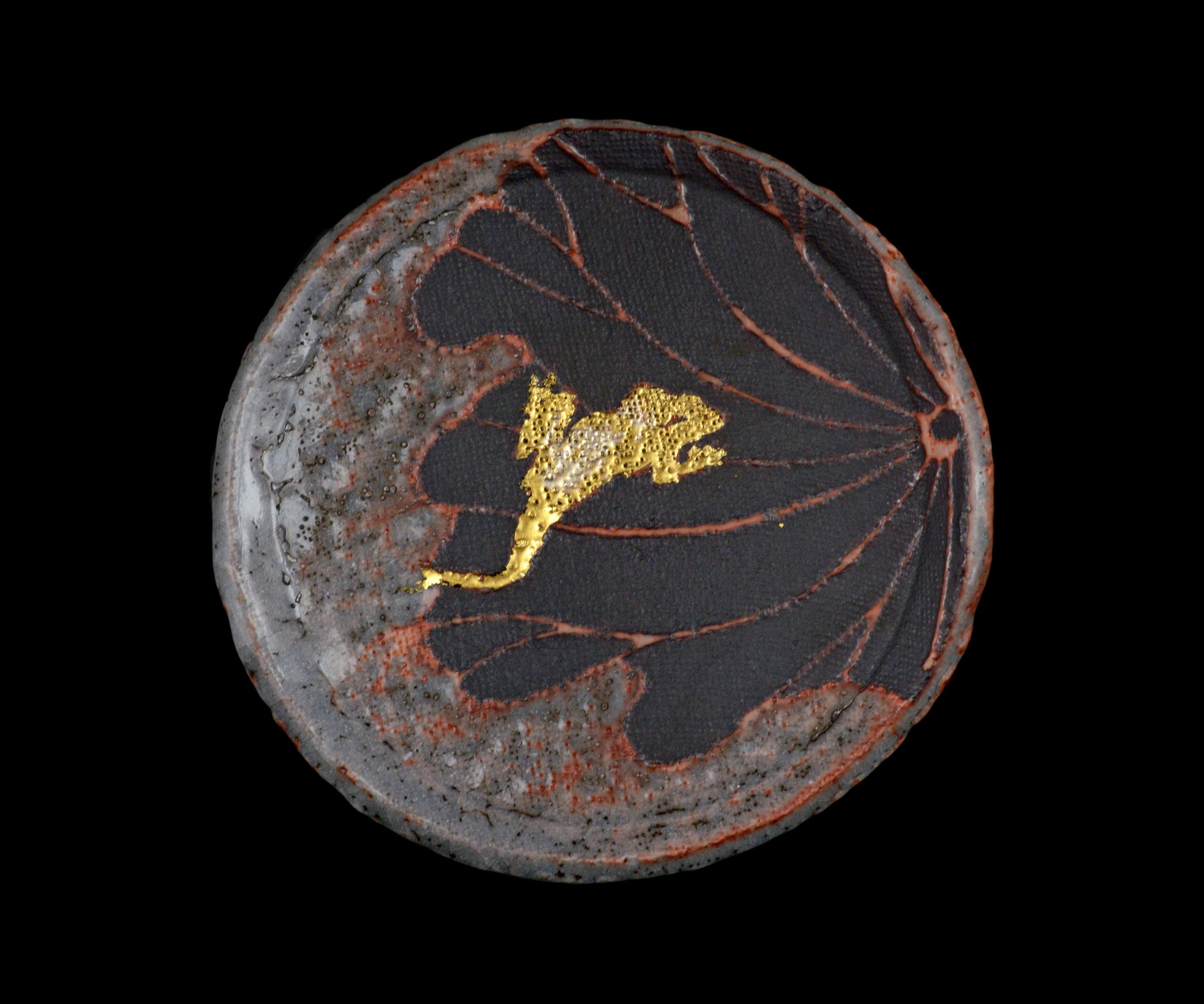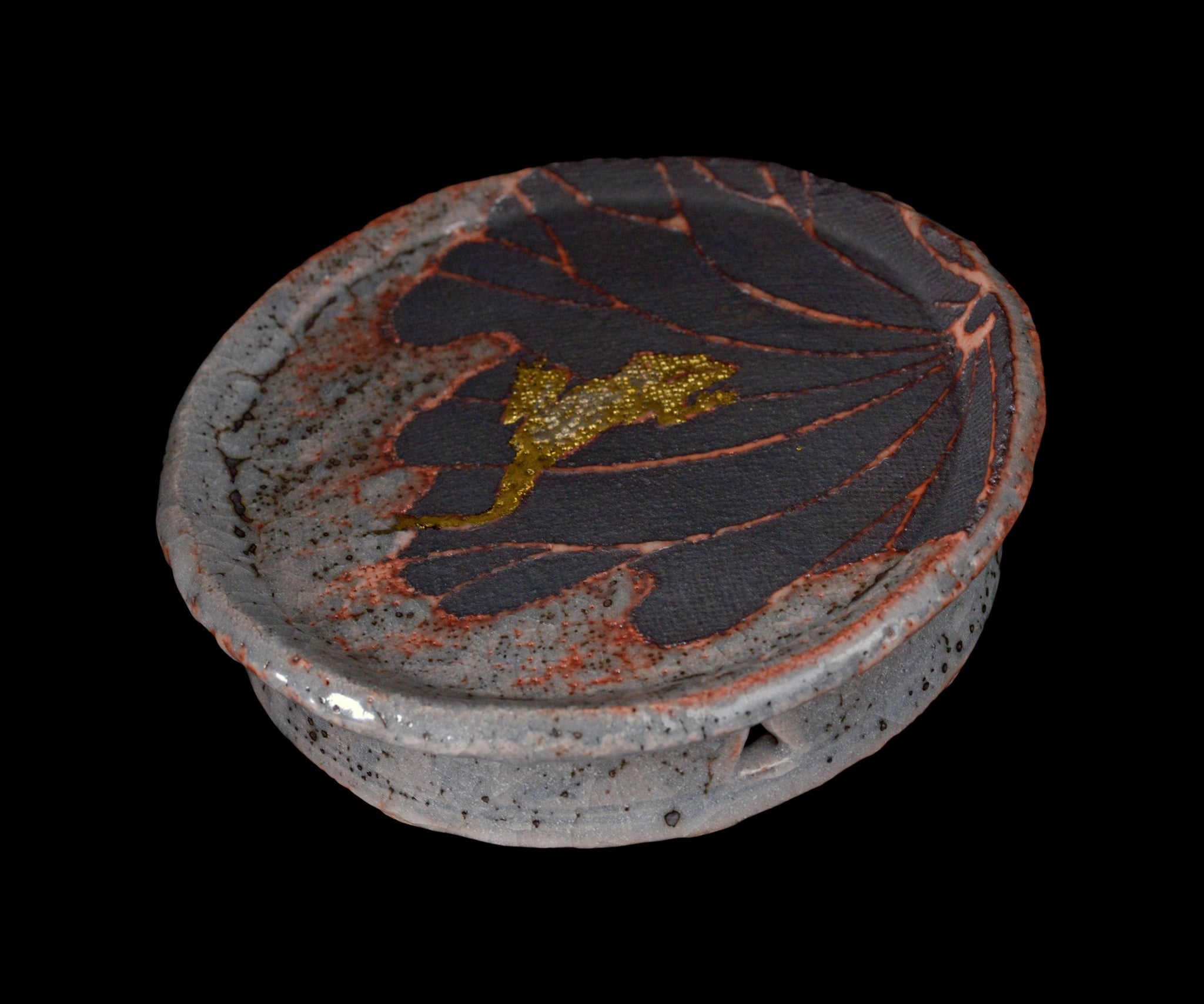 鼡志野のボディに、蓮の歯の上に金のカエルが描かれた台皿作品。古来より「蓮は浄土を象徴し、カエルは再生や循環の象徴」とされてきましたが、その二つを一碗の中で響き合わせることで、清らかさと生命力を同時に表現しています。まさに名工としての卓越した技術と、熟練した作家ならではの想像力が結実した逸品です。