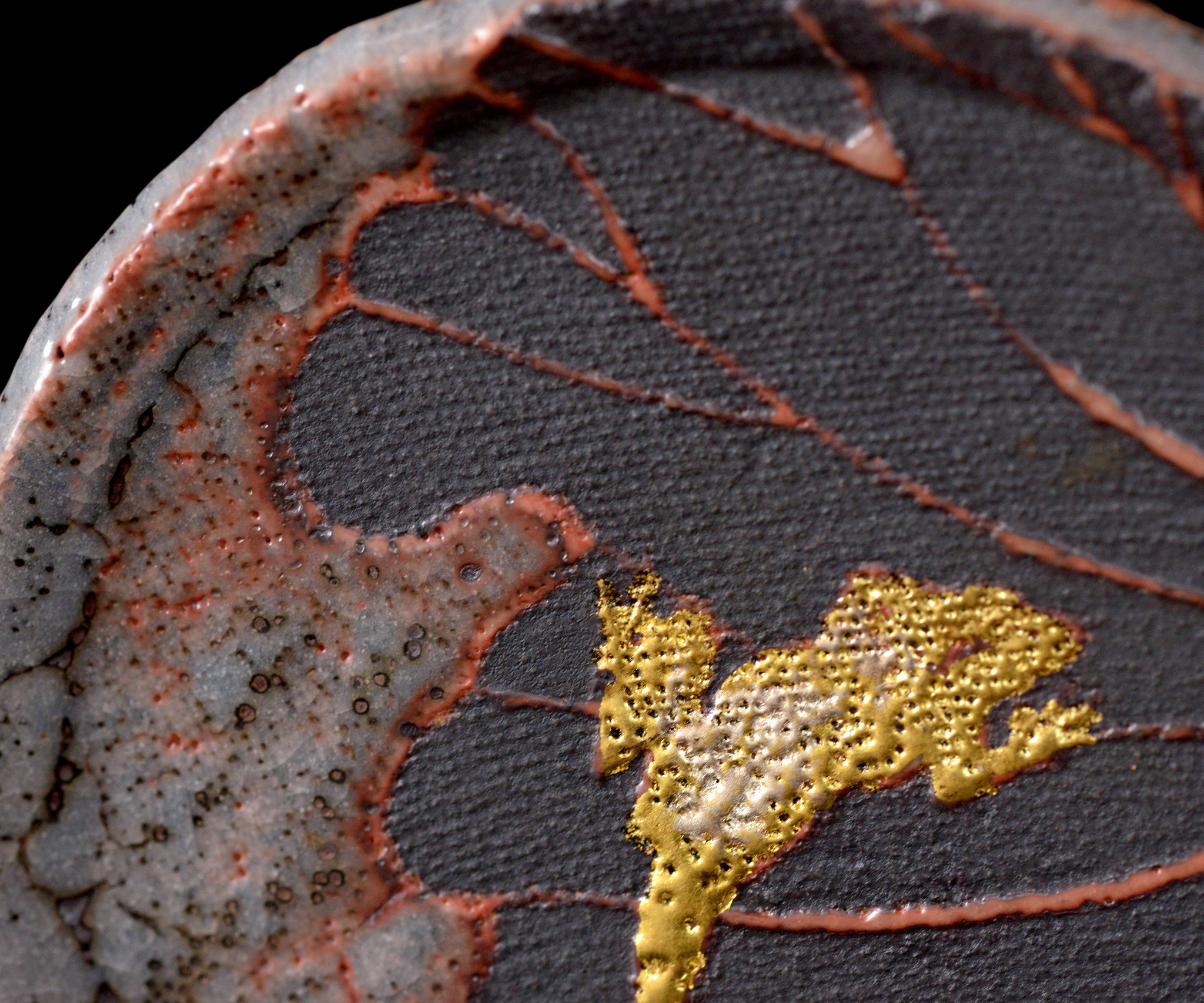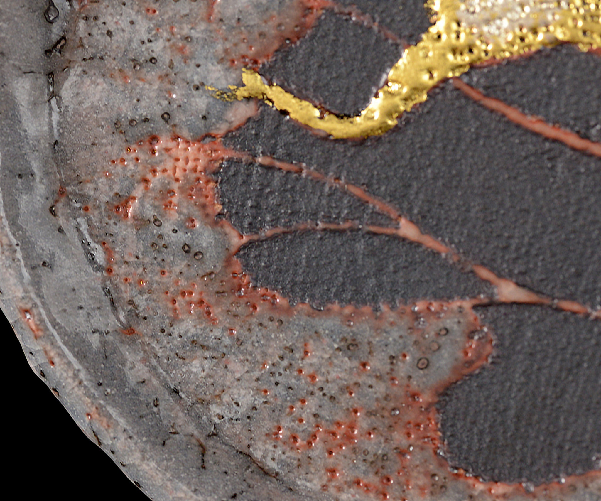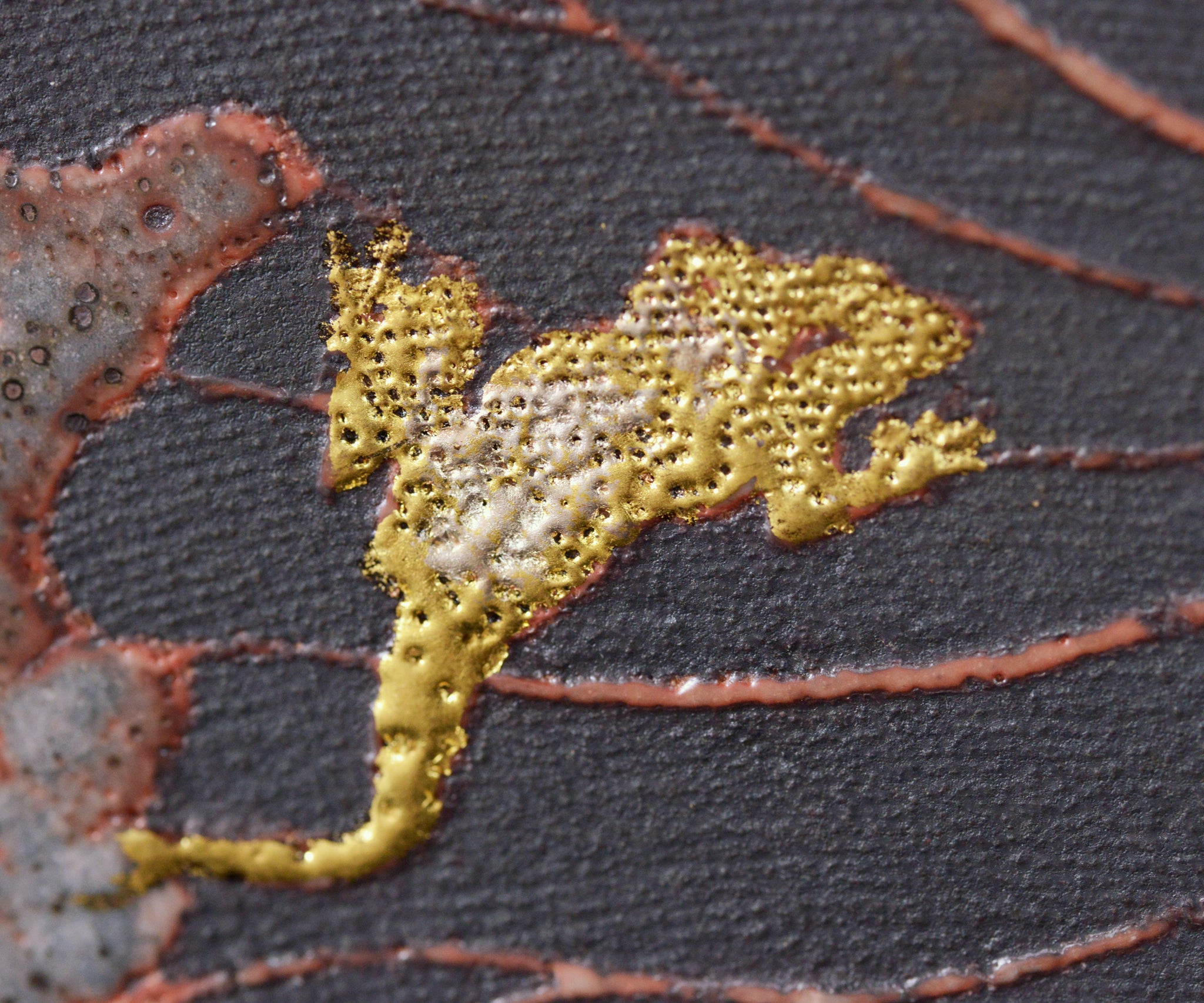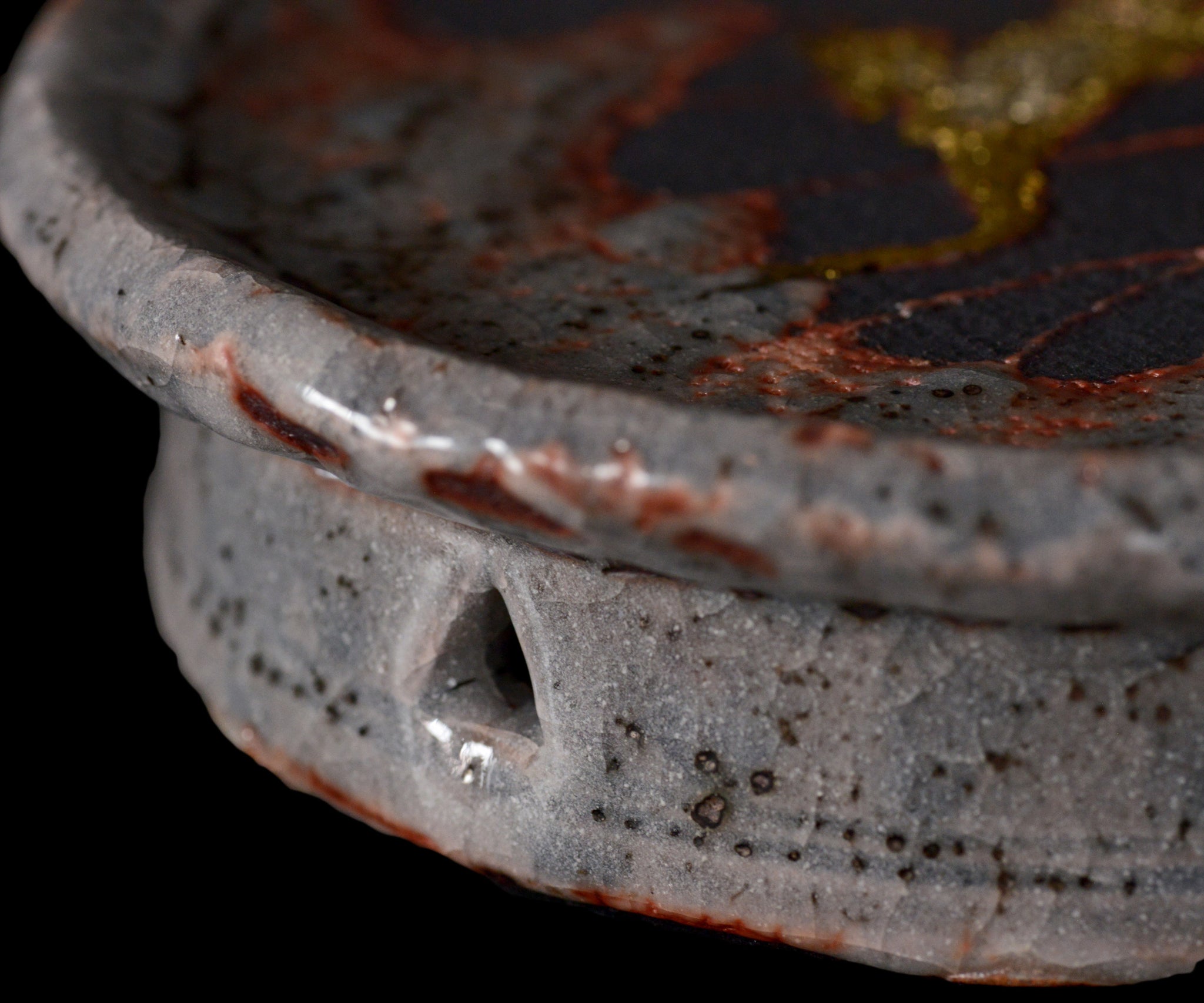 鼡志野のボディに、蓮の歯の上に金のカエルが描かれた台皿作品。古来より「蓮は浄土を象徴し、カエルは再生や循環の象徴」とされてきましたが、その二つを一碗の中で響き合わせることで、清らかさと生命力を同時に表現しています。まさに名工としての卓越した技術と、熟練した作家ならではの想像力が結実した逸品です。